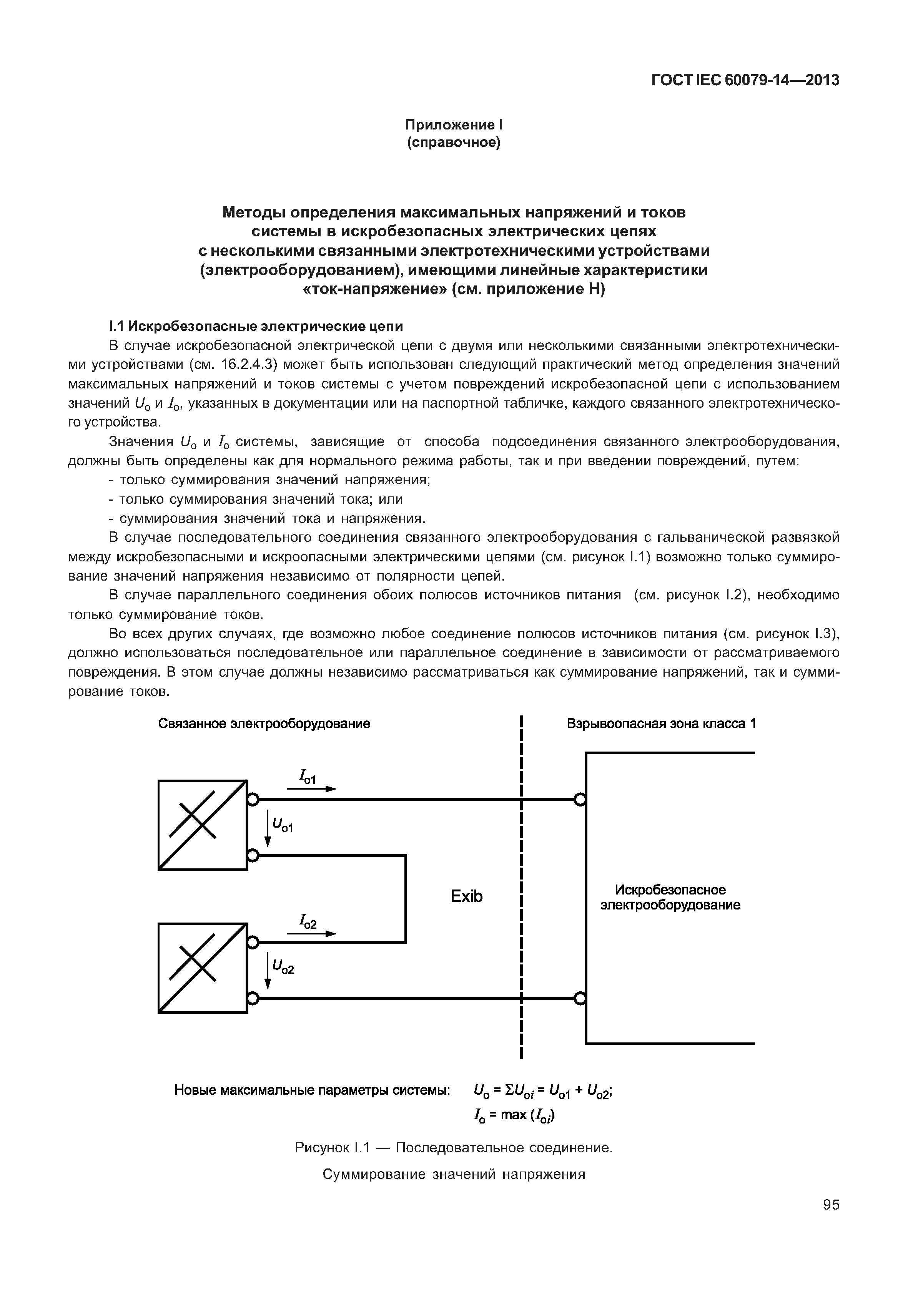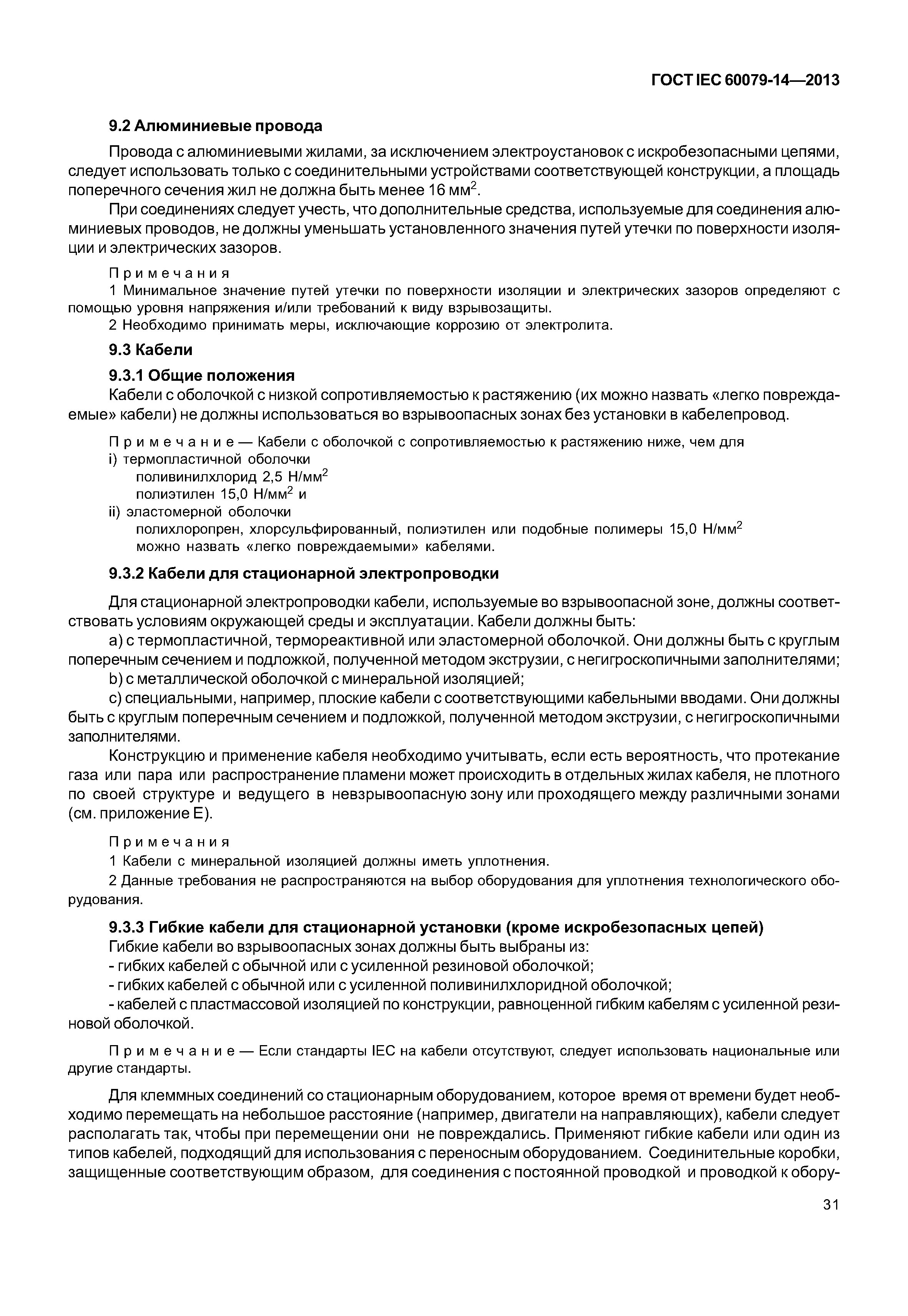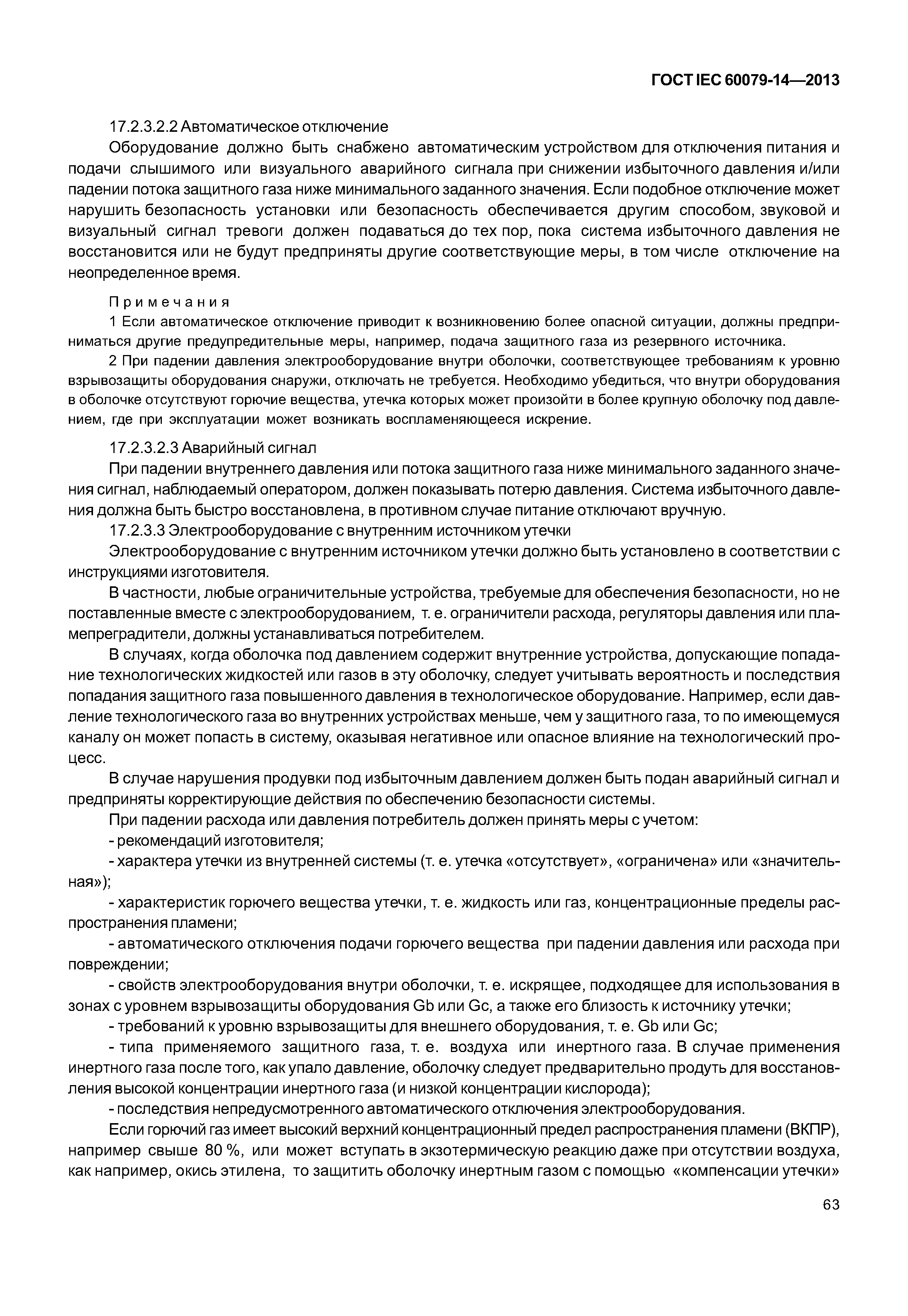 | Оглавление: | 1 Область применения 2 Нормативные ссылки 3 Термины и определения 4 Общие положения 4.1 Общие требования 4.2 Документация 4.3 Первоначальная проверка 4.4 Обеспечение соответствия электрооборудования 4.5 Квалификация персонала 5 Выбор электрооборудования (кроме кабелей и электропроводки в трубах) 5.1 Требования к информации 5.2 Зоны 5.3 Определение уровней взрывозащиты оборудования для зон 5.4 Выбор электрооборудования согласно уровню взрывозащиты электрооборудования 5.5 Выбор электрооборудования согласно классификации оборудования по группам 5.6 Выбор согласно температуре самовоспламенения газа или пара и температуры окружающей среды 5.7 Выбор оборудования, генерирующего излучение 5.8 Выбор оборудования, генерирующего ультразвуковое излучение 5.9 Выбор с учетом внешних воздействий 5.10 Выбор передвижного, переносного оборудования и оборудования персонального применения 5.11 Выбор вращающихся электрических машин 5.12 Светильники 5.13 Соединители 5.14 Элементы и батареи 5.15 Этикетка радиочастотной идентификации 5.16 Газоанализаторы 6 Защита от опасного (воспламеняющего) искрения 6.1 Легкие металлы в качестве конструкционных материалов 6.2 Опасность, которую представляют электрические части под напряжением 6.3 Опасность, которую представляют открытые и сторонние токопроводящие части 6.4 Уравнивание потенциалов 6.5 Статическое электричество 6.6 Молниезащита 6.7 Электромагнитное излучение 6.8 Металлические части с катодной защитой 6.9 Воспламенение, вызванное оптическим излучением 7 Электрическая защита 8 Аварийное отключение и электрическое разъединение 8.1 Общие положения 8.2 Аварийное отключение 8.3 Электрическое разъединение 9 Электропроводка 9.1 Общие положения 9.2 Алюминиевые провода 9.3 Кабели 9.4 Системы электропроводки в трубах 9.5 Кабели и системы электропроводки в трубах 9.6 Требования к установке 10 Устройства кабельных вводов и заглушки 10.1 Общие положения 10.2 Выбор кабельного ввода 10.3 Соединения кабелей с оборудованием 10.4 Дополнительные требования к отверстиям, кроме видов взрывозащиты "d", "t" и "nR" 10.5 Неиспользуемые отверстия 10.6 Дополнительные требования для электрооборудования с взрывозащитой вида "d" — "взрывонепроницаемая оболочка" 10.7 Дополнительные требования к защите вида "t" — защита оболочкой 10.8 Дополнительные требования к виду взрывозащиты "nR" — оболочка с ограниченным пропуском газов 11 Вращающиеся электрические машины 11.1 Общие положения 11.2 Взрывозащита вида "d" — "взрывонепроницаемая оболочка" 11.3 Взрывозащита вида "е" — "повышенная защита" 11.4 Вид взрывозащиты "р" и "рD" — "оболочки под избыточным давлением" 11.5 Вид защиты "t" — Защита оболочками оборудования, питаемых током изменяемой частоты и напряжения 11.6 Вид взрывозащиты "nА" — "неискрящее оборудование" 12 Светильники 13 Системы электронагрева 13.1 Общие положения 13.2 Устройства контроля температуры 13.3 Ограничение температуры 13.4 Защитное устройство 13.5 Системы резистивного распределенного электронагрева 14 Дополнительные требования для электрооборудования с взрывозащитой вида ""d — "взрывонепроницаемая оболочка" 14.1 Общие положения 14.2 Сплошные препятствия 14.3 Защита взрывонепроницаемых соединений 14.4 Системы электропроводки в трубах 15 Дополнительные требования для взрывозащиты вида "е" — "повышенная защита" 15.1 Общие положения 15.2 Максимальная рассеиваемая мощность