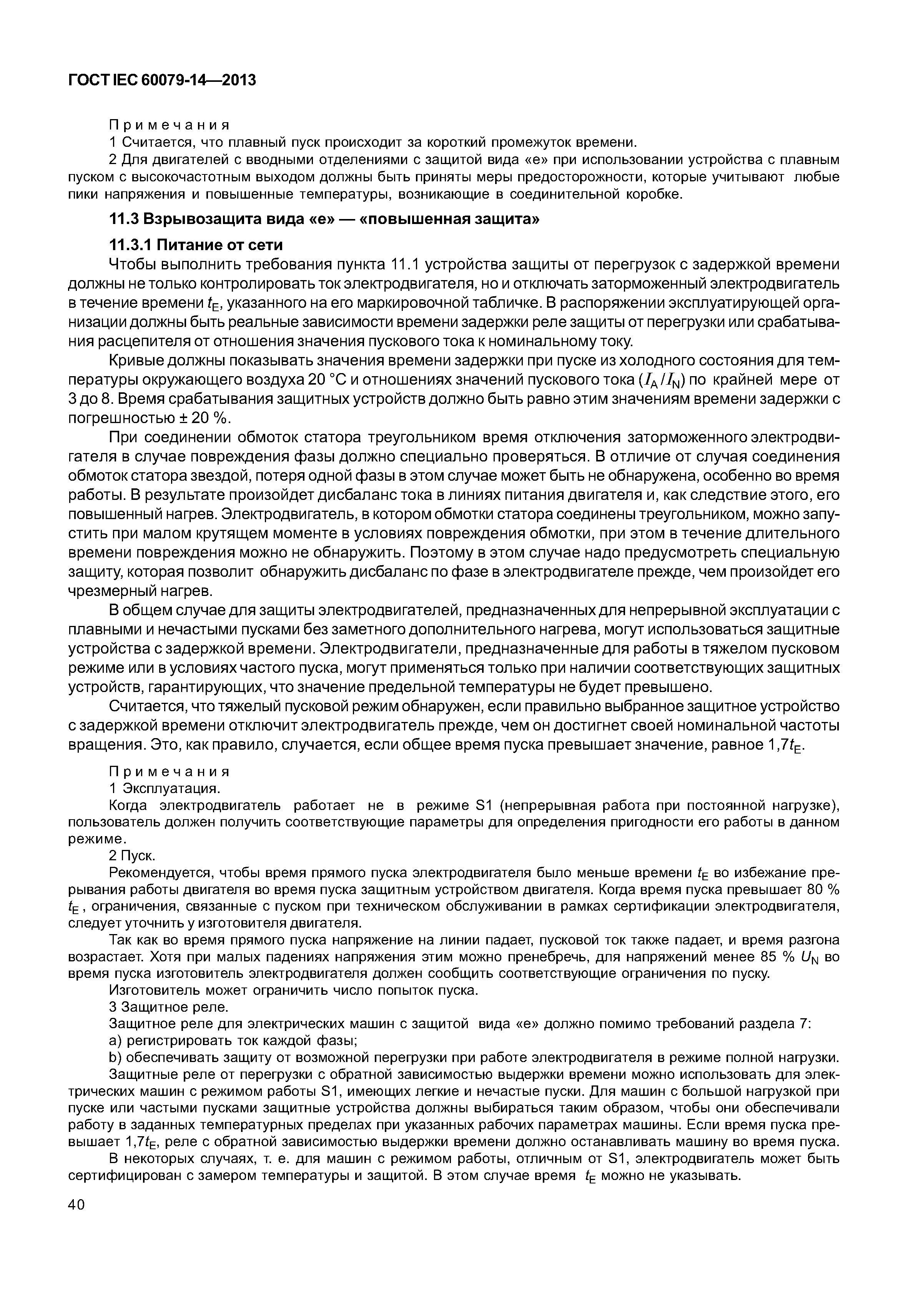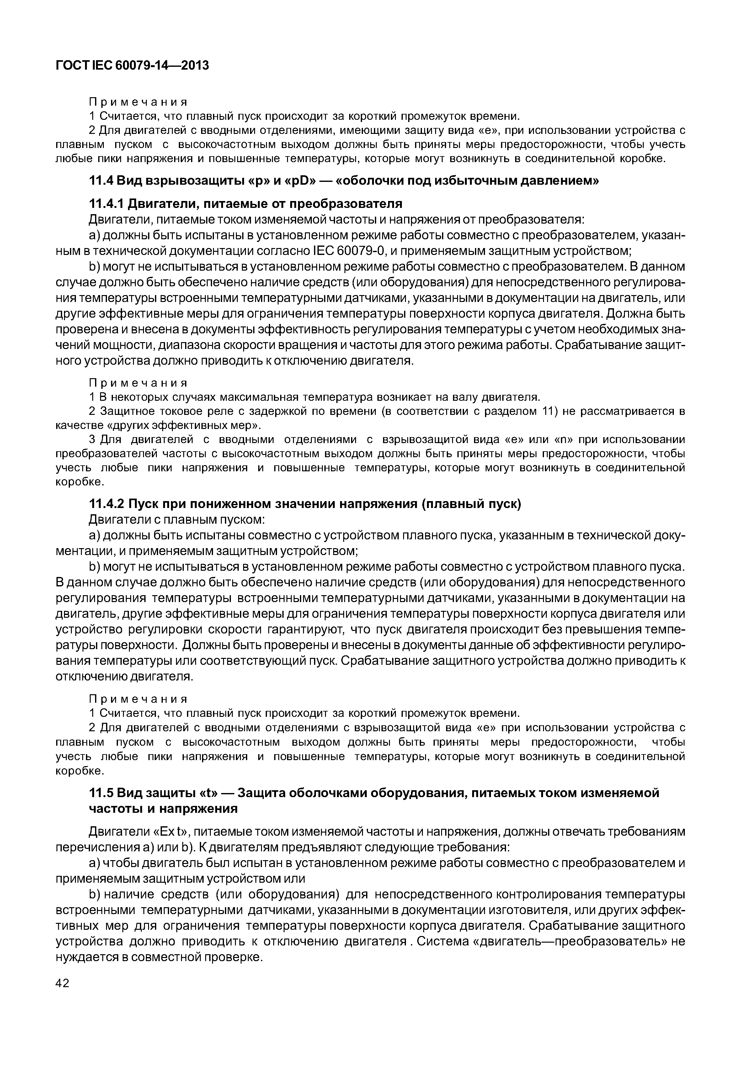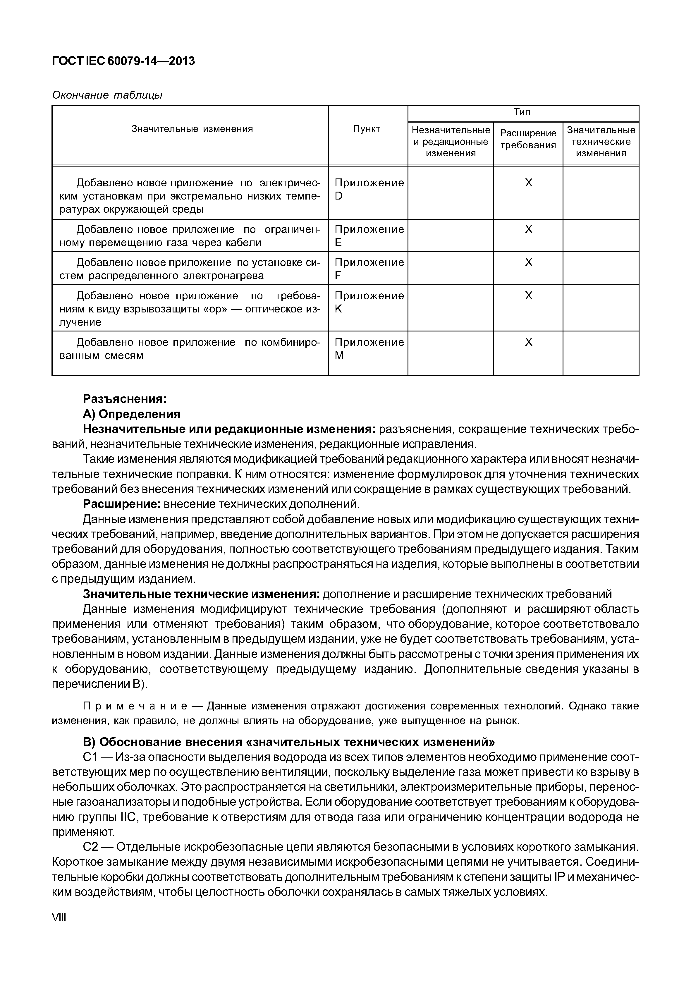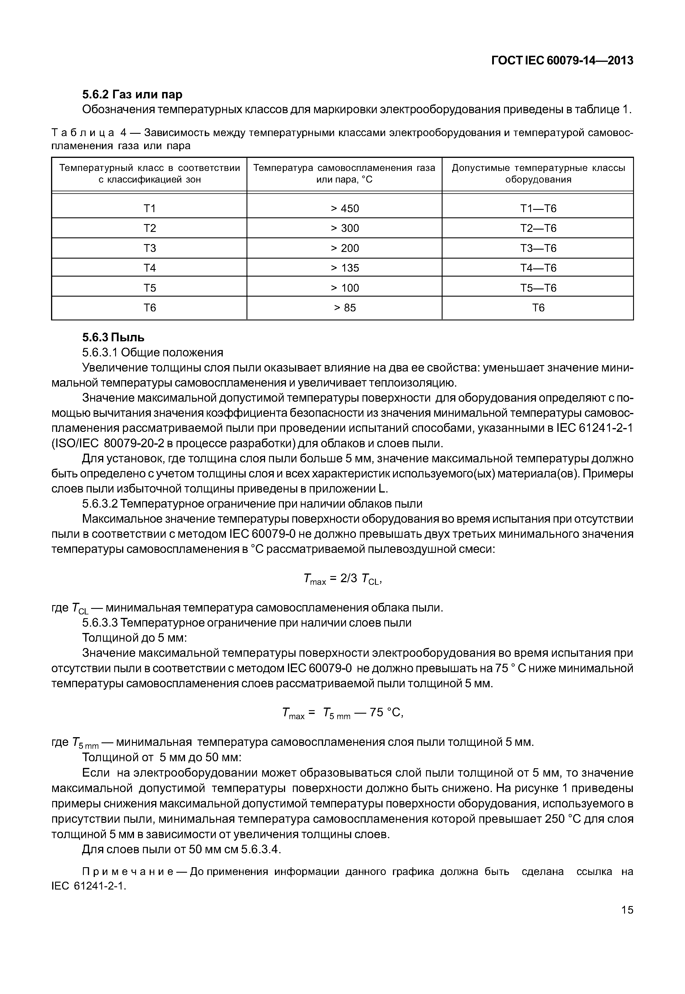 | Оглавление: | 1 Область применения 2 Нормативные ссылки 3 Термины и определения 4 Общие положения 4.1 Общие требования 4.2 Документация 4.3 Первоначальная проверка 4.4 Обеспечение соответствия электрооборудования 4.5 Квалификация персонала 5 Выбор электрооборудования (кроме кабелей и электропроводки в трубах) 5.1 Требования к информации 5.2 Зоны 5.3 Определение уровней взрывозащиты оборудования для зон 5.4 Выбор электрооборудования согласно уровню взрывозащиты электрооборудования 5.5 Выбор электрооборудования согласно классификации оборудования по группам 5.6 Выбор согласно температуре самовоспламенения газа или пара и температуры окружающей среды 5.7 Выбор оборудования, генерирующего излучение 5.8 Выбор оборудования, генерирующего ультразвуковое излучение 5.9 Выбор с учетом внешних воздействий 5.10 Выбор передвижного, переносного оборудования и оборудования персонального применения 5.11 Выбор вращающихся электрических машин 5.12 Светильники 5.13 Соединители 5.14 Элементы и батареи 5.15 Этикетка радиочастотной идентификации 5.16 Газоанализаторы 6 Защита от опасного (воспламеняющего) искрения 6.1 Легкие металлы в качестве конструкционных материалов 6.2 Опасность, которую представляют электрические части под напряжением 6.3 Опасность, которую представляют открытые и сторонние токопроводящие части 6.4 Уравнивание потенциалов 6.5 Статическое электричество 6.6 Молниезащита 6.7 Электромагнитное излучение 6.8 Металлические части с катодной защитой 6.9 Воспламенение, вызванное оптическим излучением 7 Электрическая защита 8 Аварийное отключение и электрическое разъединение 8.1 Общие положения 8.2 Аварийное отключение 8.3 Электрическое разъединение 9 Электропроводка 9.1 Общие положения 9.2 Алюминиевые провода 9.3 Кабели 9.4 Системы электропроводки в трубах 9.5 Кабели и системы электропроводки в трубах 9.6 Требования к установке 10 Устройства кабельных вводов и заглушки 10.1 Общие положения 10.2 Выбор кабельного ввода 10.3 Соединения кабелей с оборудованием 10.4 Дополнительные требования к отверстиям, кроме видов взрывозащиты "d", "t" и "nR" 10.5 Неиспользуемые отверстия 10.6 Дополнительные требования для электрооборудования с взрывозащитой вида "d" — "взрывонепроницаемая оболочка" 10.7 Дополнительные требования к защите вида "t" — защита оболочкой 10.8 Дополнительные требования к виду взрывозащиты "nR" — оболочка с ограниченным пропуском газов 11 Вращающиеся электрические машины 11.1 Общие положения 11.2 Взрывозащита вида "d" — "взрывонепроницаемая оболочка" 11.3 Взрывозащита вида "е" — "повышенная защита" 11.4 Вид взрывозащиты "р" и "рD" — "оболочки под избыточным давлением" 11.5 Вид защиты "t" — Защита оболочками оборудования, питаемых током изменяемой частоты и напряжения 11.6 Вид взрывозащиты "nА" — "неискрящее оборудование" 12 Светильники 13 Системы электронагрева 13.1 Общие положения 13.2 Устройства контроля температуры 13.3 Ограничение температуры 13.4 Защитное устройство 13.5 Системы резистивного распределенного электронагрева 14 Дополнительные требования для электрооборудования с взрывозащитой вида ""d — "взрывонепроницаемая оболочка" 14.1 Общие положения 14.2 Сплошные препятствия 14.3 Защита взрывонепроницаемых соединений 14.4 Системы электропроводки в трубах 15 Дополнительные требования для взрывозащиты вида "е" — "повышенная защита" 15.1 Общие положения 15.2 Максимальная рассеиваемая мощность