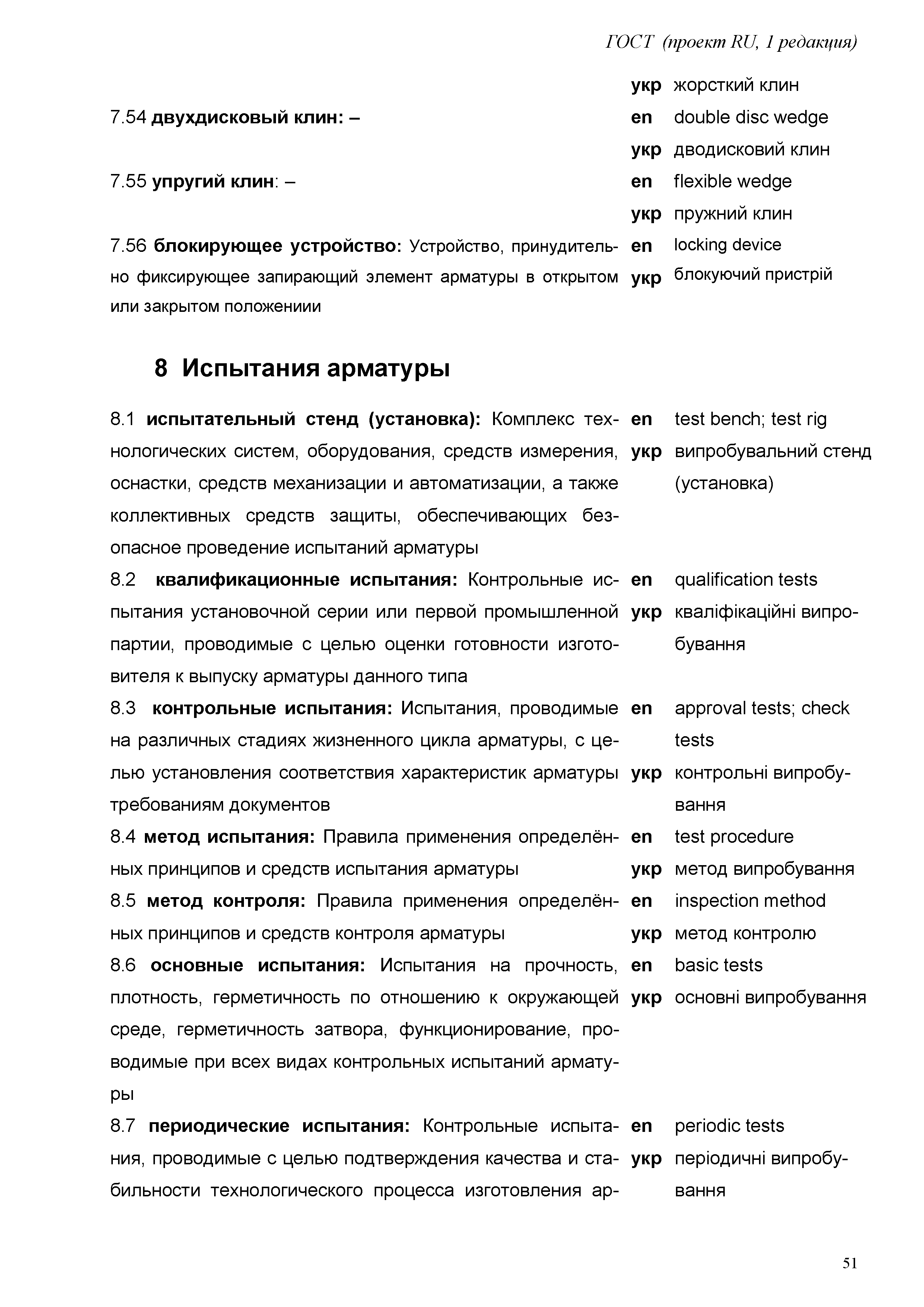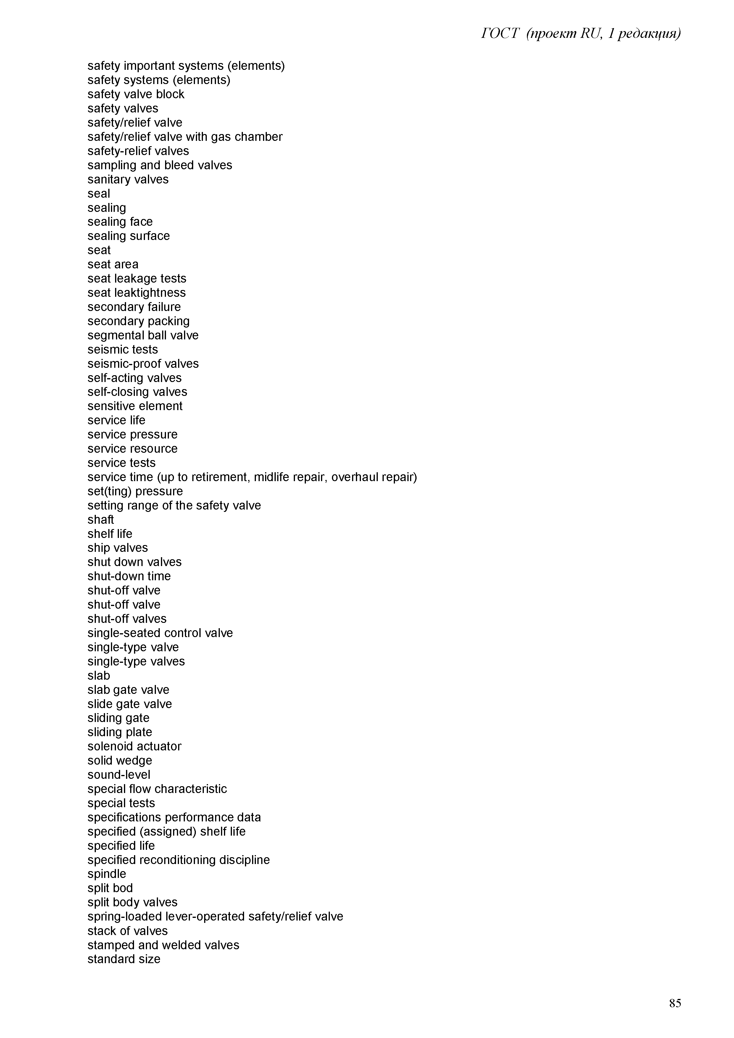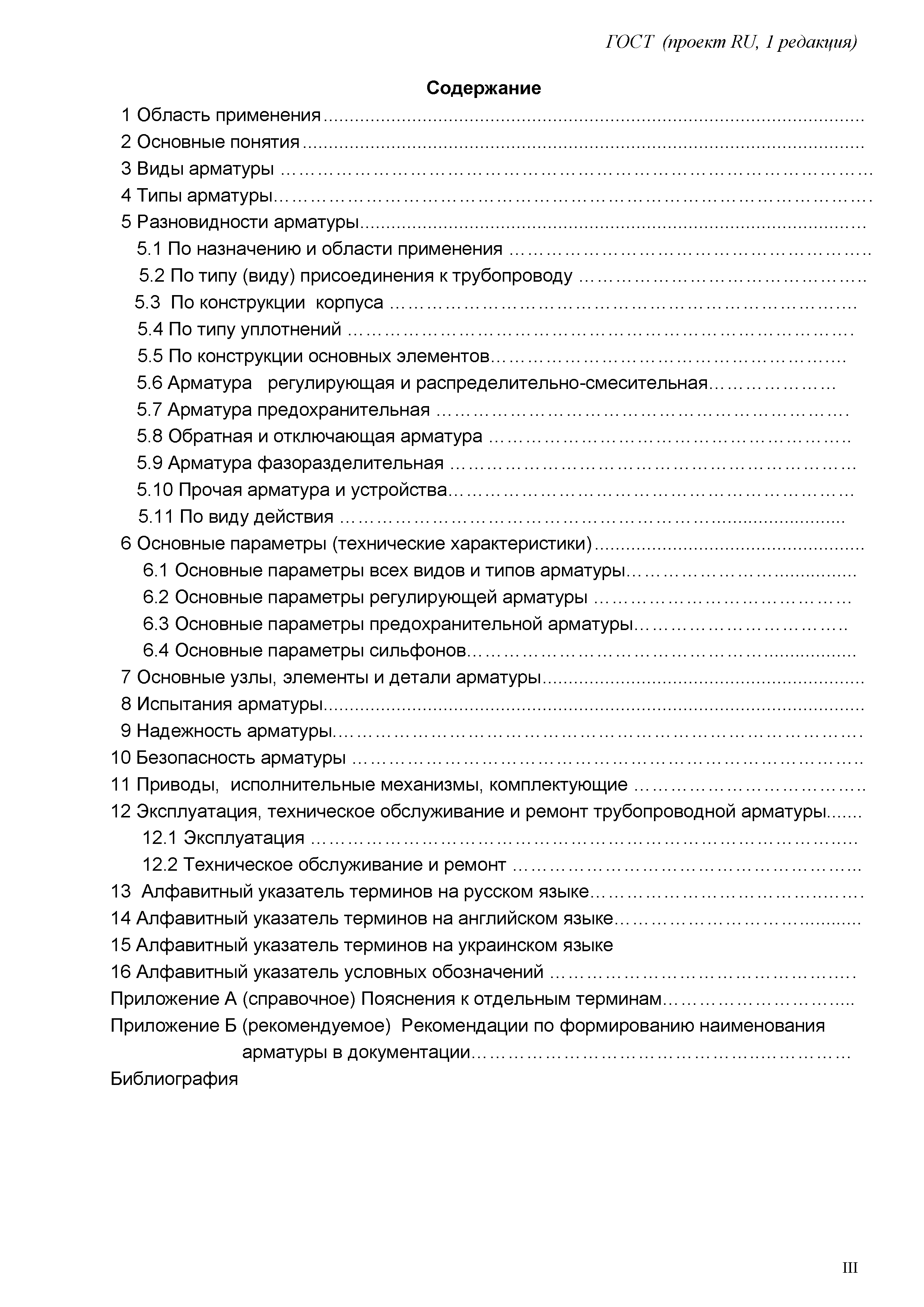 | Оглавление: | 1 Область применения 2 Основные понятия 3 Виды арматуры 4 Типы арматуры 5 Разновидности арматуры 5.1 По назначению и области применения 5.2 По типу (виду) присоединения к трубопроводу 5.3 По конструкции корпуса 5.4 По типу уплотнений 5.5 По конструкции основных элементов 5.6 Арматура регулирующая и распределительно-смесительная 5.7 Арматура предохранительная 5.8 Обратная и отключающая арматура 5.9 Арматура фазоразделительная 5.10 Прочая арматура и устройства 5.11 По виду действия 6 Основные параметры (технические характеристики) 6.1 Основные параметры всех видов и типов арматуры 6.2 Основные параметры регулирующей арматуры 6.3 Основные параметры предохранительной арматуры 6.4 Основные параметры сильфонов 7 Основные узлы, элементы и детали арматуры 8 Испытания арматуры 9 Надежность арматуры 10 Безопасность арматуры 11 Приводы, исполнительные механизмы, комплектующие 12 Эксплуатация, техническое обслуживание и ремонт трубопроводной арматуры 12.1 Эксплуатация 12.2 Техническое обслуживание и ремонт 13 Алфавитный указатель терминов на русском языке 14 Алфавитный указатель терминов на английском языке 15 Алфавитный указатель терминов на украинском языке 16 Алфавитный указатель условных обозначений Приложение А (справочное) Пояснения к отдельным терминам Приложение Б (рекомендуемое) Рекомендации по формированию наименования арматуры в документации Библиография |