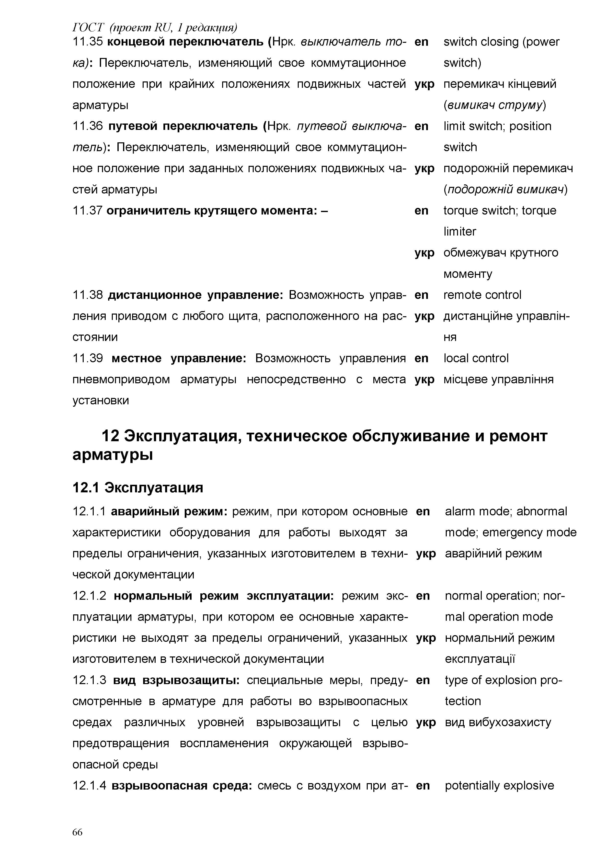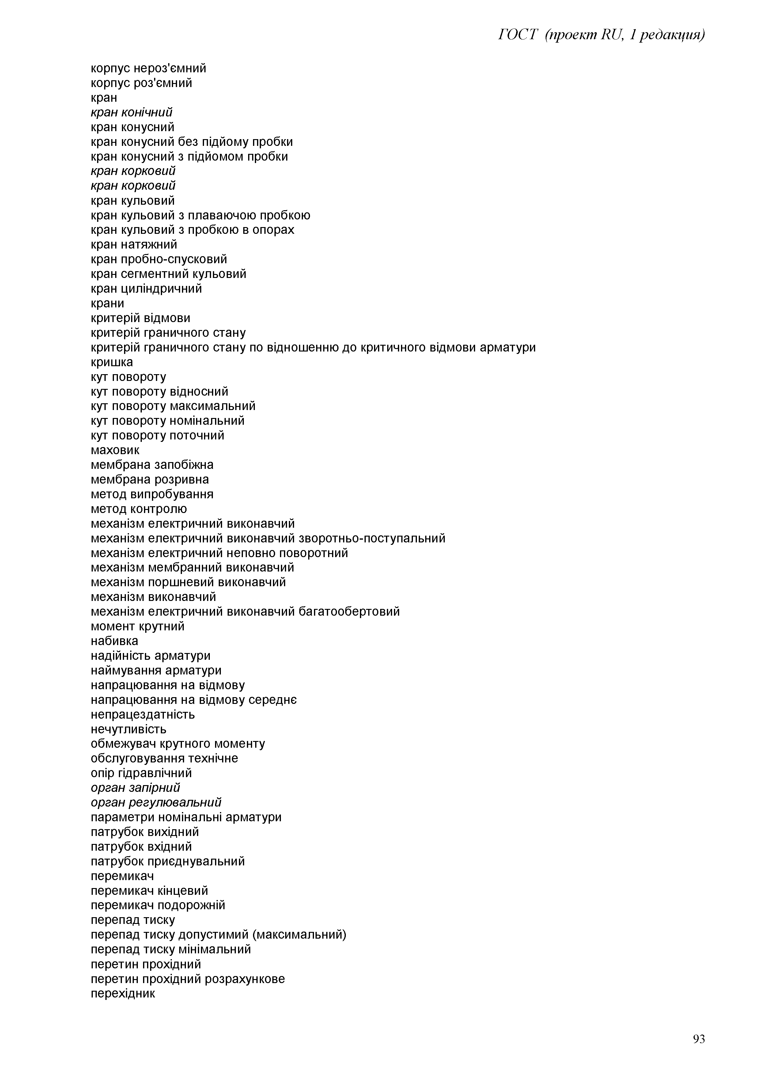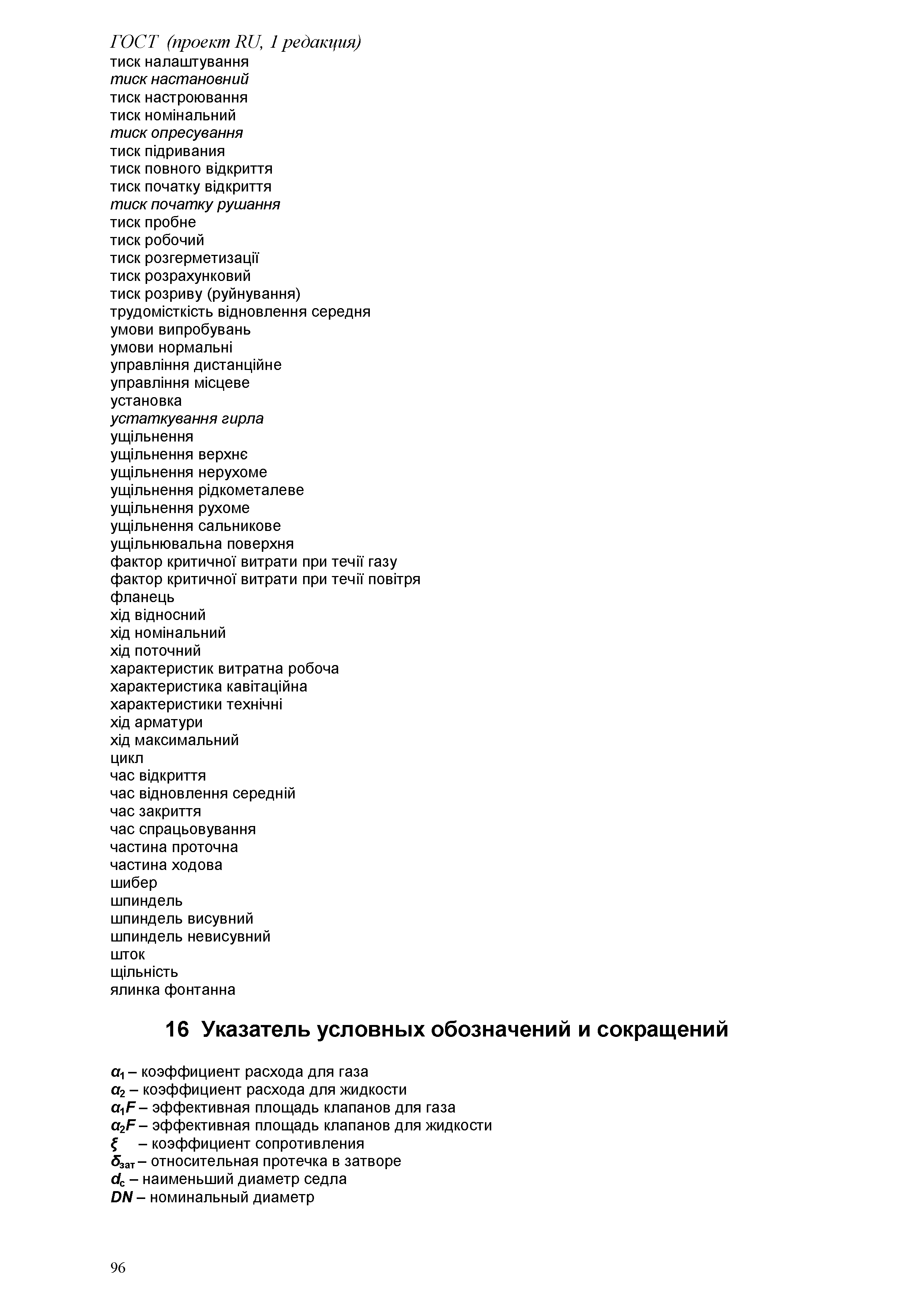 | Оглавление: | 1 Область применения 2 Основные понятия 3 Виды арматуры 4 Типы арматуры 5 Разновидности арматуры 5.1 По назначению и области применения 5.2 По типу (виду) присоединения к трубопроводу 5.3 По конструкции корпуса 5.4 По типу уплотнений 5.5 По конструкции основных элементов 5.6 Арматура регулирующая и распределительно-смесительная 5.7 Арматура предохранительная 5.8 Обратная и отключающая арматура 5.9 Арматура фазоразделительная 5.10 Прочая арматура и устройства 5.11 По виду действия 6 Основные параметры (технические характеристики) 6.1 Основные параметры всех видов и типов арматуры 6.2 Основные параметры регулирующей арматуры 6.3 Основные параметры предохранительной арматуры 6.4 Основные параметры сильфонов 7 Основные узлы, элементы и детали арматуры 8 Испытания арматуры 9 Надежность арматуры 10 Безопасность арматуры 11 Приводы, исполнительные механизмы, комплектующие 12 Эксплуатация, техническое обслуживание и ремонт трубопроводной арматуры 12.1 Эксплуатация 12.2 Техническое обслуживание и ремонт 13 Алфавитный указатель терминов на русском языке 14 Алфавитный указатель терминов на английском языке 15 Алфавитный указатель терминов на украинском языке 16 Алфавитный указатель условных обозначений Приложение А (справочное) Пояснения к отдельным терминам Приложение Б (рекомендуемое) Рекомендации по формированию наименования арматуры в документации Библиография |