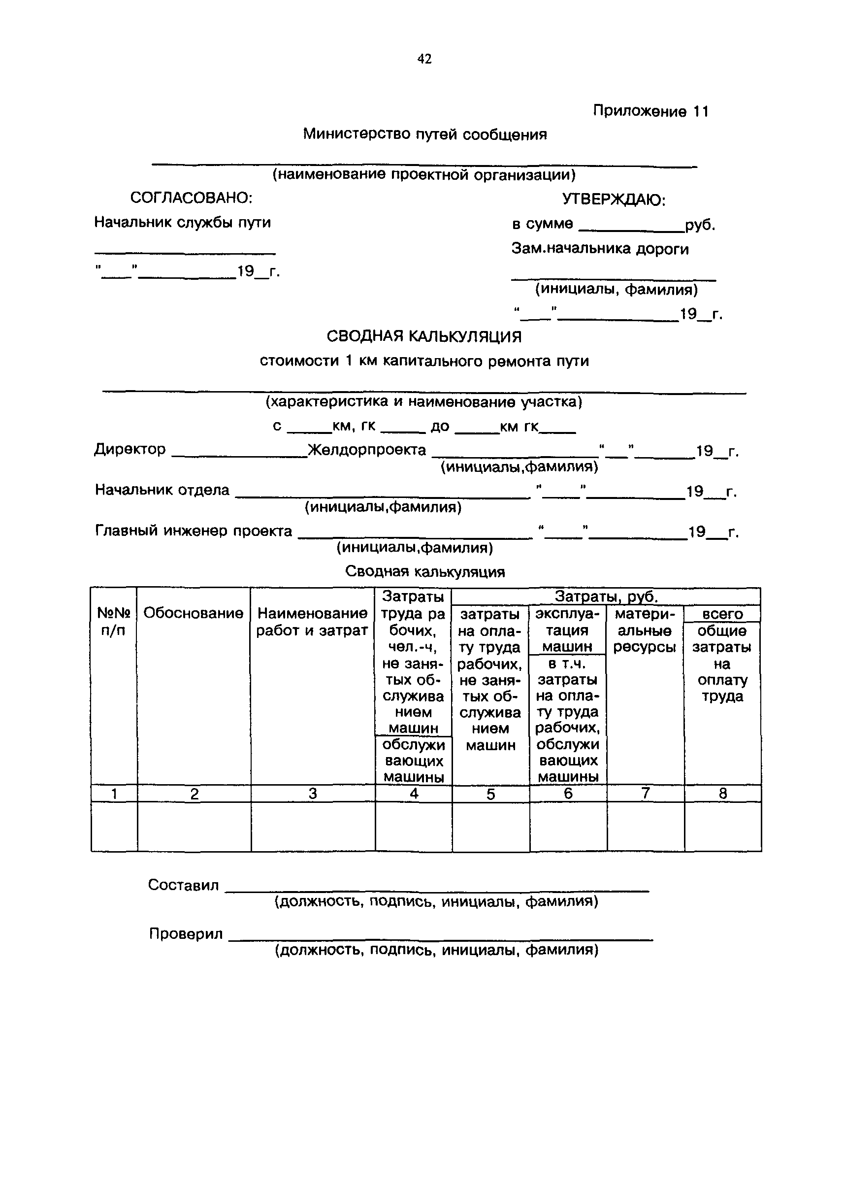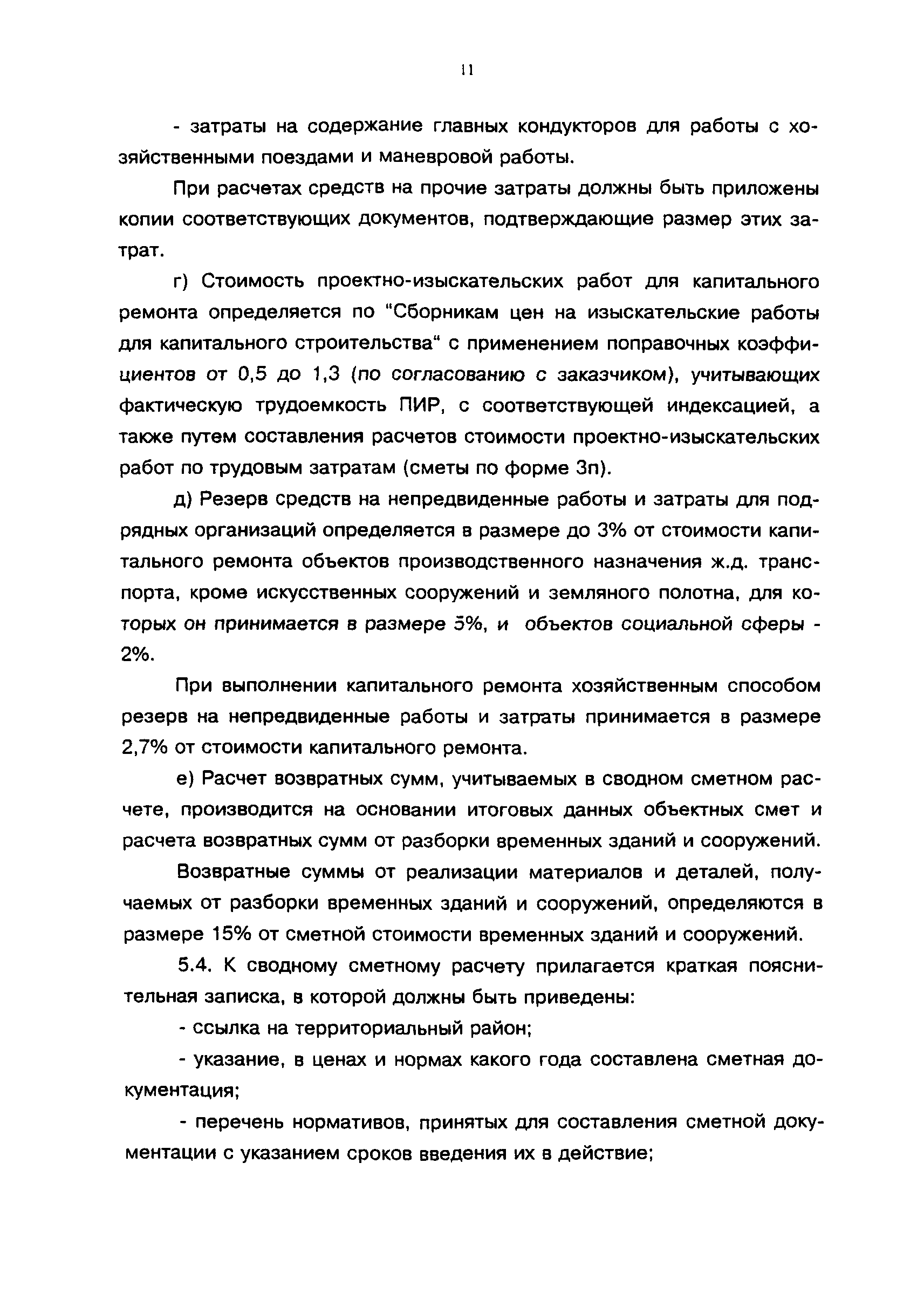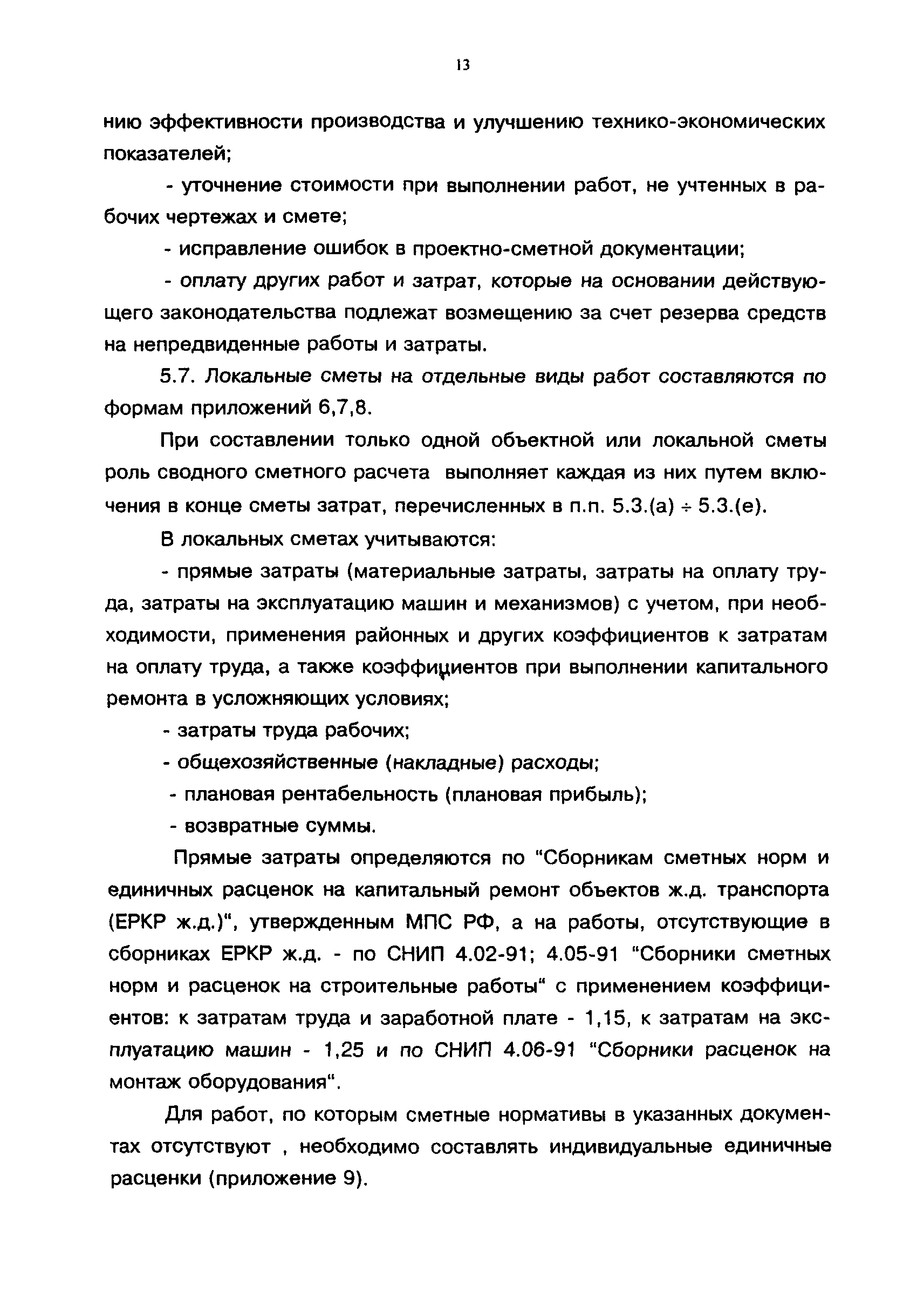 | Оглавление: | 1. Область применения 2. Общие положения 3. Порядок разработки проектной документации 4. Состав проектной документации на капитальный ремонт зданий и сооружения 5. Порядок составления сметной документации 6. Особенности составления проектно-сметной документации на работы по ремонту верхнего строения пути 7. Согласование и утверждение проектно-сметной документации 8. Указания по применению сборников ЕРКР ж.д. при разработке сметной документации Приложение 1. Задание на проектирование (вариант 1). Задание на проектирование (вариант 2) Приложение 2. Ведомость объемов ремонтных (монтажных) работ Приложение 3. Ведомость потребности и стоимости материалов при капитальном ремонте Приложение 4. Сводный сметный расчет стоимости капитального ремонта Приложение 5. Объектная смета Приложение 6. Локальная смета Приложение 7. Локальная смета Приложение 8. Локальная смета Приложение 9. Индивидуальная единичная расценка Приложение 10. Общехозяйственные (накладные) расходы Приложение 11. Сводная калькуляция стоимости 1 км капитального ремонта пути Приложение 12. Повышающие коэффициенты для учета влияния усложняющих условий производства капитального ремонт |