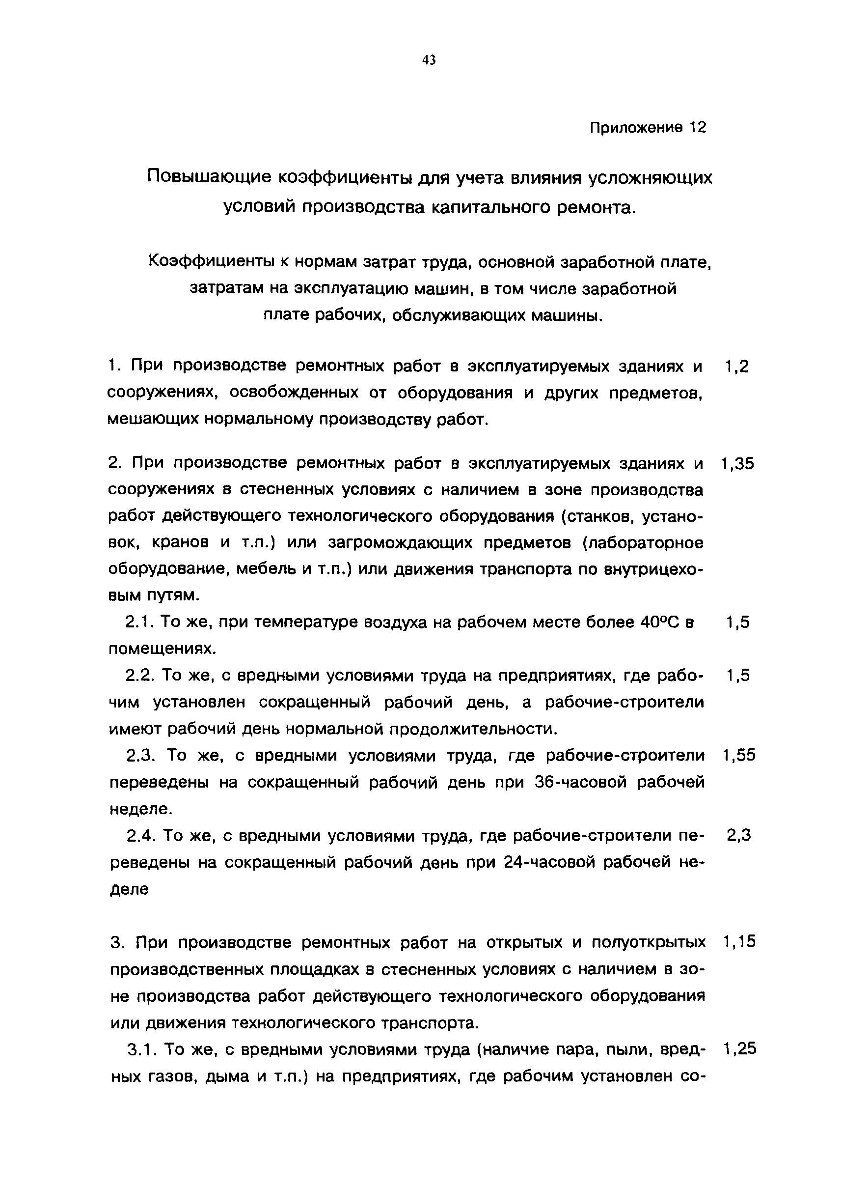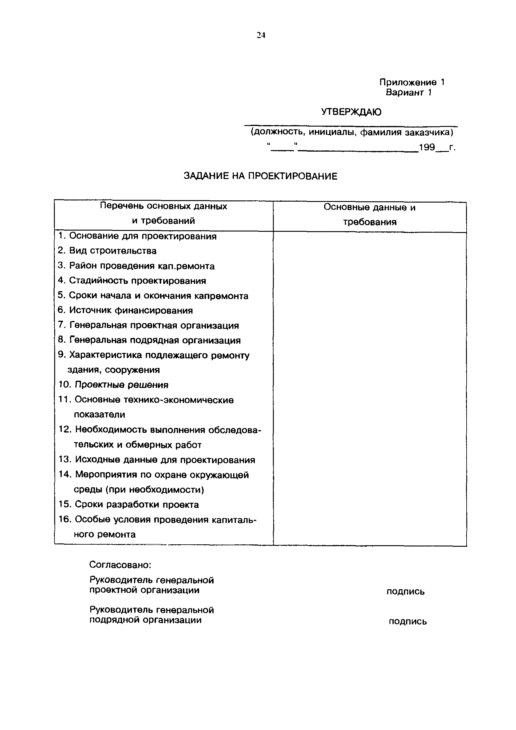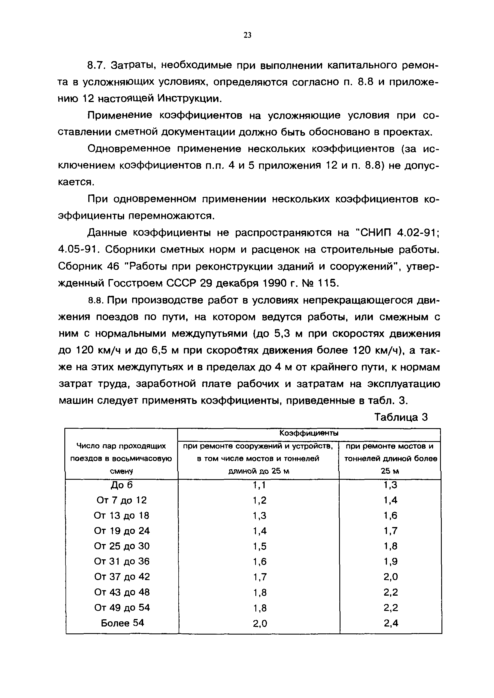 | Оглавление: | 1. Область применения 2. Общие положения 3. Порядок разработки проектной документации 4. Состав проектной документации на капитальный ремонт зданий и сооружения 5. Порядок составления сметной документации 6. Особенности составления проектно-сметной документации на работы по ремонту верхнего строения пути 7. Согласование и утверждение проектно-сметной документации 8. Указания по применению сборников ЕРКР ж.д. при разработке сметной документации Приложение 1. Задание на проектирование (вариант 1). Задание на проектирование (вариант 2) Приложение 2. Ведомость объемов ремонтных (монтажных) работ Приложение 3. Ведомость потребности и стоимости материалов при капитальном ремонте Приложение 4. Сводный сметный расчет стоимости капитального ремонта Приложение 5. Объектная смета Приложение 6. Локальная смета Приложение 7. Локальная смета Приложение 8. Локальная смета Приложение 9. Индивидуальная единичная расценка Приложение 10. Общехозяйственные (накладные) расходы Приложение 11. Сводная калькуляция стоимости 1 км капитального ремонта пути Приложение 12. Повышающие коэффициенты для учета влияния усложняющих условий производства капитального ремонт |