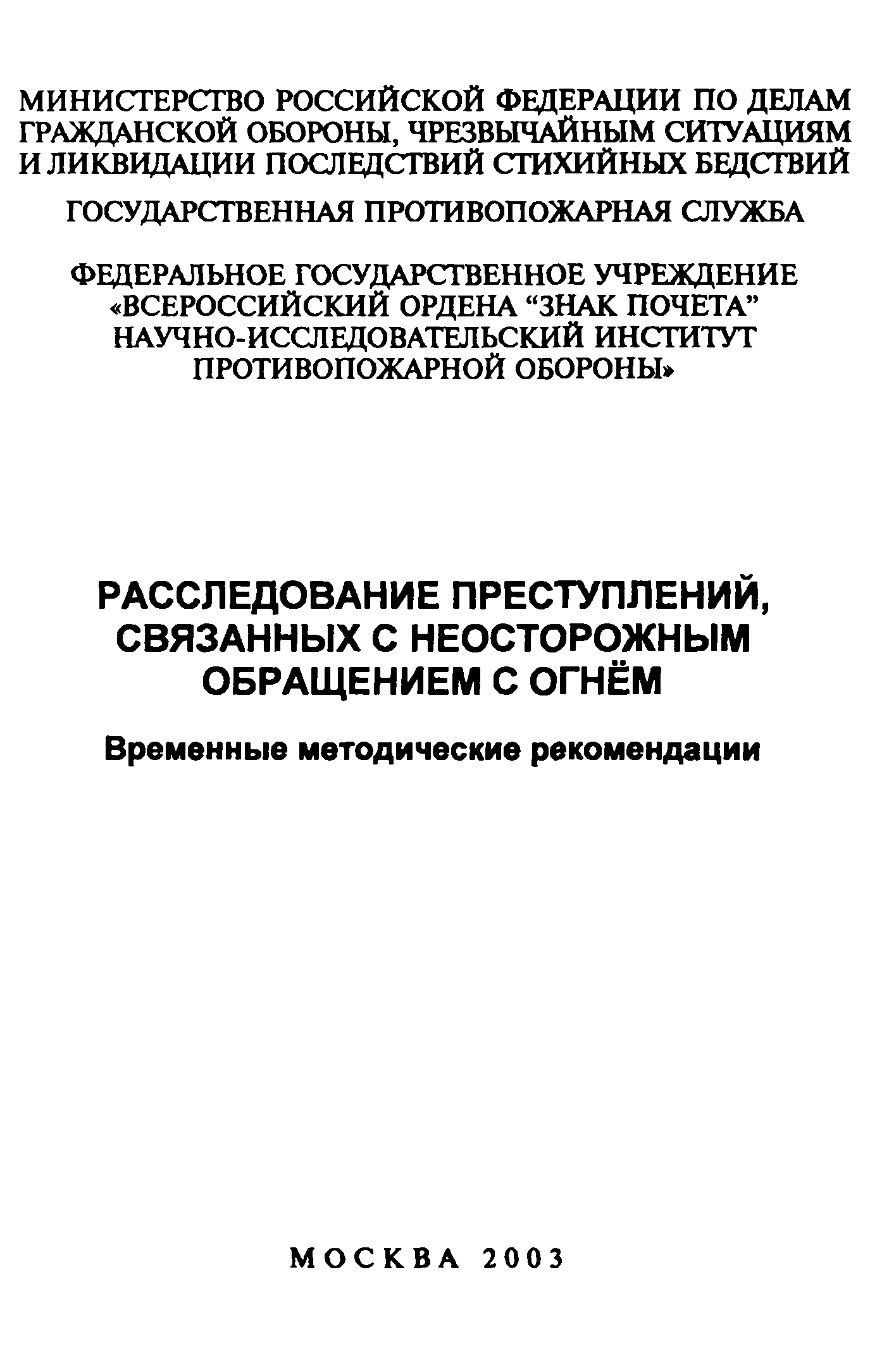 | Название рус.: | Расследование преступлений, связанных с неосторожным обращением с огнем. Временные методические рекомендации |