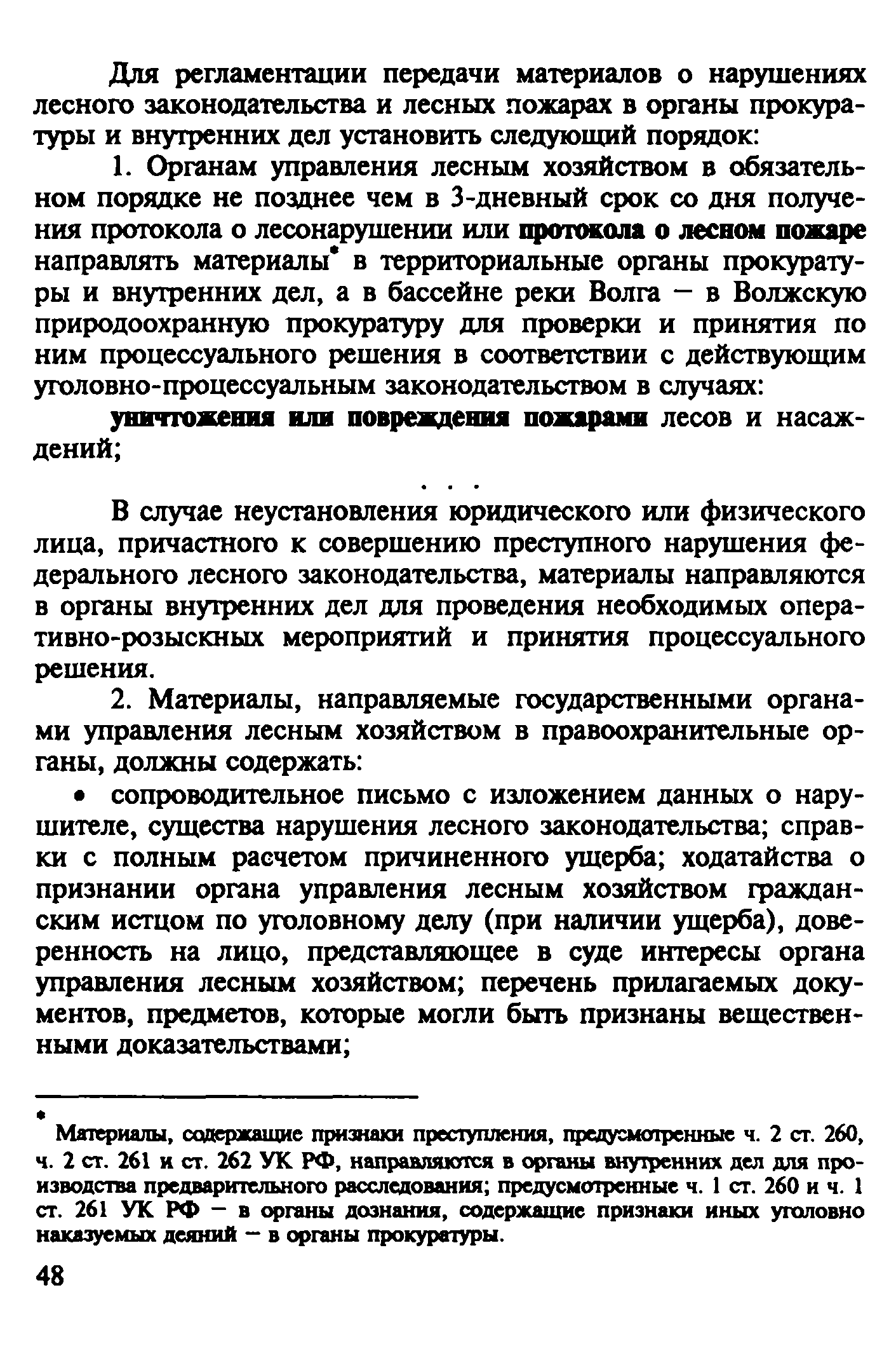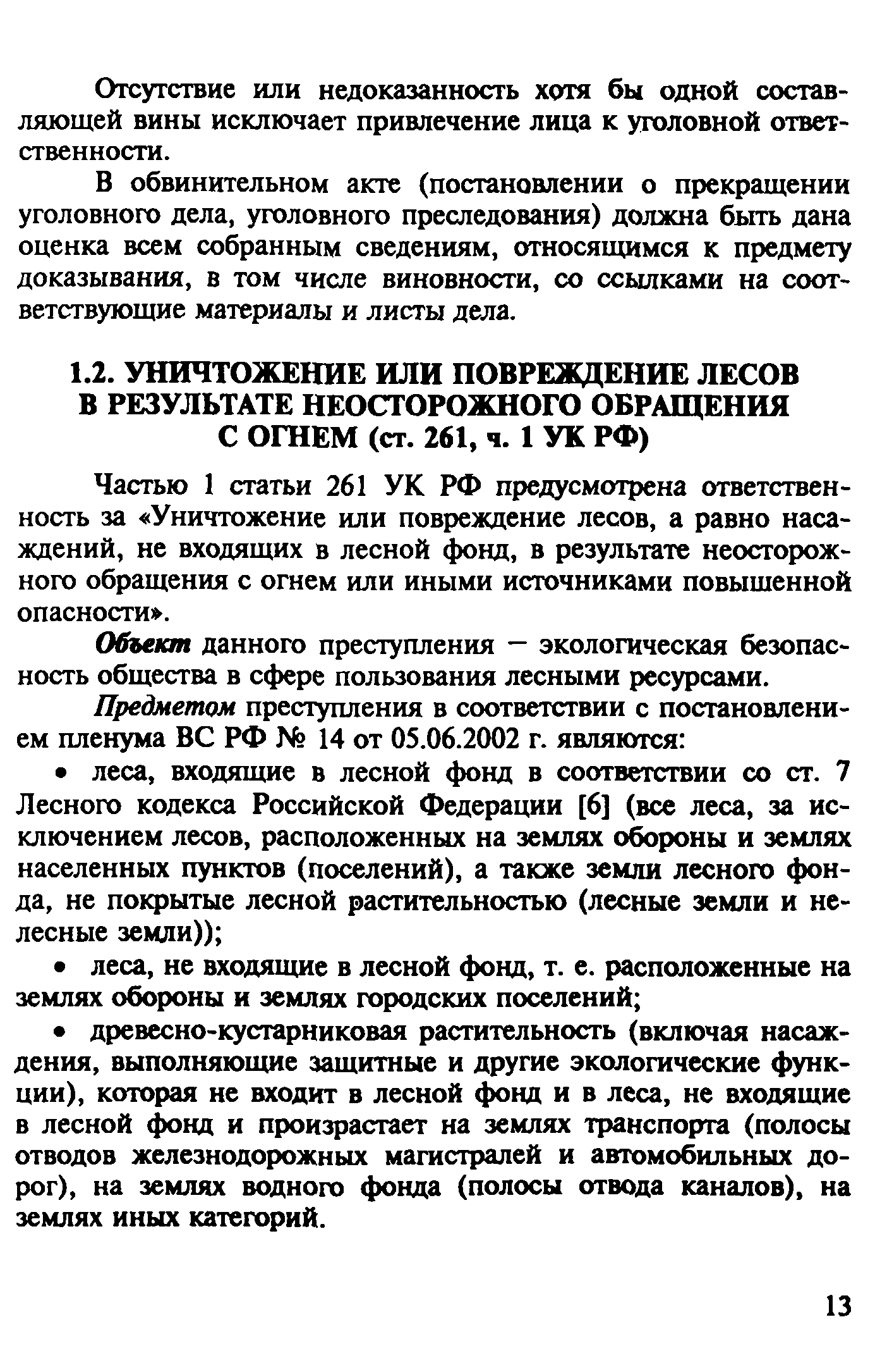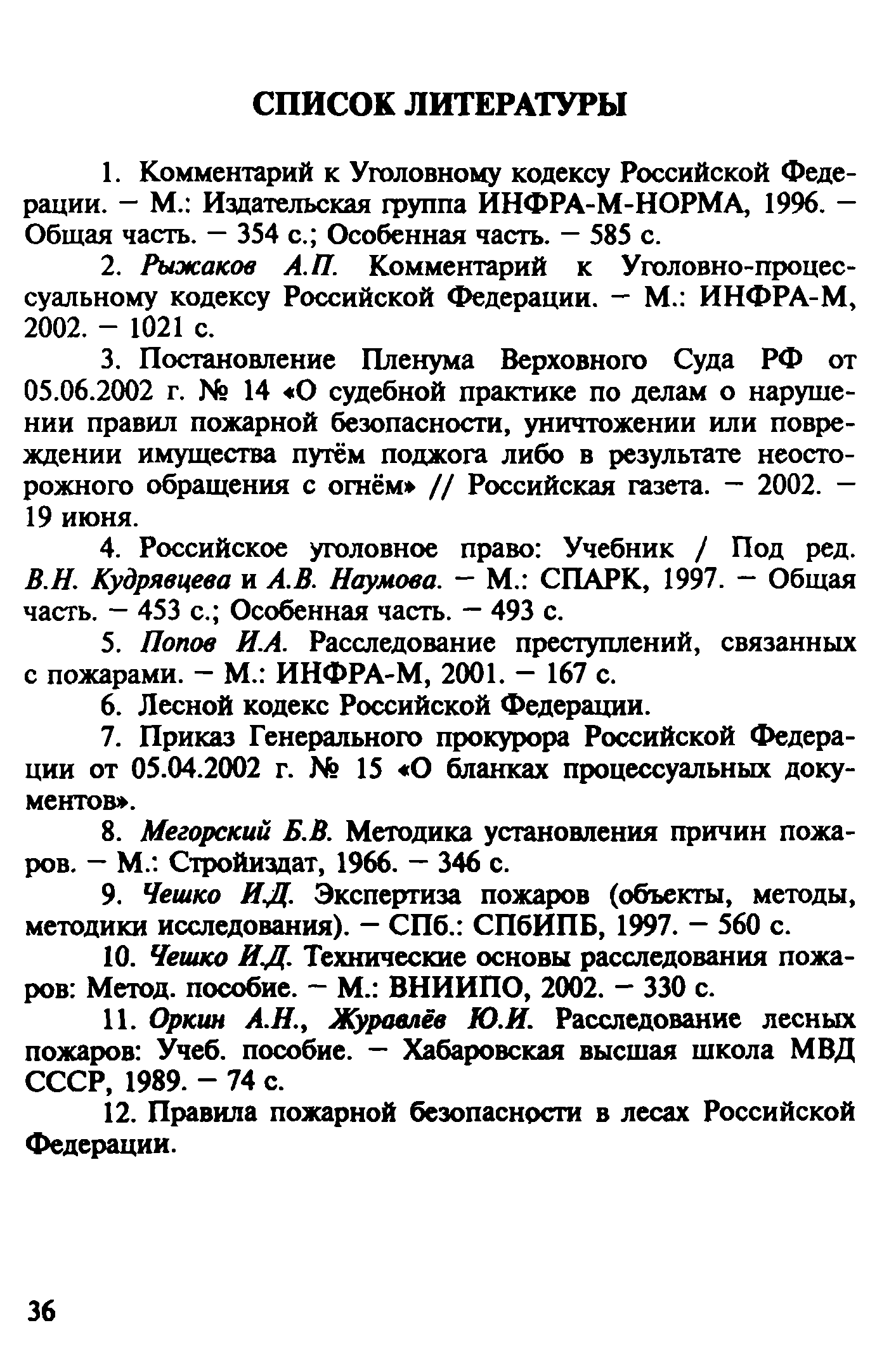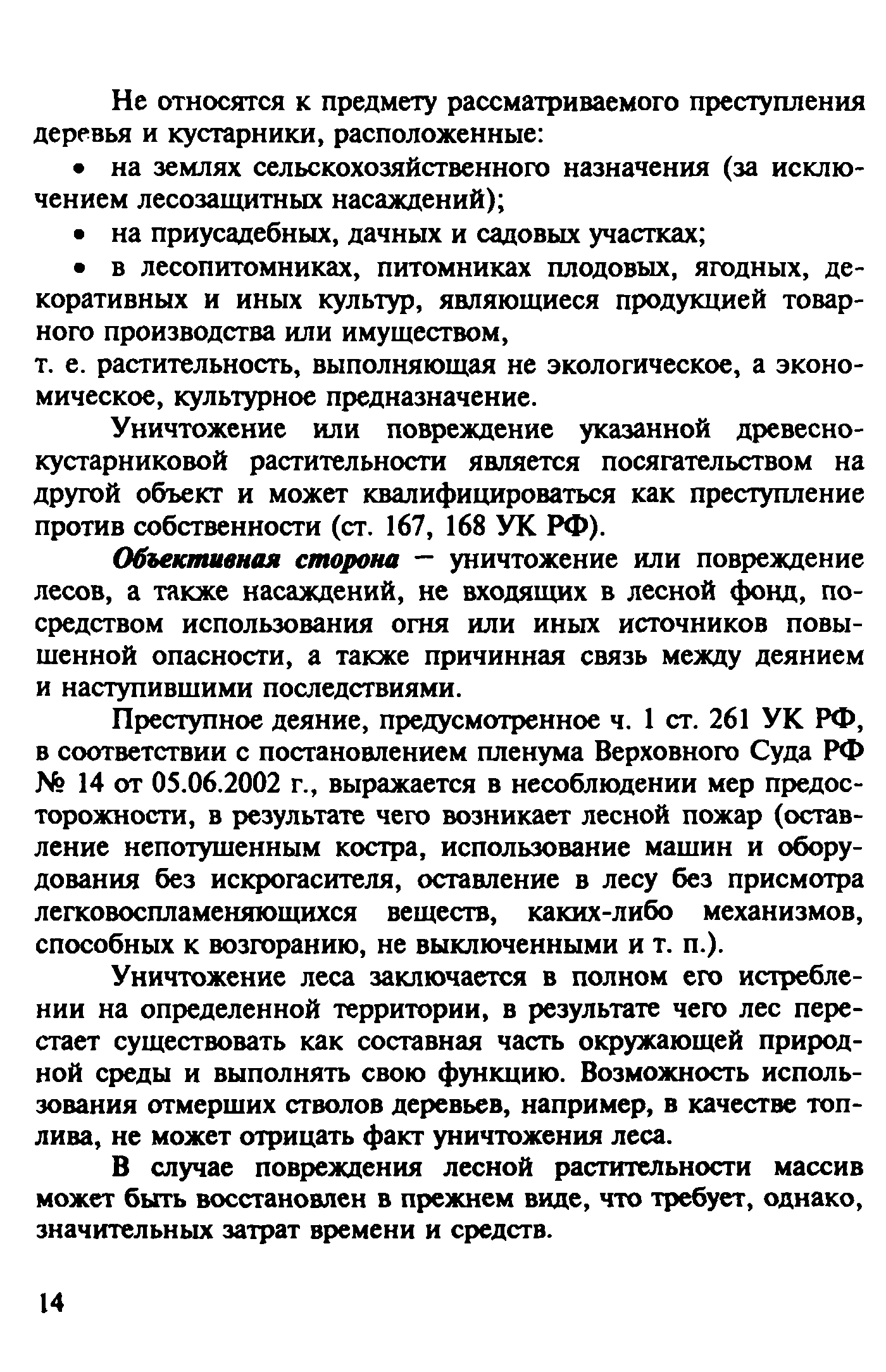 | Оглавление: | Введение 1. Уголовно-правовая характеристика преступлений, предусмотренных ч. 2 ст. 168 и ч. 1 ст. 261 УК РФ 1.1. Уничтожение или повреждение чужого имущества, совершенные путем неосторожного обращения с огнем (ч. 2 ст. 168 УК РФ) 1.2. Уничтожение или повреждение лесов в результате неосторожного обращения с огнем (ч. 1 ст. 261 УК РФ) 2. Процессуальные вопросы и организация расследования преступлений, предусмотренных ч. 2 ст. 168 и ч. 1 ст. 261 УК РФ 2.1. Формы работы сотрудников ГПС по уголовным делам, связанным с пожарами. Правовой статус начальника органа дознания, дознавателя, государственного инспектора по пожарному надзору 2.2. Проверка по факту пожара 2.3. Производство дознания 2.4. Производство неотложных следственных действий 3. Особенности расследования преступлений, предусмотренных ч. 1. ст. 261 УК РФ Список литературы Приложение 1. Постановление о возбуждении уголовного дела и принятии его к производству Приложение 2. Основные понятия и характеристики, используемые при расследовании лесных пожаров Приложение 3. Лесной кодекс РФ (Извлечение) Приложение 4. Правила пожарной безопасности в лесах Российской Федерации (Извлечение) Приложение 5. Указание Генеральной прокуратуры РФ от 14 мая 1997 года № 25/7, МВД РФ от 12 мая 1997 года № 1/8588, Федеральной службы лесного хозяйства России от 16 апреля 1997 года № ДО-5-27/166 «Об усилении координации и взаимодействия в борьбе с нарушениями федерального лесного законодательства и порядке оформления и передачи материалов о лесных пожарах и лесонарушениях в правоохранительные органы» (Извлечение) |