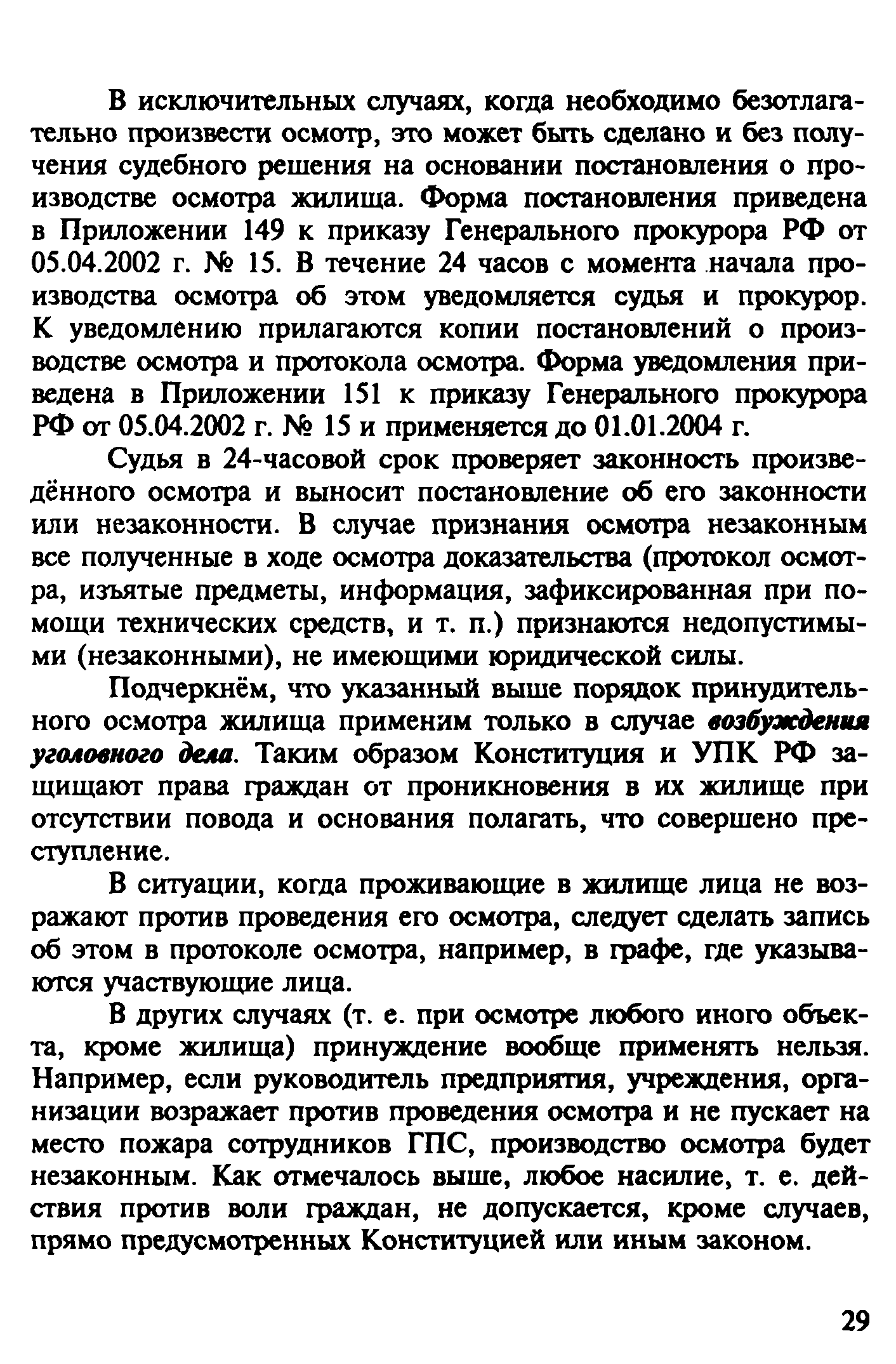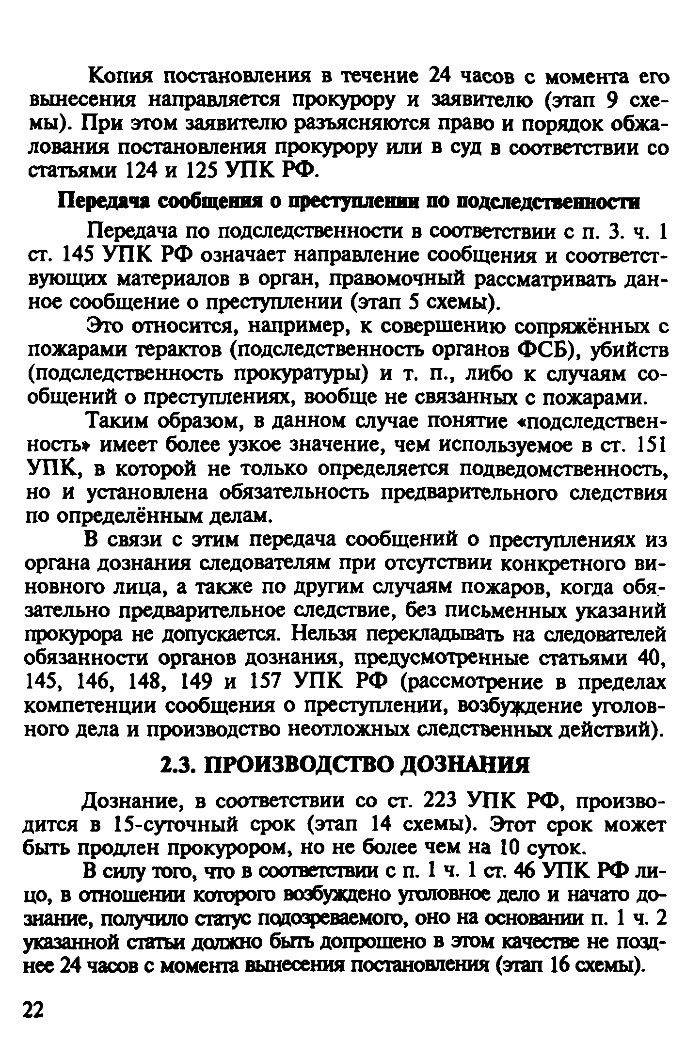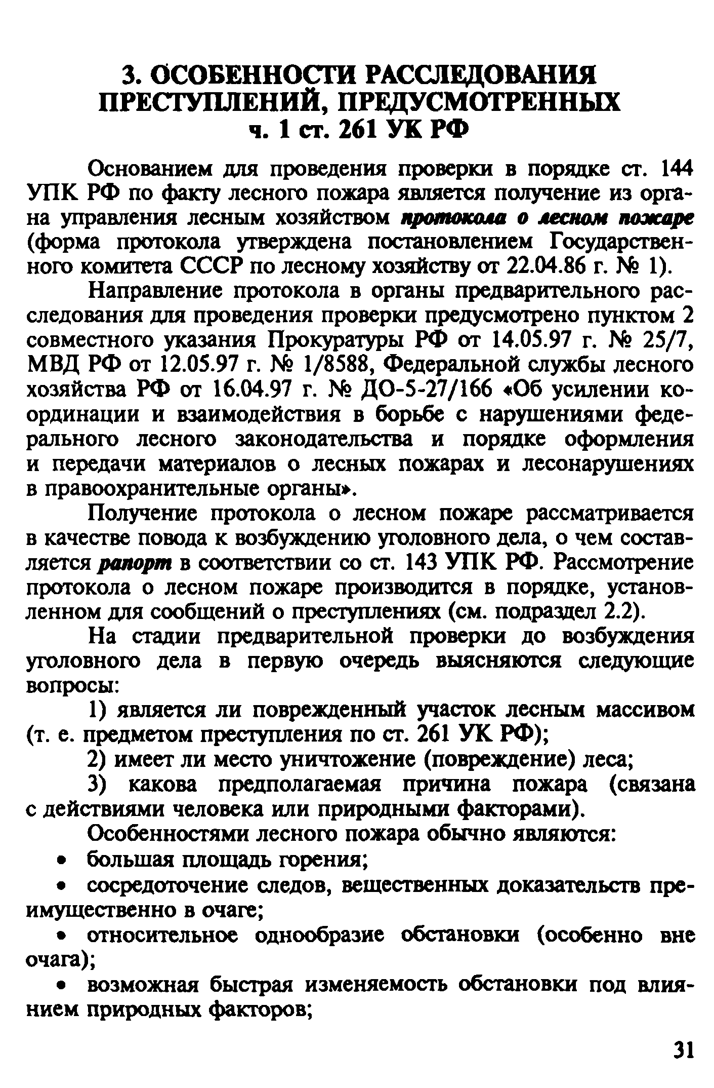 | Оглавление: | Введение 1. Уголовно-правовая характеристика преступлений, предусмотренных ч. 2 ст. 168 и ч. 1 ст. 261 УК РФ 1.1. Уничтожение или повреждение чужого имущества, совершенные путем неосторожного обращения с огнем (ч. 2 ст. 168 УК РФ) 1.2. Уничтожение или повреждение лесов в результате неосторожного обращения с огнем (ч. 1 ст. 261 УК РФ) 2. Процессуальные вопросы и организация расследования преступлений, предусмотренных ч. 2 ст. 168 и ч. 1 ст. 261 УК РФ 2.1. Формы работы сотрудников ГПС по уголовным делам, связанным с пожарами. Правовой статус начальника органа дознания, дознавателя, государственного инспектора по пожарному надзору 2.2. Проверка по факту пожара 2.3. Производство дознания 2.4. Производство неотложных следственных действий 3. Особенности расследования преступлений, предусмотренных ч. 1. ст. 261 УК РФ Список литературы Приложение 1. Постановление о возбуждении уголовного дела и принятии его к производству Приложение 2. Основные понятия и характеристики, используемые при расследовании лесных пожаров Приложение 3. Лесной кодекс РФ (Извлечение) Приложение 4. Правила пожарной безопасности в лесах Российской Федерации (Извлечение) Приложение 5. Указание Генеральной прокуратуры РФ от 14 мая 1997 года № 25/7, МВД РФ от 12 мая 1997 года № 1/8588, Федеральной службы лесного хозяйства России от 16 апреля 1997 года № ДО-5-27/166 «Об усилении координации и взаимодействия в борьбе с нарушениями федерального лесного законодательства и порядке оформления и передачи материалов о лесных пожарах и лесонарушениях в правоохранительные органы» (Извлечение) |