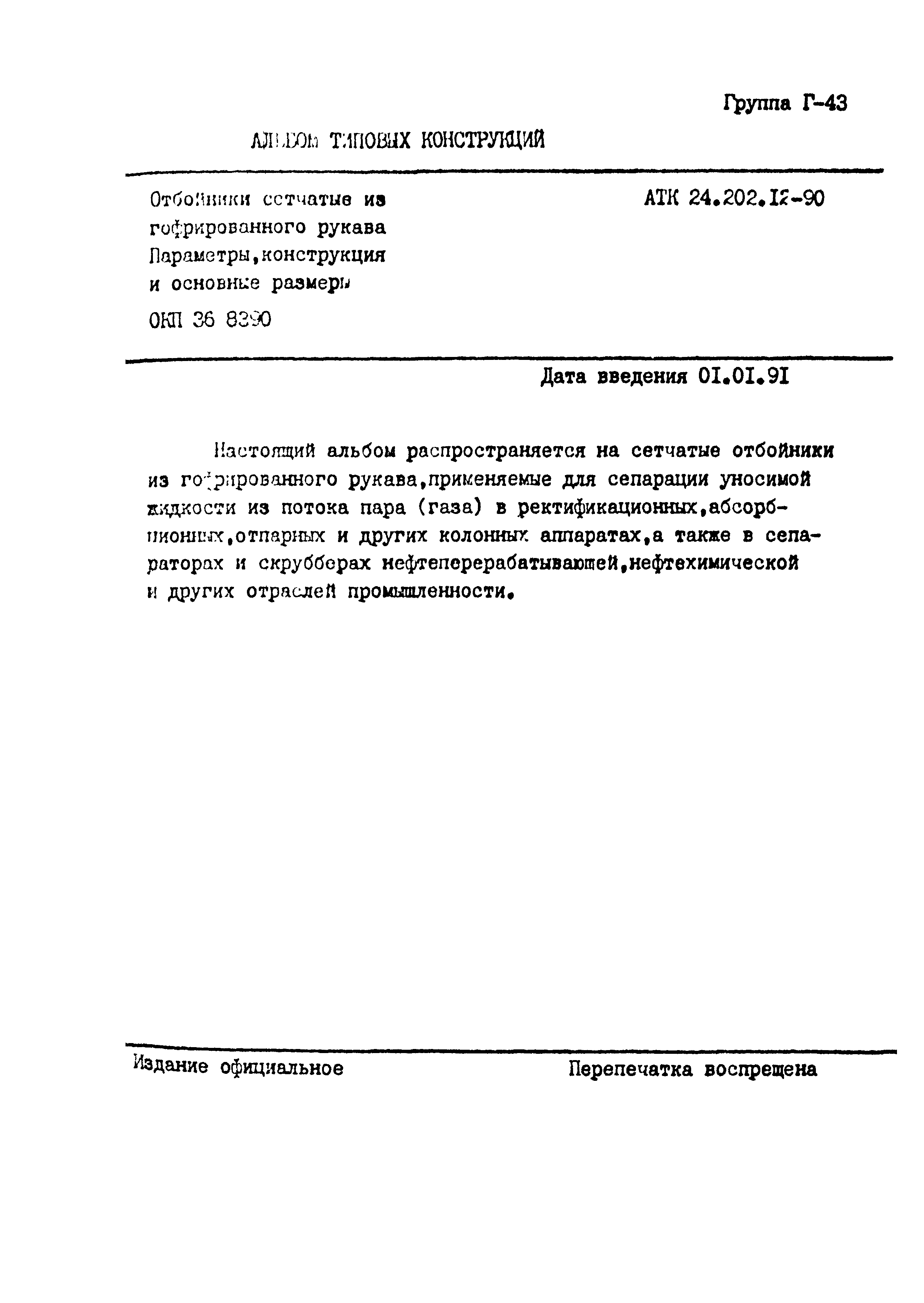 Скачать АТК 24.202.12-90 Отбойники сетчатые из гофрированного рукава. Параметры, конструкция и основные размерыДата актуализации: 01.01.2021