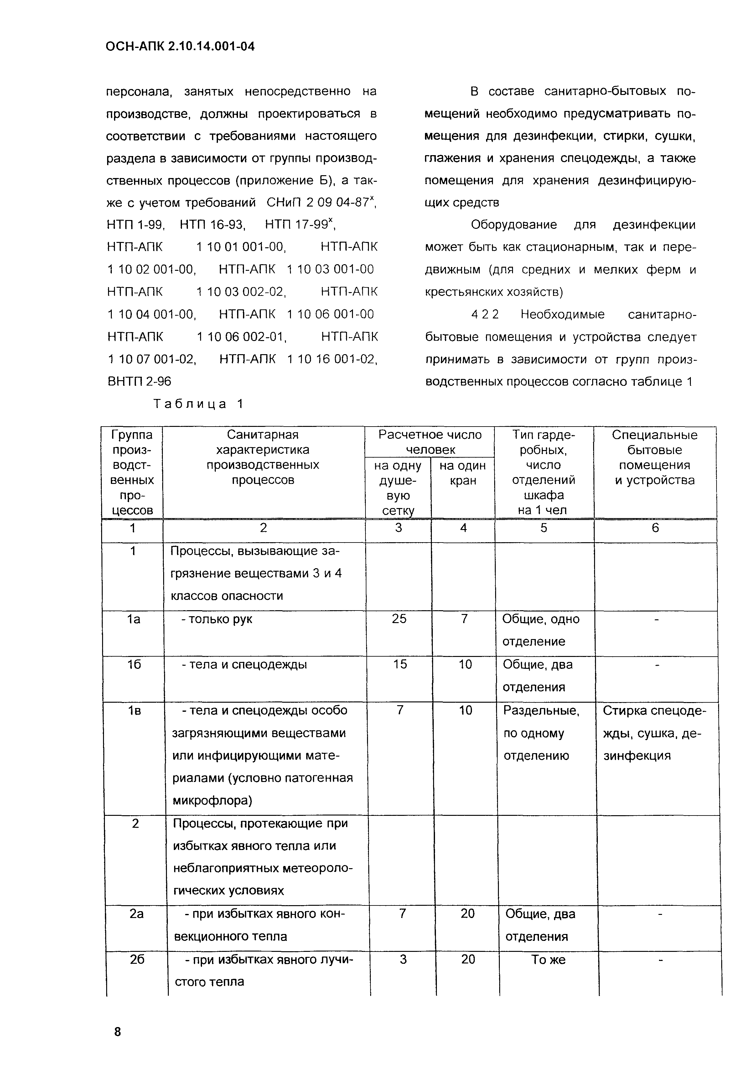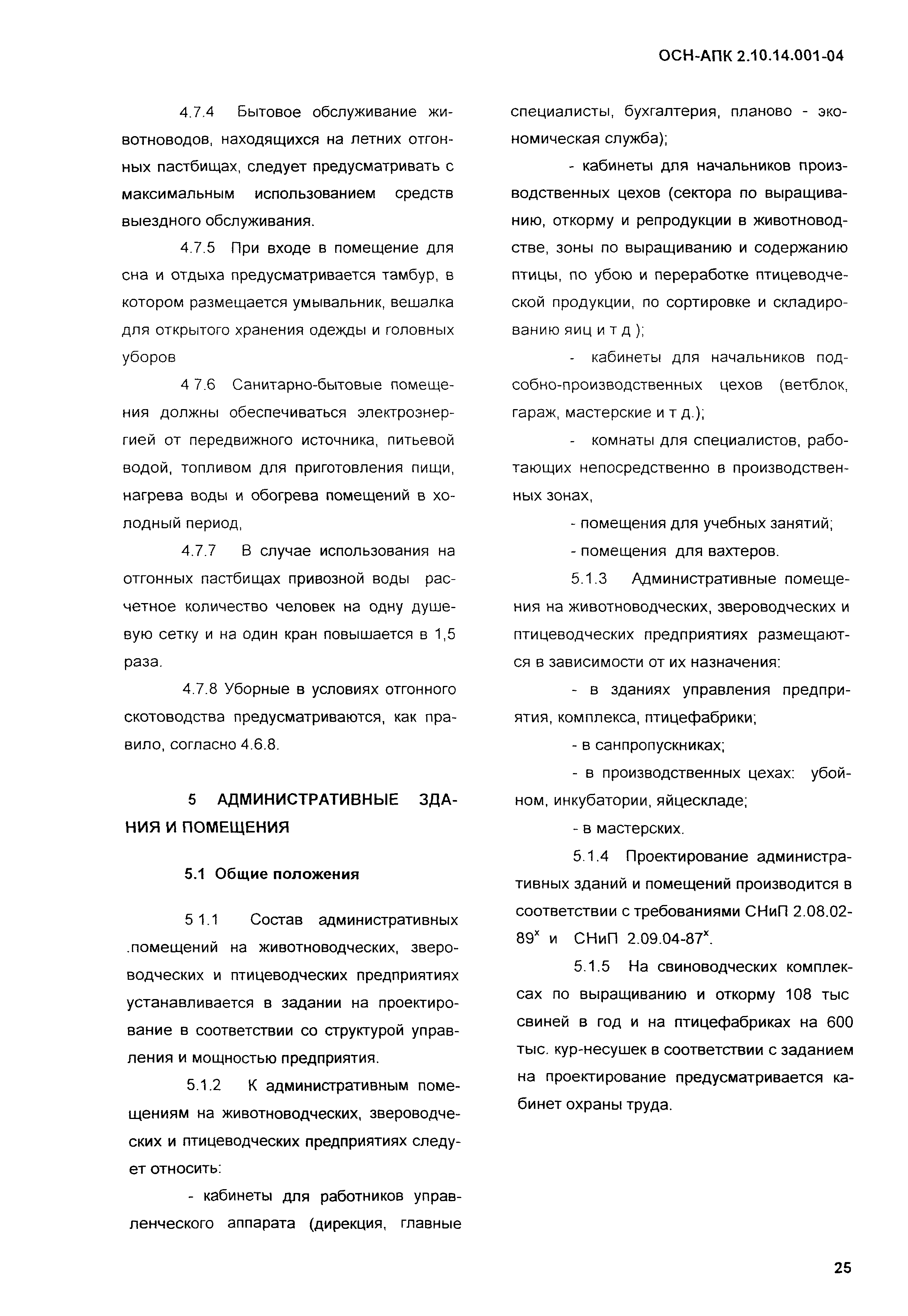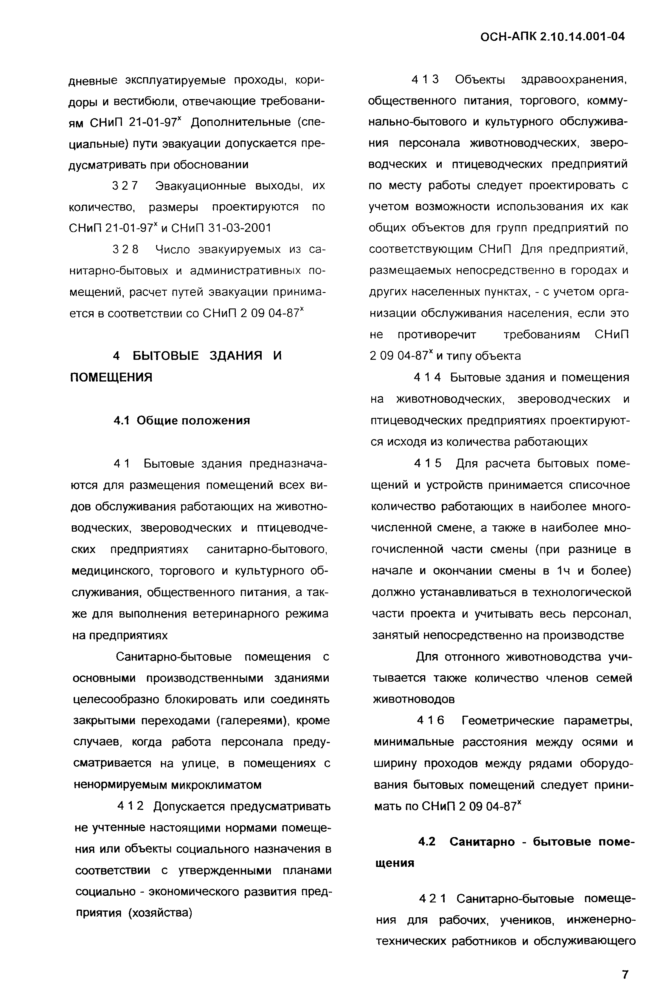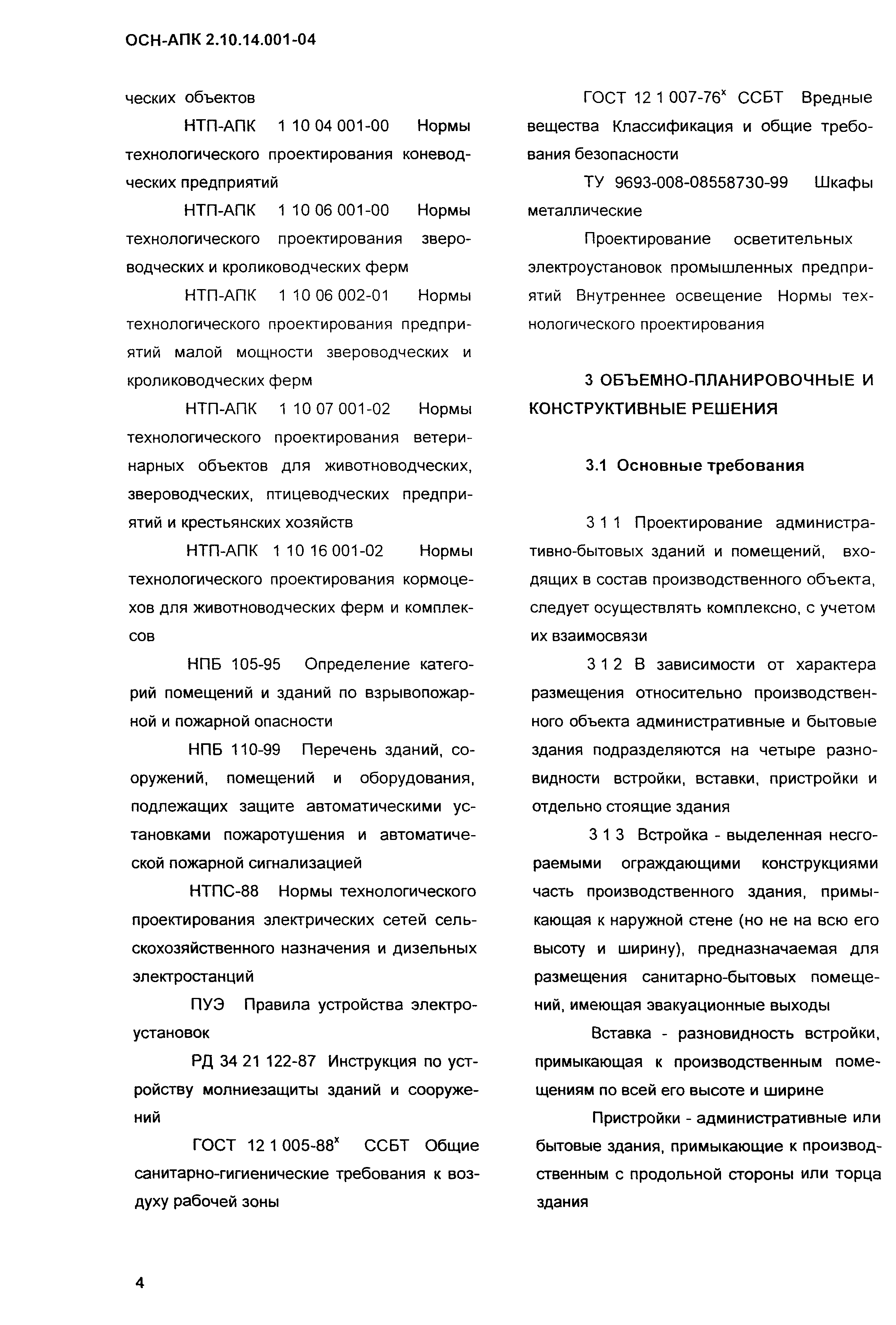 Нормы по проектированию административных, бытовых зданий и помещений для животноводческих, звероводческих и птицеводческих предприятий и других объектов сельскохозяйственного назначения| Обозначение: | ОСН-АПК 2.10.14.001-04 | | Обозначение англ: | 2.10.14.001-04 | | Статус: | действует | | Название рус.: | Нормы по проектированию административных, бытовых зданий и помещений для животноводческих, звероводческих и птицеводческих предприятий и других объектов сельскохозяйственного назначения | | Дата добавления в базу: | 01.09.2013 | | Дата актуализации: | 01.01.2021 | | Дата введения: | 01.12.2004 | | Область применения: | Нормы распространяются на проектирование вновь строящихся и реконструируемых административных, бытовых зданий и помещений, санпропускников, предназначенных для животноводческих, звероводческих и птицеводческих предприятий всех типов. | | Оглавление: | 1 Общие положения 2 Нормативные ссылки 3 Объемно-планировочные и конструктивные решения 3.1 Основные требования 3.2 Требования к организации людских потоков и эвакуации людей из помещений и зданий 4 Бытовые здания и помещения 4.1 Общие положения 4.2 Санитарно-бытовые помещения 4.3 Помещения здравоохранения 4.4 Помещения общественного питания 4.5 Помещения торгового обслуживания, службы быта, культурного обслуживания 4.6 Санитарно-бытовые помещения в летних лагерях для животных 4.7 Санитарно-бытовые помещения для отгонного скотоводства 5 Административные здания и помещения 5.1 Общие положения 5.2 Административные помещения 6 Отопление и вентиляция Приложение А Определение ширины маршей лестниц в отдельностоящих зданиях, вставках, встройках, пристройках для трехэтажных зданий и более Приложение Б Санитарная характеристика основных профессий и соответствующие им группы производственных процессов, определяющих состав специальных санитарно-бытовых помещений и устройств | | Разработан: | ВНИИОТ СарНИИСГ ФГНУ НПЦ Гипронисельхоз ГНУ ВНИИВСГЭ