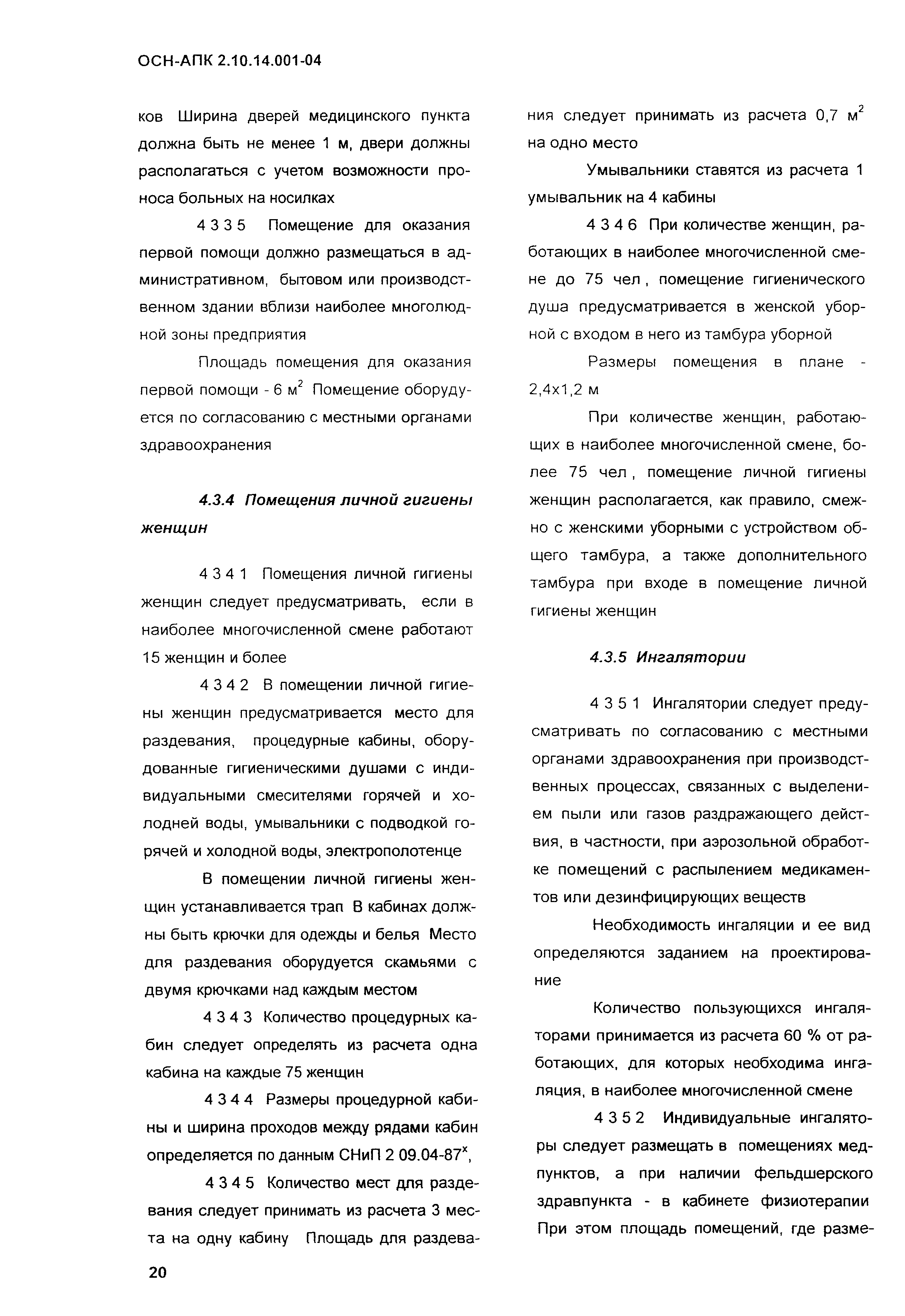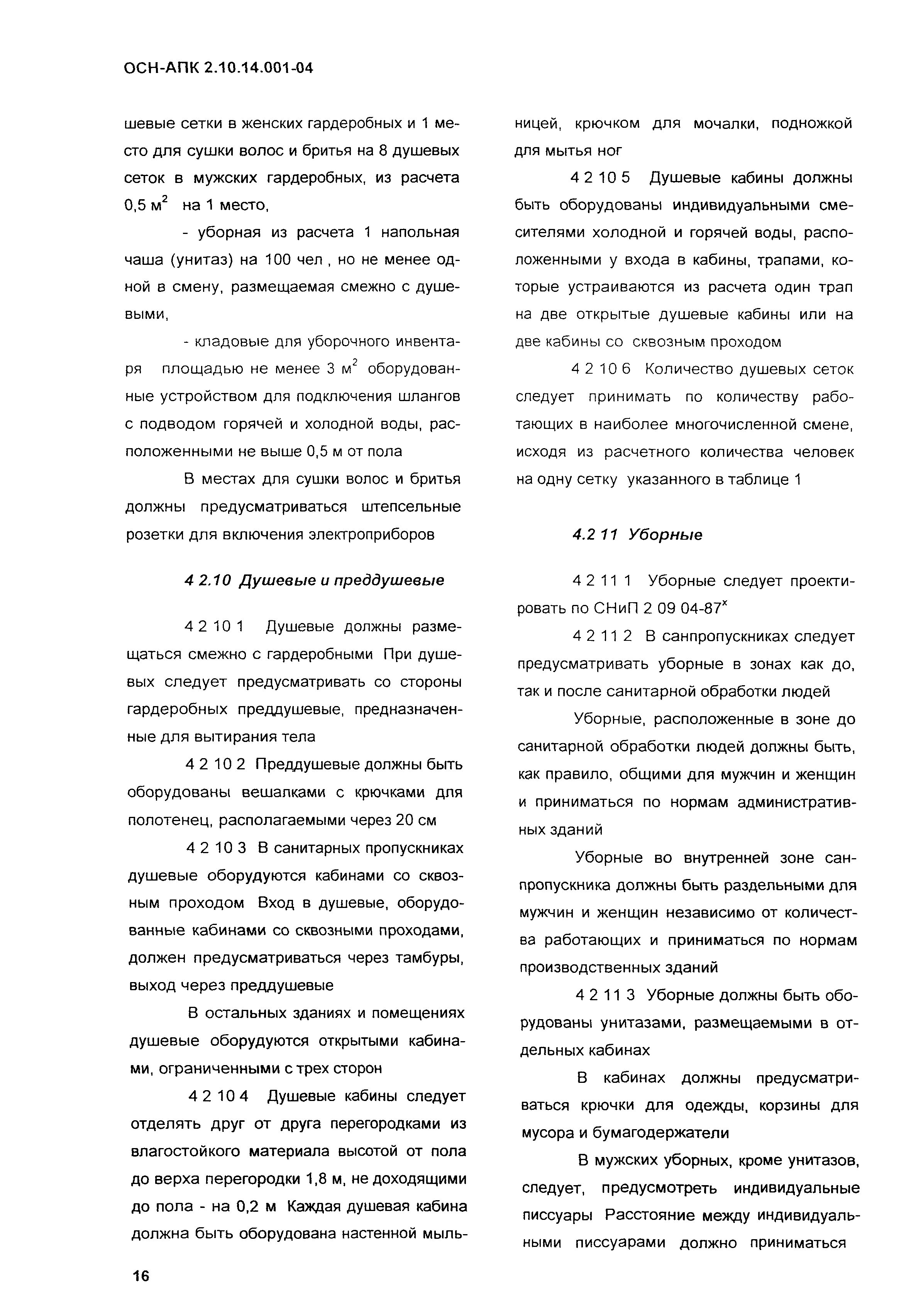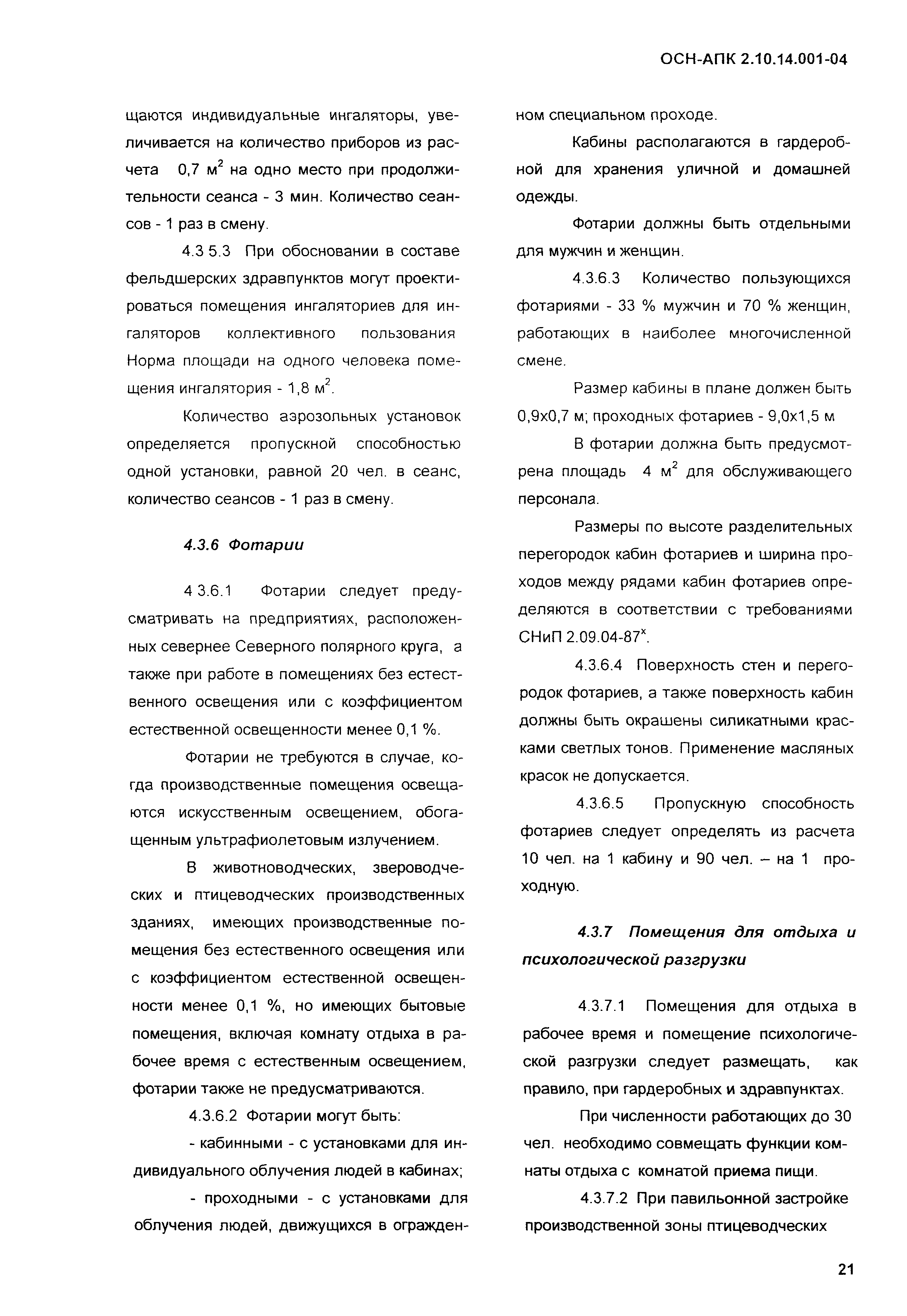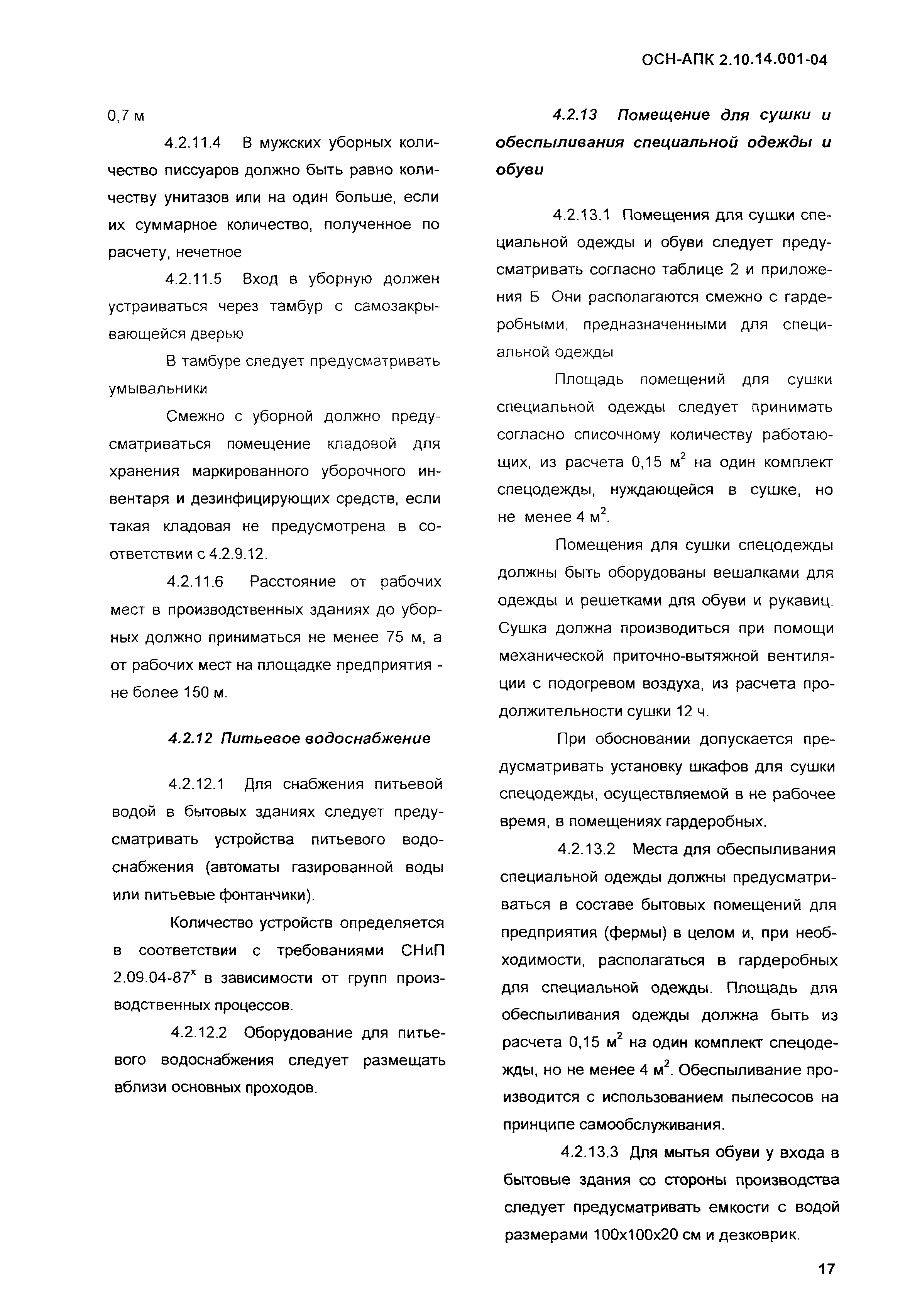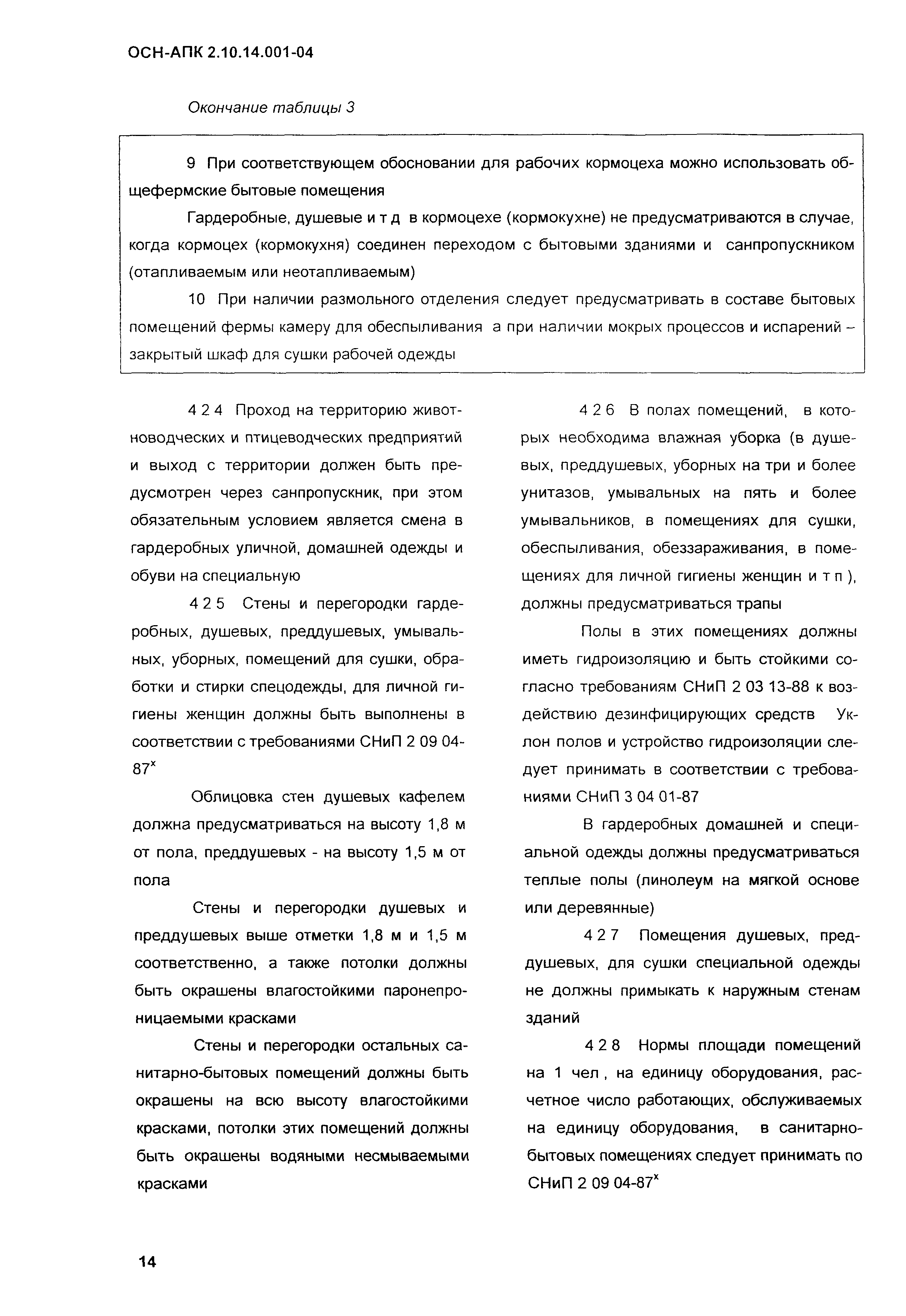 Нормы по проектированию административных, бытовых зданий и помещений для животноводческих, звероводческих и птицеводческих предприятий и других объектов сельскохозяйственного назначения| Обозначение: | ОСН-АПК 2.10.14.001-04 | | Обозначение англ: | 2.10.14.001-04 | | Статус: | действует | | Название рус.: | Нормы по проектированию административных, бытовых зданий и помещений для животноводческих, звероводческих и птицеводческих предприятий и других объектов сельскохозяйственного назначения | | Дата добавления в базу: | 01.09.2013 | | Дата актуализации: | 01.01.2021 | | Дата введения: | 01.12.2004 | | Область применения: | Нормы распространяются на проектирование вновь строящихся и реконструируемых административных, бытовых зданий и помещений, санпропускников, предназначенных для животноводческих, звероводческих и птицеводческих предприятий всех типов. | | Оглавление: | 1 Общие положения 2 Нормативные ссылки 3 Объемно-планировочные и конструктивные решения 3.1 Основные требования 3.2 Требования к организации людских потоков и эвакуации людей из помещений и зданий 4 Бытовые здания и помещения 4.1 Общие положения 4.2 Санитарно-бытовые помещения 4.3 Помещения здравоохранения 4.4 Помещения общественного питания 4.5 Помещения торгового обслуживания, службы быта, культурного обслуживания 4.6 Санитарно-бытовые помещения в летних лагерях для животных 4.7 Санитарно-бытовые помещения для отгонного скотоводства 5 Административные здания и помещения 5.1 Общие положения 5.2 Административные помещения 6 Отопление и вентиляция Приложение А Определение ширины маршей лестниц в отдельностоящих зданиях, вставках, встройках, пристройках для трехэтажных зданий и более Приложение Б Санитарная характеристика основных профессий и соответствующие им группы производственных процессов, определяющих состав специальных санитарно-бытовых помещений и устройств | | Разработан: | ВНИИОТ СарНИИСГ ФГНУ НПЦ Гипронисельхоз ГНУ ВНИИВСГЭ