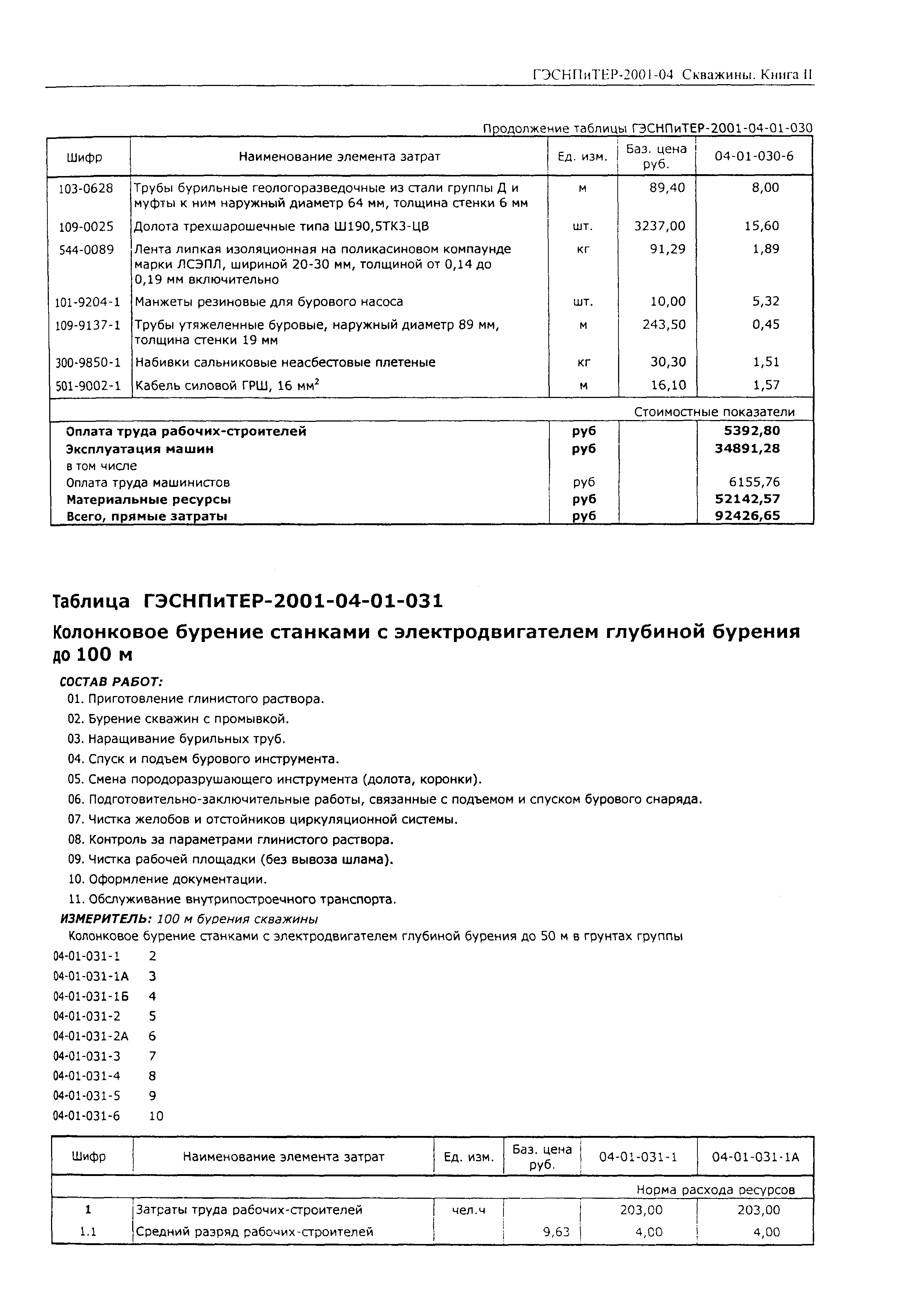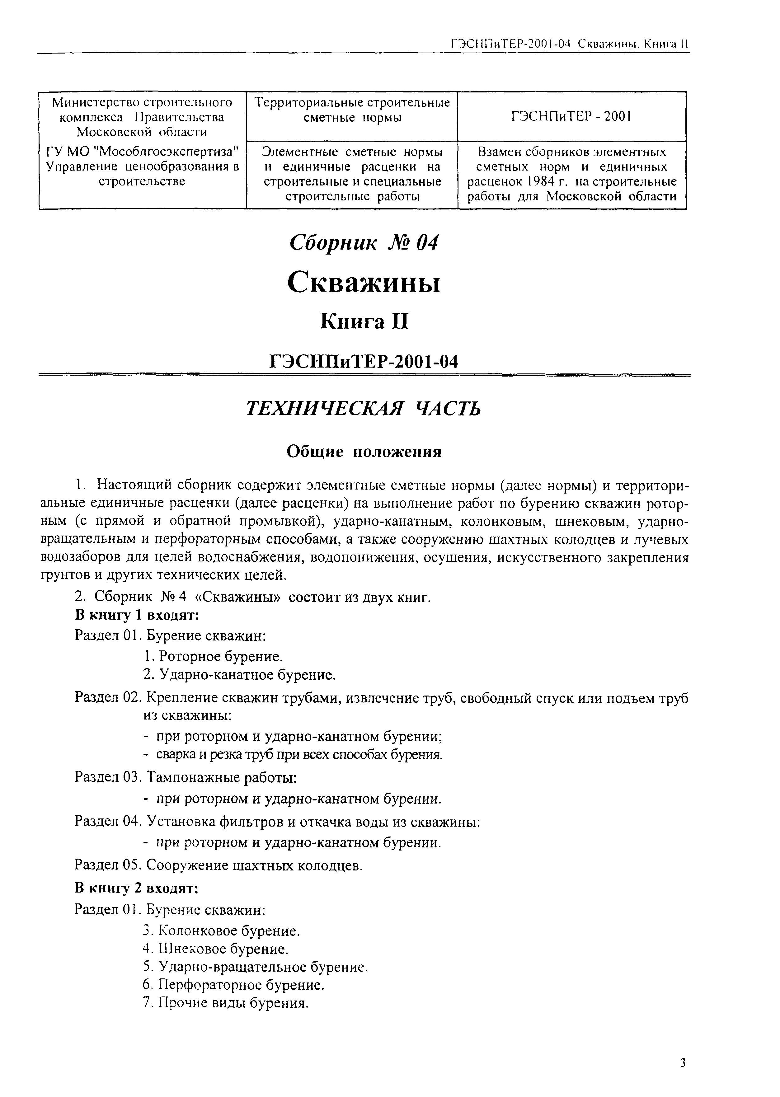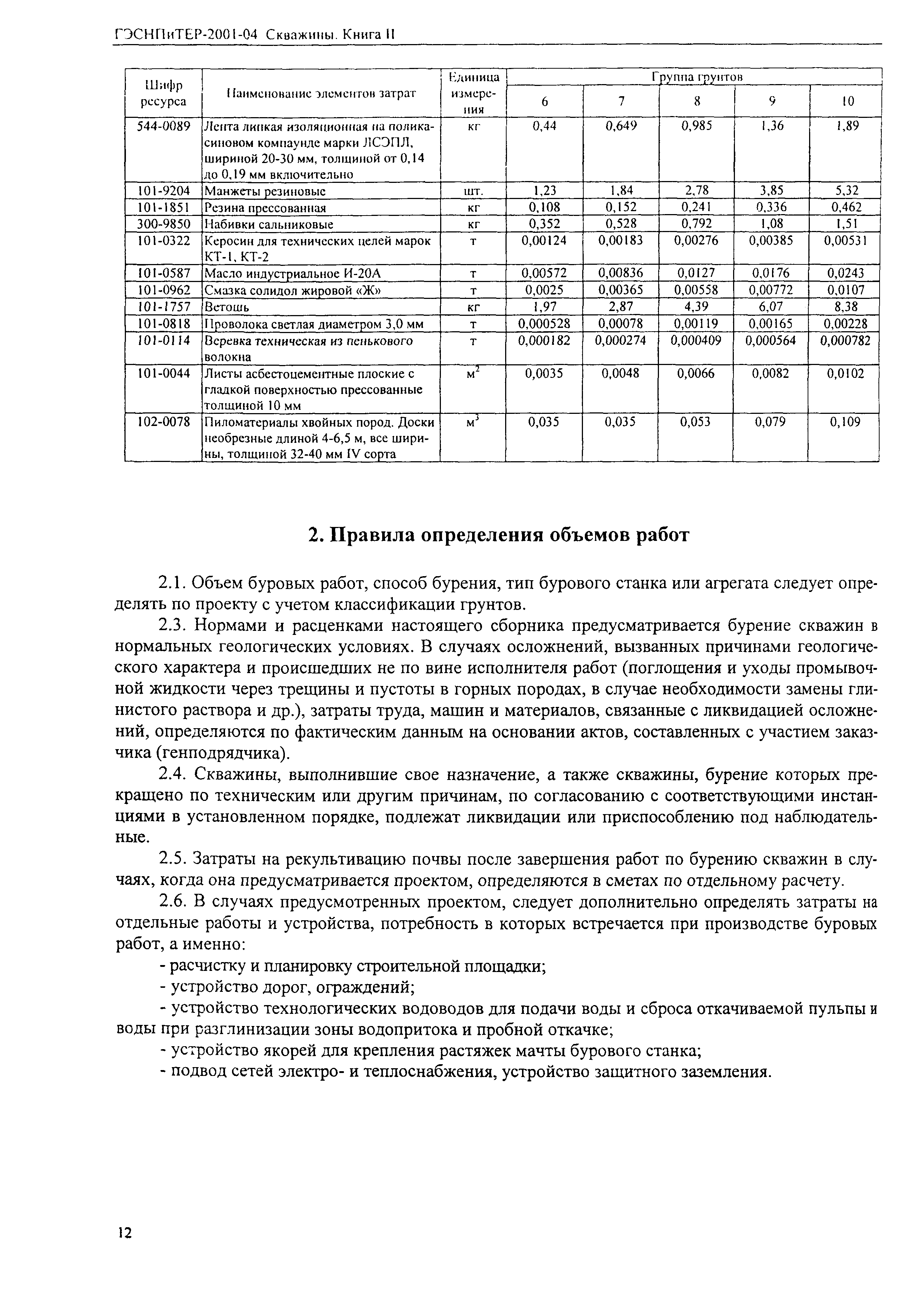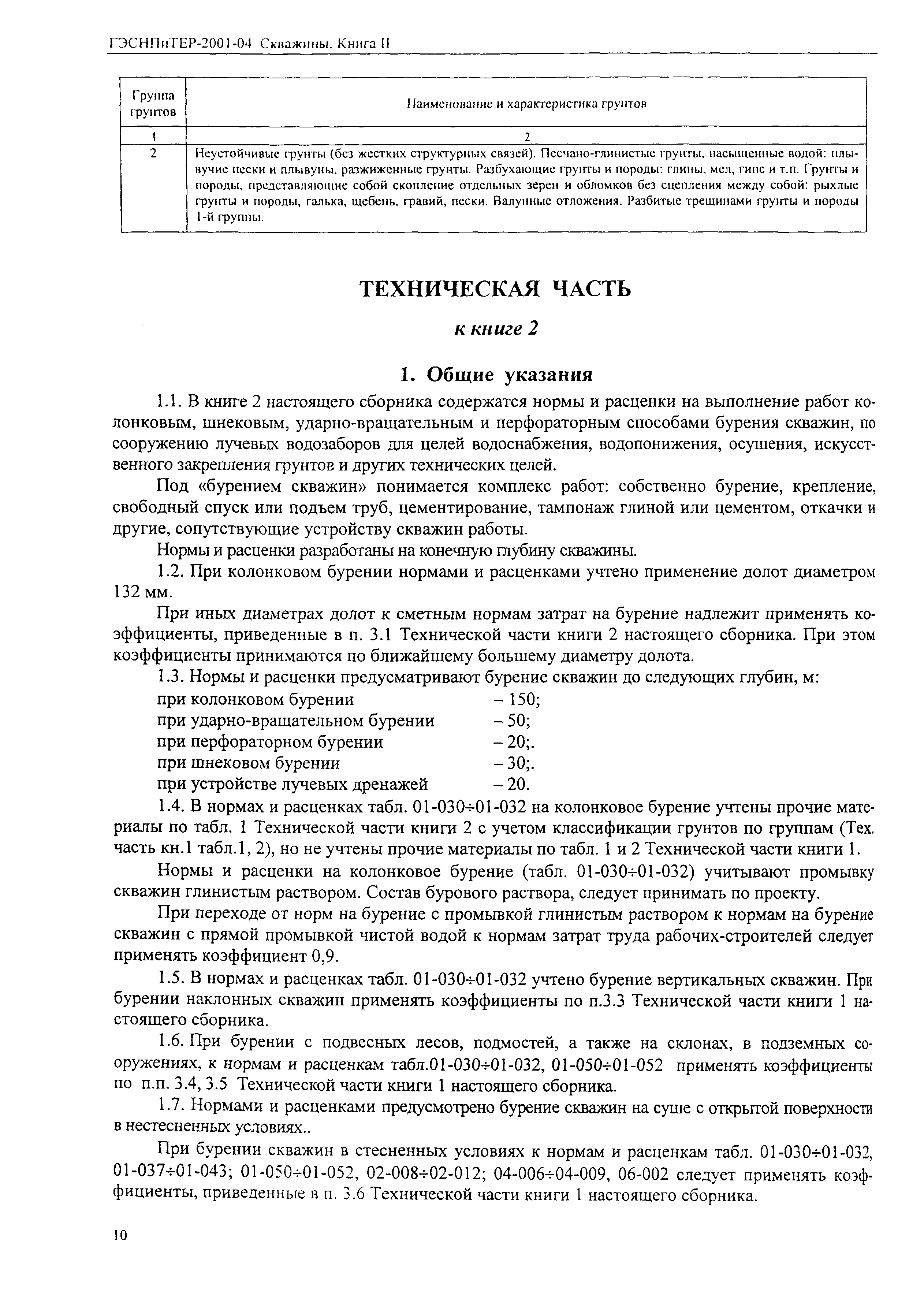| Оглавление: | Техническая часть Общие положения Техническая часть к книге 2 1. Общие указания 2. Правила определения объемов работ 3. Коэффициенты к нормам и расценкам Таблица ГЭСНПиТЕР-2001-04-01-030 Колонковое бурение станками с электродвигателем глубиной бурения до 50 м Таблица ГЭСНПиТЕР-2001-04-01-031 Колонковое бурение станками с электродвигателем глубиной бурения до 100 м Таблица ГЭСНПиТЕР-2001-04-01-032 Колонковое бурение станками с электродвигателем глубиной бурения до 150 м Таблица ГЭСНПиТЕР-2001-04-01-037 Шнековое бурение станками типа ЛБУ-50 глубиной бурения до 10 м Таблица ГЭСНПиТЕР-2001-04-01-038 Шнековое бурение станками типа ЛБУ-50 глубиной бурения до 20 м Таблица ГЭСНПиТЕР-2001-04-01-039 Шнековое бурение станками типа ЛБУ-50 глубиной бурения до 30 м Таблица ГЭСНПиТЕР-2001-04-01-040 Шнековое бурение станками типа СО-2 глубиной бурения до 6 м Таблица ГЭСНПиТЕР-2001-04-01-041 Шнековое бурение станками типа СО-2 глубиной бурения до 12 м Таблица ГЭСНПиТЕР-2001-04-01-042 Шнековое бурение станками типа СО-2 глубиной бурения до 18 м Таблица ГЭСНПиТЕР-2001-04-01-043 Шнековое бурение станками типа СО-2 глубиной бурения до 24 м Таблица ГЭСНПиТЕР-2001-04-01-050 Ударно-вращательное бурение скважин глубиной бурения до 10 м Таблица ГЭСНПиТЕР-2001-04-01-051 Ударно-вращательное бурение скважин глубиной бурения до 20 м Таблица ГЭСНПиТЕР-2001-04-01-052 Ударно-вращательное бурение скважин глубиной бурения до 50 м Таблица ГЭСНПиТЕР-2001-04-01-055 Перфораторное бурение скважин глубиной бурения до 5 м Таблица ГЭСНПиТЕР-2001-04-01-056 Перфораторное бурение скважин глубиной бурения до 10 м Таблица ГЭСНПиТЕР-2001-04-01-057 Перфораторное бурение скважин глубиной бурения до 5 м Таблица ГЭСНПиТЕР-2001-04-01-058 Перфораторное бурение скважин глубиной бурения до 10 м Таблица ГЭСНПиТЕР-2001-04-01-064 Устройство лучевых дренажных скважин длиной до 130 м установкой УЛБ-130 Таблица ГЭСНПиТЕР-2001-04-02-008 Крепление скважины при колонковом бурении трубами с муфтовым соединением Таблица ГЭСНПиТЕР-2001-04-02-009 Крепление скважины при колонковом бурении трубами со сварным соединением Таблица ГЭСНПиТЕР-2001-04-02-010 Крепление скважины при шнековом бурении Таблица ГЭСНПиТЕР-2001-04-02-011 Свободный спуск или подъем обсадных труб в трубах большего диаметра при шнековом бурении Таблица ГЭСНПиТЕР-2001-04-02-012 Установка кондуктора при колонковом бурении Таблица ГЭСНПиТЕР-2001-04-03-004 Цементация затрубного пространства при колонковом бурении Таблица ГЭСНПиТЕР-2001-04-03-005 Подбашмачный тампонаж глиной при колонковом бурении Таблица ГЭСНПиТЕР-2001-04-03-006 Подбашмачный тампонаж цементом при колонковом бурении Таблица ГЭСНПиТЕР-2001-04-04-006 Установка фильтров на колонне водоподъемных труб при колонковом бурении Таблица ГЭСНПиТЕР-2001-04-04-007 Установка фильтров впотай бурильных трубах при колонковом бурении Таблица ГЭСНПиТЕР-2001-04-04-008 Откачка воды из скважины эрлифтом при колонковом бурении Таблица ГЭСНПиТЕР-2001-04-04-009 Откачка воды насосом при колонковом бурении Таблица ГЭСНПиТЕР-2001-04-06-001 Перемещение станка Таблица ГЭСНПиТЕР-2001-04-06-002 Реагентная обработка скважин Приложение |