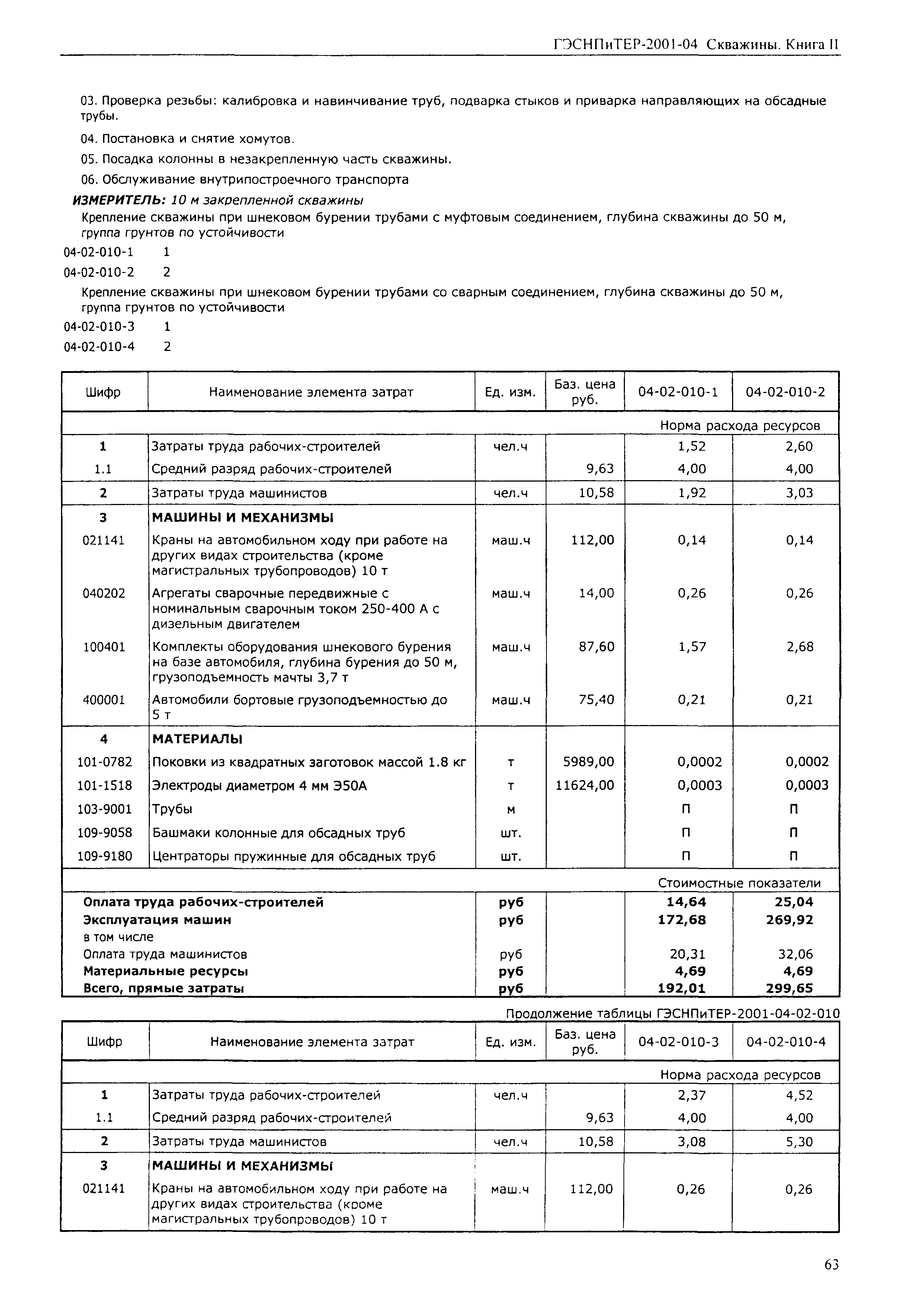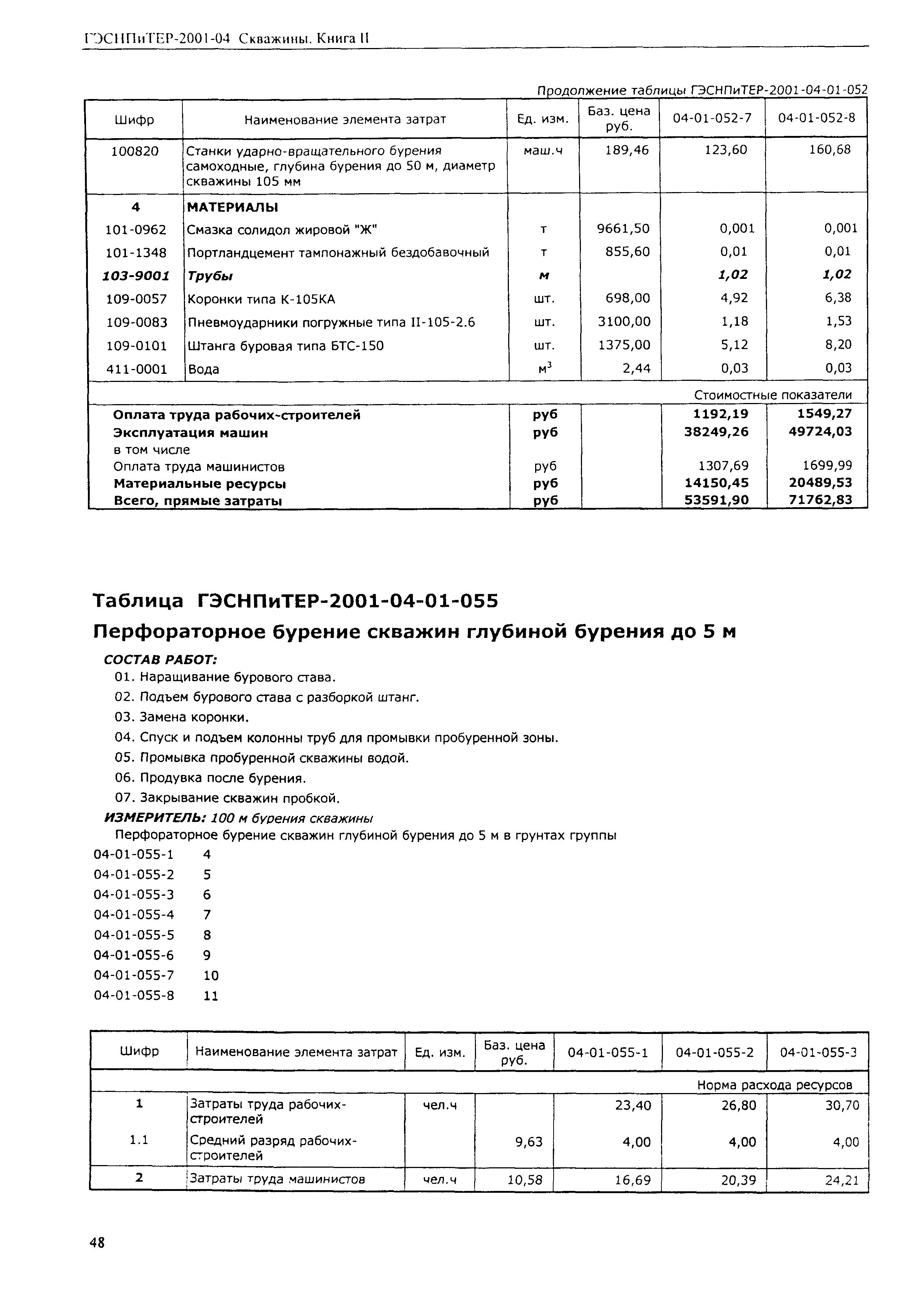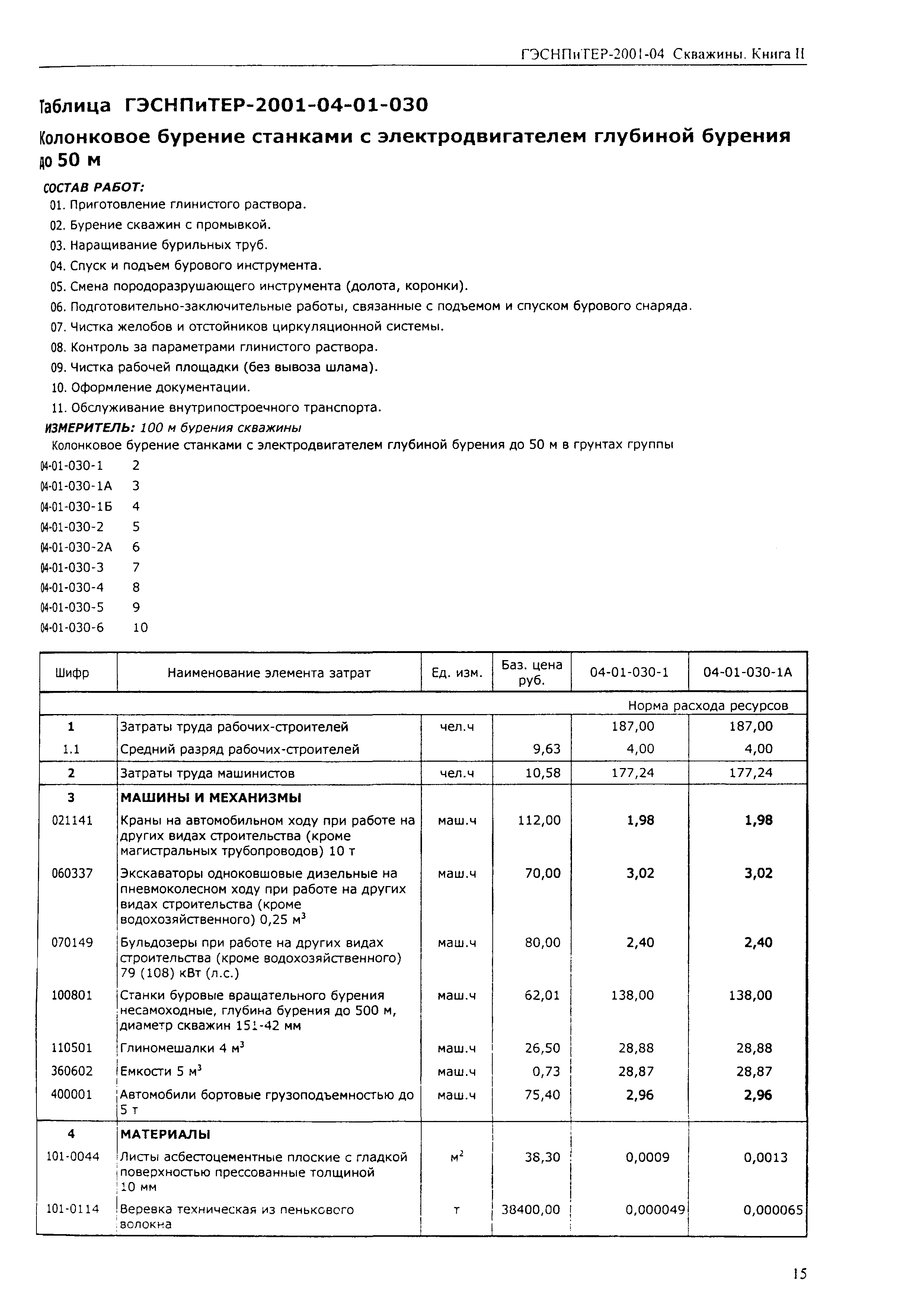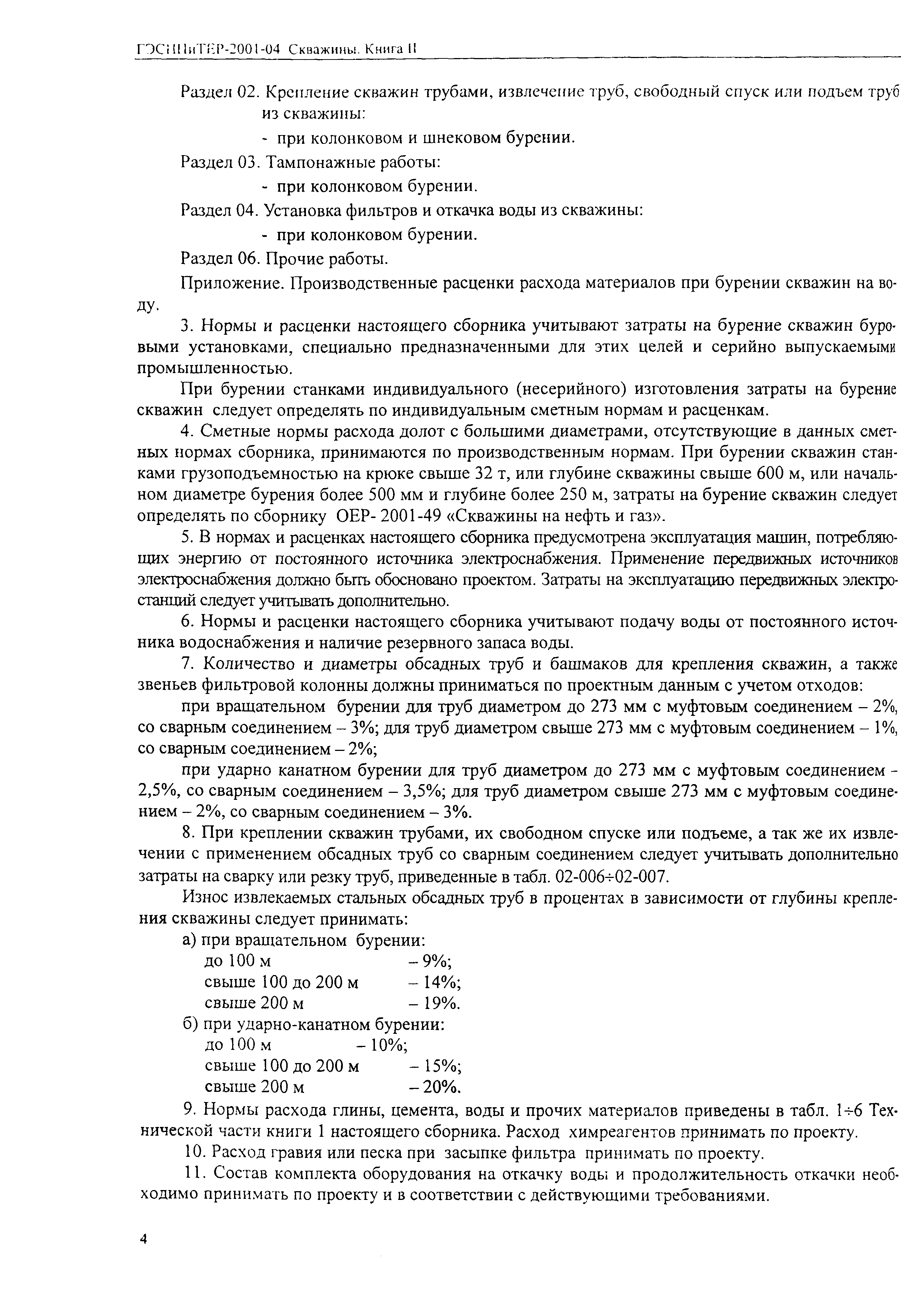 | Оглавление: | Техническая часть Общие положения Техническая часть к книге 2 1. Общие указания 2. Правила определения объемов работ 3. Коэффициенты к нормам и расценкам Таблица ГЭСНПиТЕР-2001-04-01-030 Колонковое бурение станками с электродвигателем глубиной бурения до 50 м Таблица ГЭСНПиТЕР-2001-04-01-031 Колонковое бурение станками с электродвигателем глубиной бурения до 100 м Таблица ГЭСНПиТЕР-2001-04-01-032 Колонковое бурение станками с электродвигателем глубиной бурения до 150 м Таблица ГЭСНПиТЕР-2001-04-01-037 Шнековое бурение станками типа ЛБУ-50 глубиной бурения до 10 м Таблица ГЭСНПиТЕР-2001-04-01-038 Шнековое бурение станками типа ЛБУ-50 глубиной бурения до 20 м Таблица ГЭСНПиТЕР-2001-04-01-039 Шнековое бурение станками типа ЛБУ-50 глубиной бурения до 30 м Таблица ГЭСНПиТЕР-2001-04-01-040 Шнековое бурение станками типа СО-2 глубиной бурения до 6 м Таблица ГЭСНПиТЕР-2001-04-01-041 Шнековое бурение станками типа СО-2 глубиной бурения до 12 м Таблица ГЭСНПиТЕР-2001-04-01-042 Шнековое бурение станками типа СО-2 глубиной бурения до 18 м Таблица ГЭСНПиТЕР-2001-04-01-043 Шнековое бурение станками типа СО-2 глубиной бурения до 24 м Таблица ГЭСНПиТЕР-2001-04-01-050 Ударно-вращательное бурение скважин глубиной бурения до 10 м Таблица ГЭСНПиТЕР-2001-04-01-051 Ударно-вращательное бурение скважин глубиной бурения до 20 м Таблица ГЭСНПиТЕР-2001-04-01-052 Ударно-вращательное бурение скважин глубиной бурения до 50 м Таблица ГЭСНПиТЕР-2001-04-01-055 Перфораторное бурение скважин глубиной бурения до 5 м Таблица ГЭСНПиТЕР-2001-04-01-056 Перфораторное бурение скважин глубиной бурения до 10 м Таблица ГЭСНПиТЕР-2001-04-01-057 Перфораторное бурение скважин глубиной бурения до 5 м Таблица ГЭСНПиТЕР-2001-04-01-058 Перфораторное бурение скважин глубиной бурения до 10 м Таблица ГЭСНПиТЕР-2001-04-01-064 Устройство лучевых дренажных скважин длиной до 130 м установкой УЛБ-130 Таблица ГЭСНПиТЕР-2001-04-02-008 Крепление скважины при колонковом бурении трубами с муфтовым соединением Таблица ГЭСНПиТЕР-2001-04-02-009 Крепление скважины при колонковом бурении трубами со сварным соединением Таблица ГЭСНПиТЕР-2001-04-02-010 Крепление скважины при шнековом бурении Таблица ГЭСНПиТЕР-2001-04-02-011 Свободный спуск или подъем обсадных труб в трубах большего диаметра при шнековом бурении Таблица ГЭСНПиТЕР-2001-04-02-012 Установка кондуктора при колонковом бурении Таблица ГЭСНПиТЕР-2001-04-03-004 Цементация затрубного пространства при колонковом бурении Таблица ГЭСНПиТЕР-2001-04-03-005 Подбашмачный тампонаж глиной при колонковом бурении Таблица ГЭСНПиТЕР-2001-04-03-006 Подбашмачный тампонаж цементом при колонковом бурении Таблица ГЭСНПиТЕР-2001-04-04-006 Установка фильтров на колонне водоподъемных труб при колонковом бурении Таблица ГЭСНПиТЕР-2001-04-04-007 Установка фильтров впотай бурильных трубах при колонковом бурении Таблица ГЭСНПиТЕР-2001-04-04-008 Откачка воды из скважины эрлифтом при колонковом бурении Таблица ГЭСНПиТЕР-2001-04-04-009 Откачка воды насосом при колонковом бурении Таблица ГЭСНПиТЕР-2001-04-06-001 Перемещение станка Таблица ГЭСНПиТЕР-2001-04-06-002 Реагентная обработка скважин Приложение |