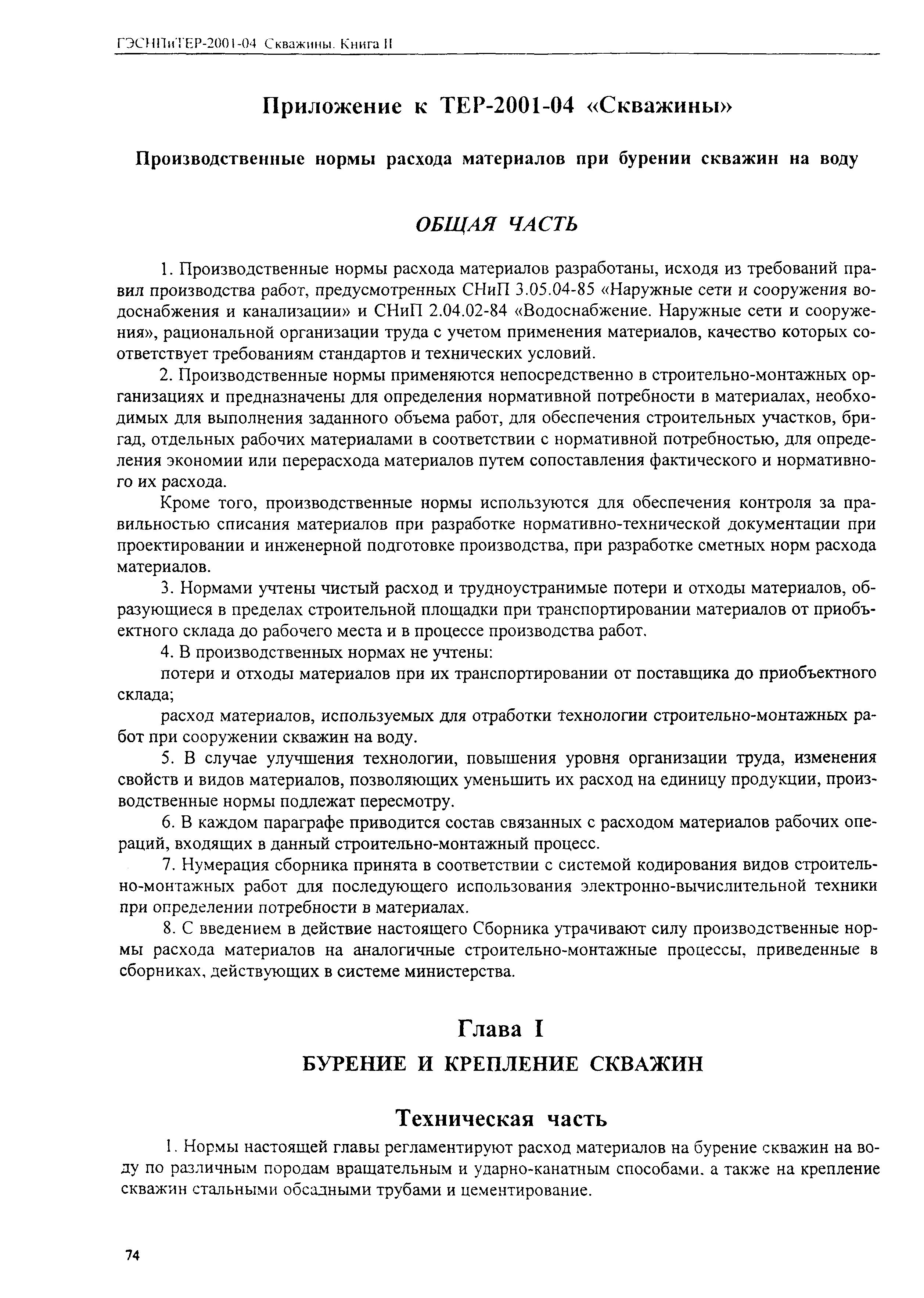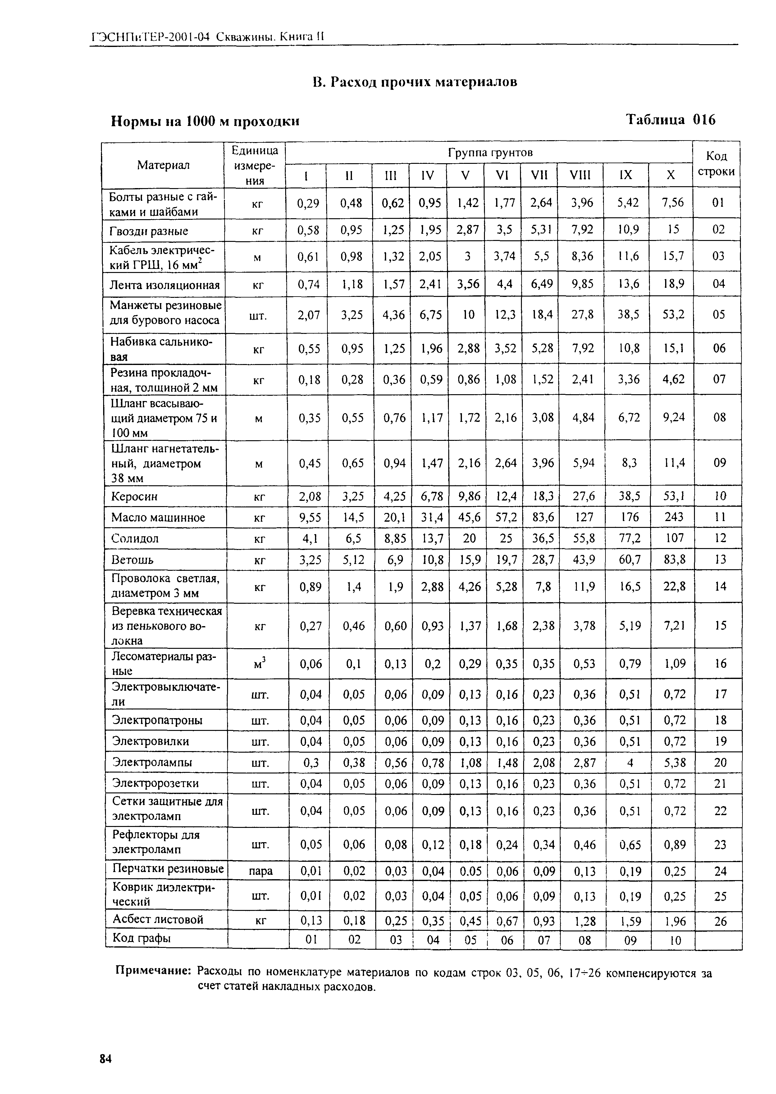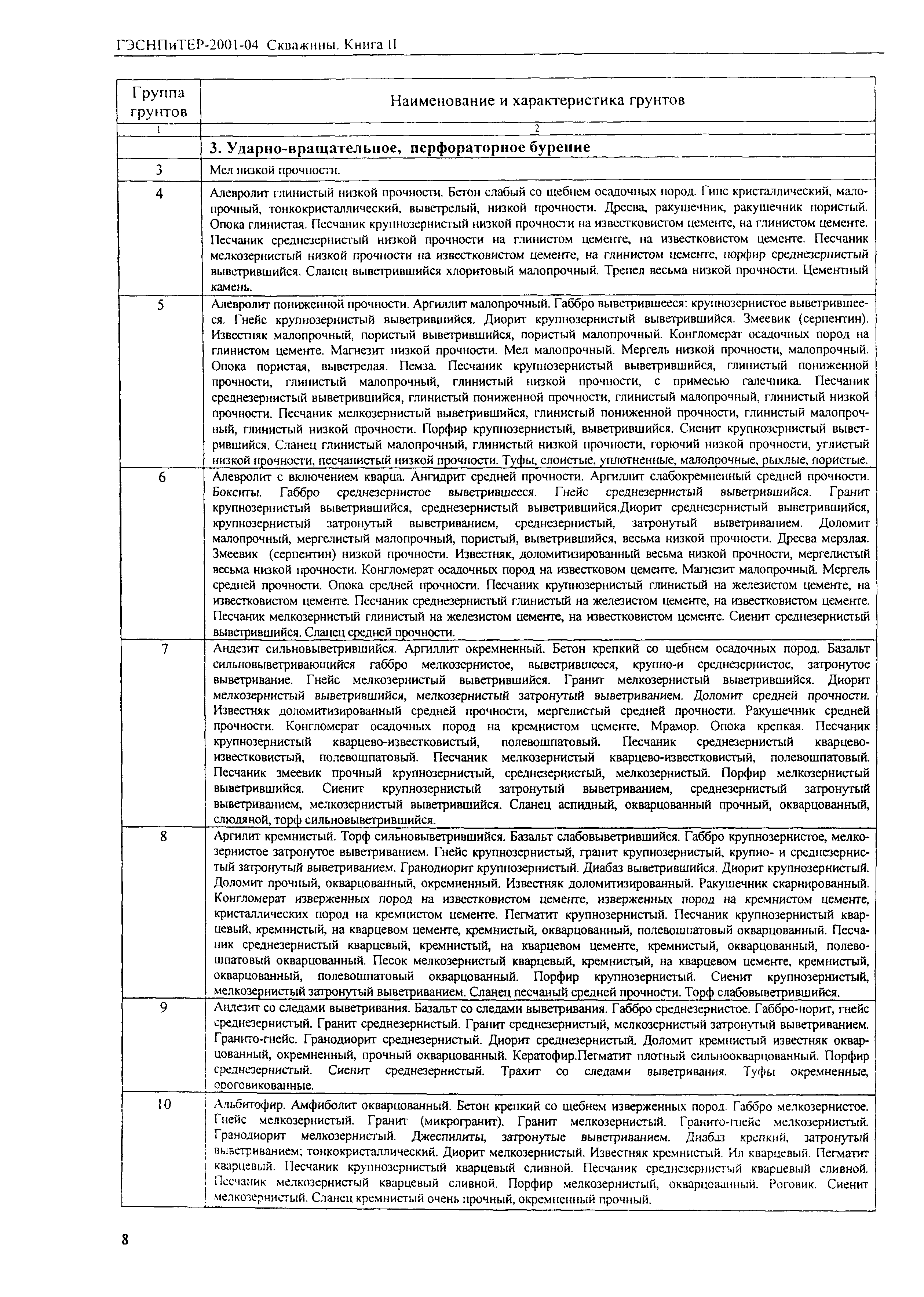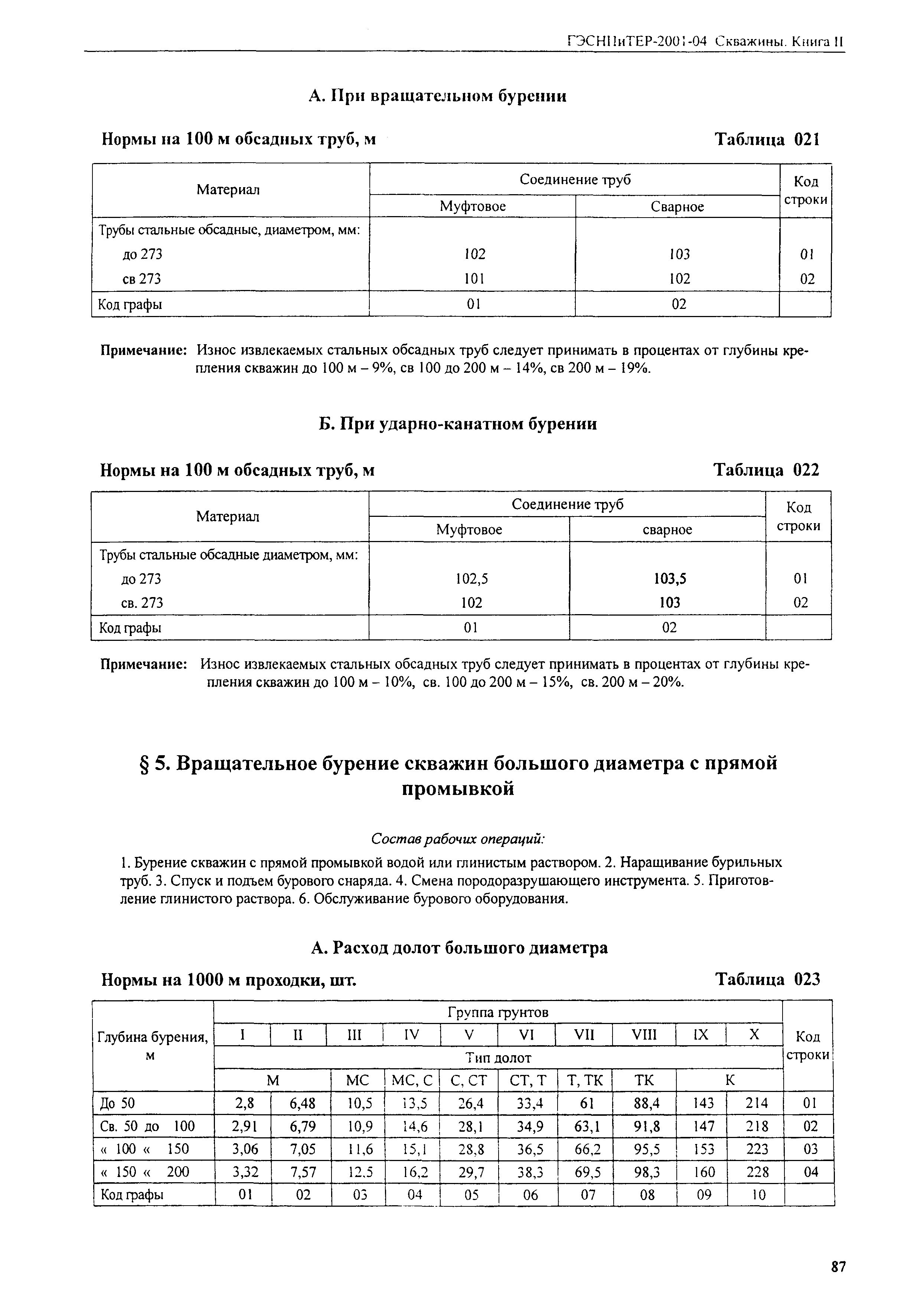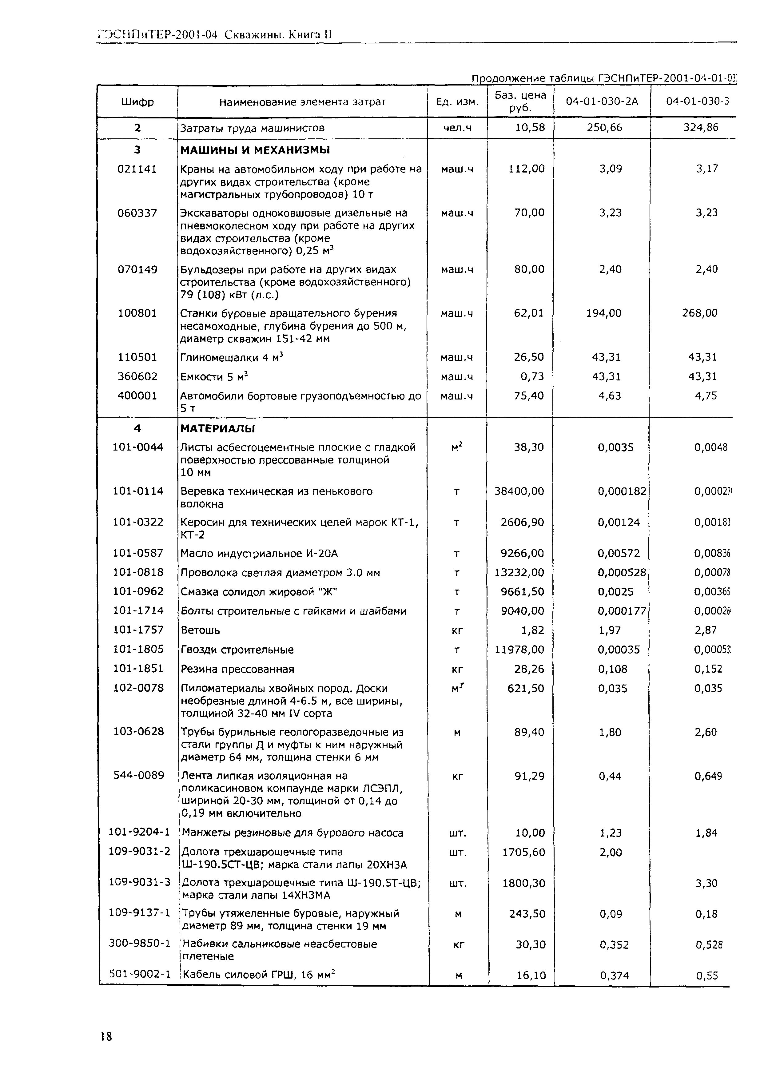 | Оглавление: | Техническая часть Общие положения Техническая часть к книге 2 1. Общие указания 2. Правила определения объемов работ 3. Коэффициенты к нормам и расценкам Таблица ГЭСНПиТЕР-2001-04-01-030 Колонковое бурение станками с электродвигателем глубиной бурения до 50 м Таблица ГЭСНПиТЕР-2001-04-01-031 Колонковое бурение станками с электродвигателем глубиной бурения до 100 м Таблица ГЭСНПиТЕР-2001-04-01-032 Колонковое бурение станками с электродвигателем глубиной бурения до 150 м Таблица ГЭСНПиТЕР-2001-04-01-037 Шнековое бурение станками типа ЛБУ-50 глубиной бурения до 10 м Таблица ГЭСНПиТЕР-2001-04-01-038 Шнековое бурение станками типа ЛБУ-50 глубиной бурения до 20 м Таблица ГЭСНПиТЕР-2001-04-01-039 Шнековое бурение станками типа ЛБУ-50 глубиной бурения до 30 м Таблица ГЭСНПиТЕР-2001-04-01-040 Шнековое бурение станками типа СО-2 глубиной бурения до 6 м Таблица ГЭСНПиТЕР-2001-04-01-041 Шнековое бурение станками типа СО-2 глубиной бурения до 12 м Таблица ГЭСНПиТЕР-2001-04-01-042 Шнековое бурение станками типа СО-2 глубиной бурения до 18 м Таблица ГЭСНПиТЕР-2001-04-01-043 Шнековое бурение станками типа СО-2 глубиной бурения до 24 м Таблица ГЭСНПиТЕР-2001-04-01-050 Ударно-вращательное бурение скважин глубиной бурения до 10 м Таблица ГЭСНПиТЕР-2001-04-01-051 Ударно-вращательное бурение скважин глубиной бурения до 20 м Таблица ГЭСНПиТЕР-2001-04-01-052 Ударно-вращательное бурение скважин глубиной бурения до 50 м Таблица ГЭСНПиТЕР-2001-04-01-055 Перфораторное бурение скважин глубиной бурения до 5 м Таблица ГЭСНПиТЕР-2001-04-01-056 Перфораторное бурение скважин глубиной бурения до 10 м Таблица ГЭСНПиТЕР-2001-04-01-057 Перфораторное бурение скважин глубиной бурения до 5 м Таблица ГЭСНПиТЕР-2001-04-01-058 Перфораторное бурение скважин глубиной бурения до 10 м Таблица ГЭСНПиТЕР-2001-04-01-064 Устройство лучевых дренажных скважин длиной до 130 м установкой УЛБ-130 Таблица ГЭСНПиТЕР-2001-04-02-008 Крепление скважины при колонковом бурении трубами с муфтовым соединением Таблица ГЭСНПиТЕР-2001-04-02-009 Крепление скважины при колонковом бурении трубами со сварным соединением Таблица ГЭСНПиТЕР-2001-04-02-010 Крепление скважины при шнековом бурении Таблица ГЭСНПиТЕР-2001-04-02-011 Свободный спуск или подъем обсадных труб в трубах большего диаметра при шнековом бурении Таблица ГЭСНПиТЕР-2001-04-02-012 Установка кондуктора при колонковом бурении Таблица ГЭСНПиТЕР-2001-04-03-004 Цементация затрубного пространства при колонковом бурении Таблица ГЭСНПиТЕР-2001-04-03-005 Подбашмачный тампонаж глиной при колонковом бурении Таблица ГЭСНПиТЕР-2001-04-03-006 Подбашмачный тампонаж цементом при колонковом бурении Таблица ГЭСНПиТЕР-2001-04-04-006 Установка фильтров на колонне водоподъемных труб при колонковом бурении Таблица ГЭСНПиТЕР-2001-04-04-007 Установка фильтров впотай бурильных трубах при колонковом бурении Таблица ГЭСНПиТЕР-2001-04-04-008 Откачка воды из скважины эрлифтом при колонковом бурении Таблица ГЭСНПиТЕР-2001-04-04-009 Откачка воды насосом при колонковом бурении Таблица ГЭСНПиТЕР-2001-04-06-001 Перемещение станка Таблица ГЭСНПиТЕР-2001-04-06-002 Реагентная обработка скважин Приложение |
