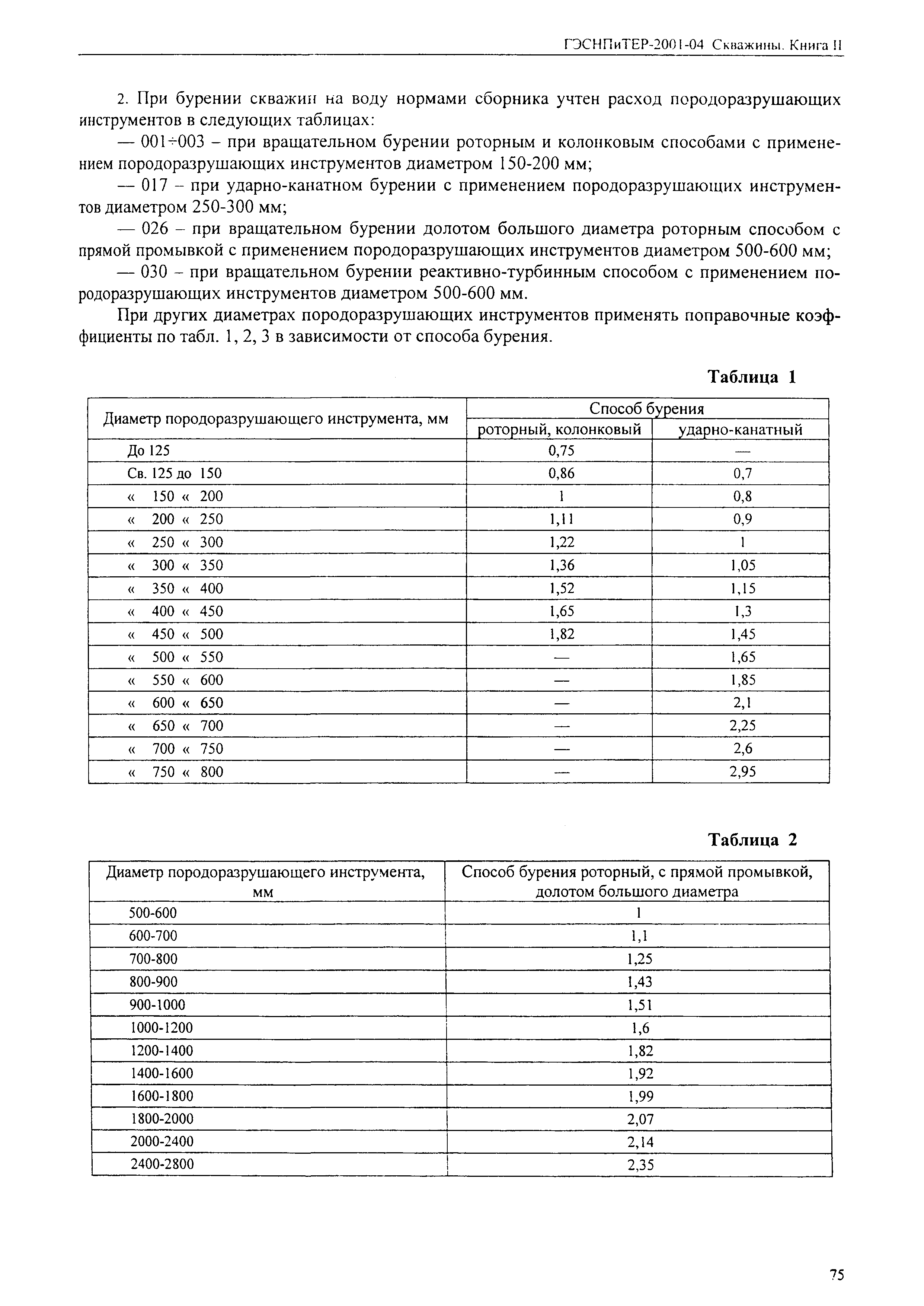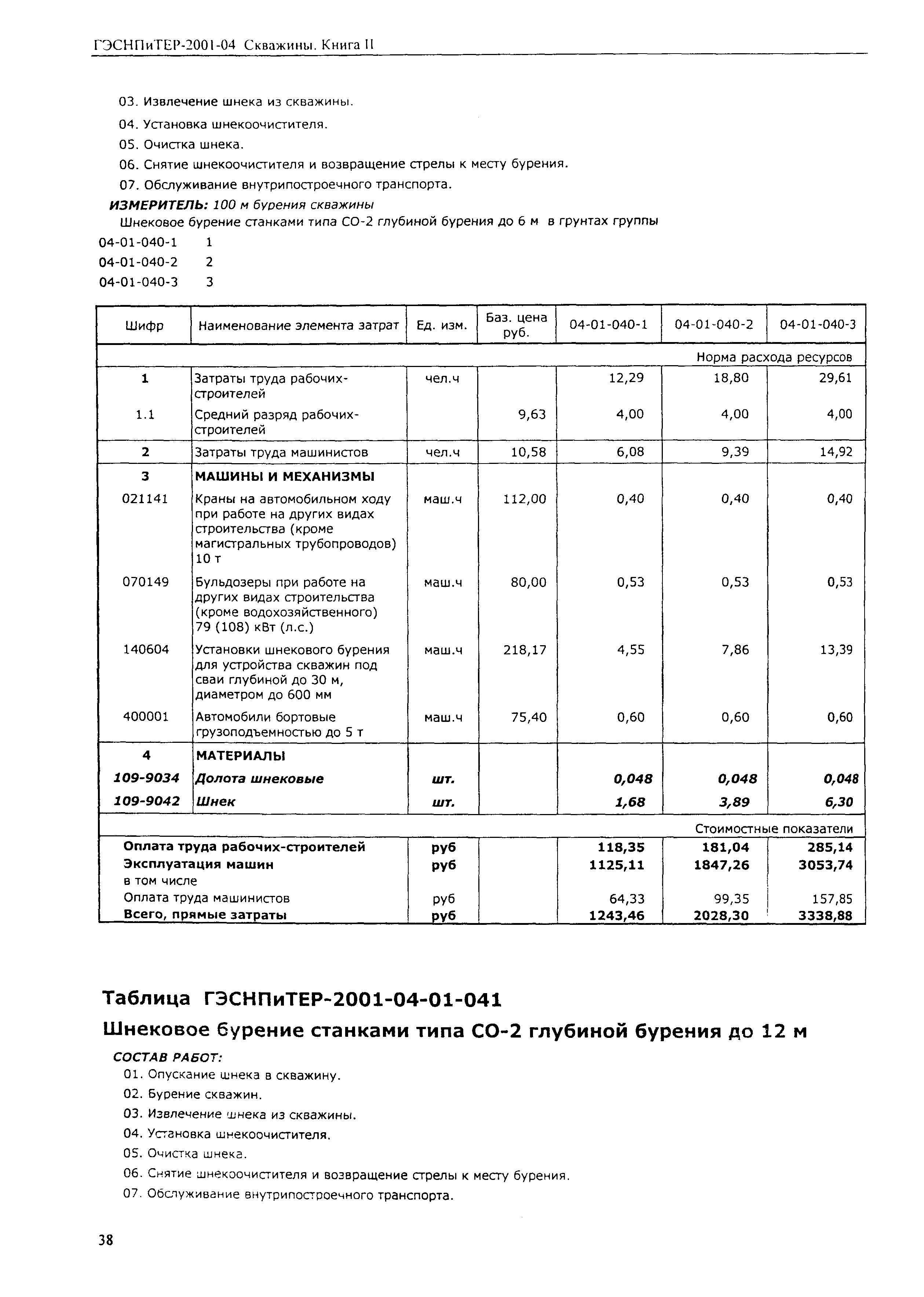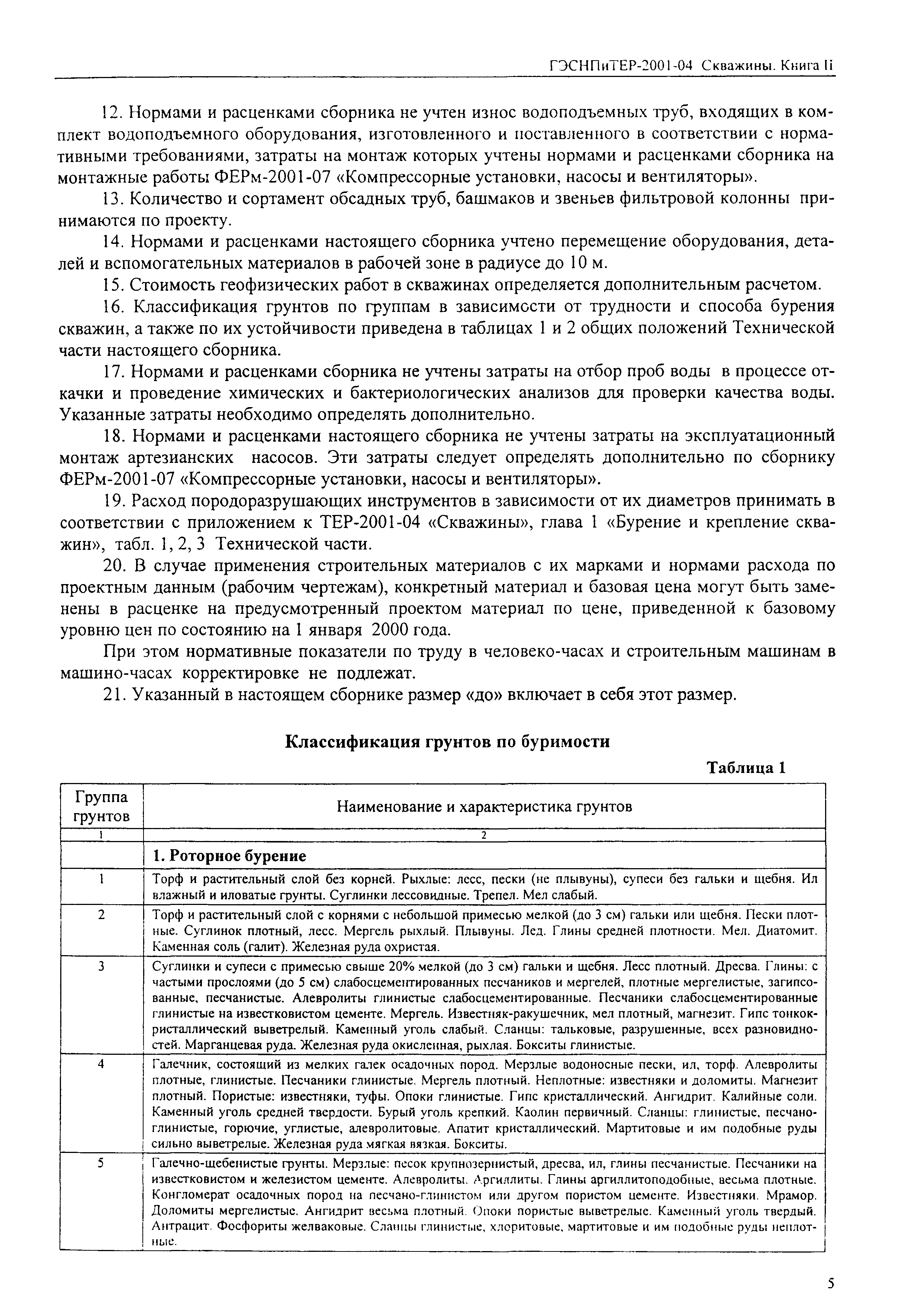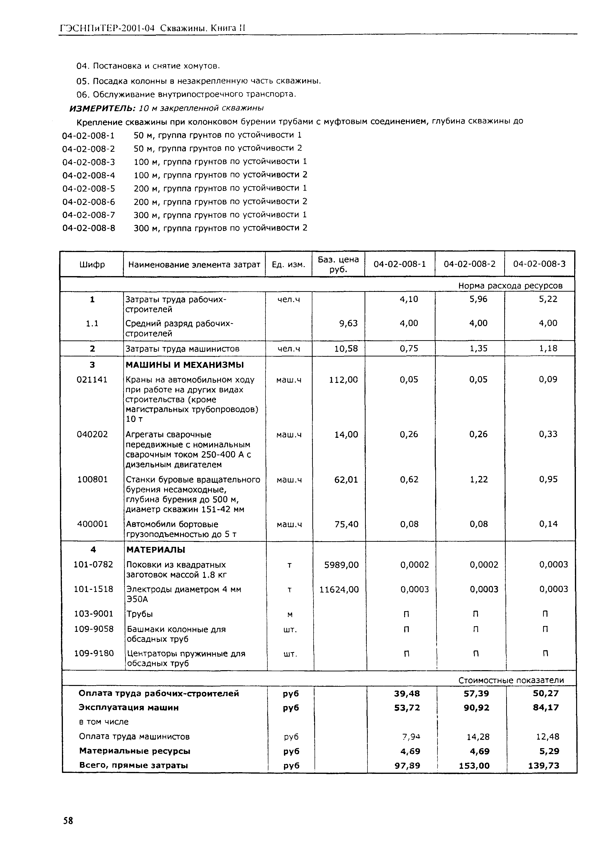 | Оглавление: | Техническая часть Общие положения Техническая часть к книге 2 1. Общие указания 2. Правила определения объемов работ 3. Коэффициенты к нормам и расценкам Таблица ГЭСНПиТЕР-2001-04-01-030 Колонковое бурение станками с электродвигателем глубиной бурения до 50 м Таблица ГЭСНПиТЕР-2001-04-01-031 Колонковое бурение станками с электродвигателем глубиной бурения до 100 м Таблица ГЭСНПиТЕР-2001-04-01-032 Колонковое бурение станками с электродвигателем глубиной бурения до 150 м Таблица ГЭСНПиТЕР-2001-04-01-037 Шнековое бурение станками типа ЛБУ-50 глубиной бурения до 10 м Таблица ГЭСНПиТЕР-2001-04-01-038 Шнековое бурение станками типа ЛБУ-50 глубиной бурения до 20 м Таблица ГЭСНПиТЕР-2001-04-01-039 Шнековое бурение станками типа ЛБУ-50 глубиной бурения до 30 м Таблица ГЭСНПиТЕР-2001-04-01-040 Шнековое бурение станками типа СО-2 глубиной бурения до 6 м Таблица ГЭСНПиТЕР-2001-04-01-041 Шнековое бурение станками типа СО-2 глубиной бурения до 12 м Таблица ГЭСНПиТЕР-2001-04-01-042 Шнековое бурение станками типа СО-2 глубиной бурения до 18 м Таблица ГЭСНПиТЕР-2001-04-01-043 Шнековое бурение станками типа СО-2 глубиной бурения до 24 м Таблица ГЭСНПиТЕР-2001-04-01-050 Ударно-вращательное бурение скважин глубиной бурения до 10 м Таблица ГЭСНПиТЕР-2001-04-01-051 Ударно-вращательное бурение скважин глубиной бурения до 20 м Таблица ГЭСНПиТЕР-2001-04-01-052 Ударно-вращательное бурение скважин глубиной бурения до 50 м Таблица ГЭСНПиТЕР-2001-04-01-055 Перфораторное бурение скважин глубиной бурения до 5 м Таблица ГЭСНПиТЕР-2001-04-01-056 Перфораторное бурение скважин глубиной бурения до 10 м Таблица ГЭСНПиТЕР-2001-04-01-057 Перфораторное бурение скважин глубиной бурения до 5 м Таблица ГЭСНПиТЕР-2001-04-01-058 Перфораторное бурение скважин глубиной бурения до 10 м Таблица ГЭСНПиТЕР-2001-04-01-064 Устройство лучевых дренажных скважин длиной до 130 м установкой УЛБ-130 Таблица ГЭСНПиТЕР-2001-04-02-008 Крепление скважины при колонковом бурении трубами с муфтовым соединением Таблица ГЭСНПиТЕР-2001-04-02-009 Крепление скважины при колонковом бурении трубами со сварным соединением Таблица ГЭСНПиТЕР-2001-04-02-010 Крепление скважины при шнековом бурении Таблица ГЭСНПиТЕР-2001-04-02-011 Свободный спуск или подъем обсадных труб в трубах большего диаметра при шнековом бурении Таблица ГЭСНПиТЕР-2001-04-02-012 Установка кондуктора при колонковом бурении Таблица ГЭСНПиТЕР-2001-04-03-004 Цементация затрубного пространства при колонковом бурении Таблица ГЭСНПиТЕР-2001-04-03-005 Подбашмачный тампонаж глиной при колонковом бурении Таблица ГЭСНПиТЕР-2001-04-03-006 Подбашмачный тампонаж цементом при колонковом бурении Таблица ГЭСНПиТЕР-2001-04-04-006 Установка фильтров на колонне водоподъемных труб при колонковом бурении Таблица ГЭСНПиТЕР-2001-04-04-007 Установка фильтров впотай бурильных трубах при колонковом бурении Таблица ГЭСНПиТЕР-2001-04-04-008 Откачка воды из скважины эрлифтом при колонковом бурении Таблица ГЭСНПиТЕР-2001-04-04-009 Откачка воды насосом при колонковом бурении Таблица ГЭСНПиТЕР-2001-04-06-001 Перемещение станка Таблица ГЭСНПиТЕР-2001-04-06-002 Реагентная обработка скважин Приложение |