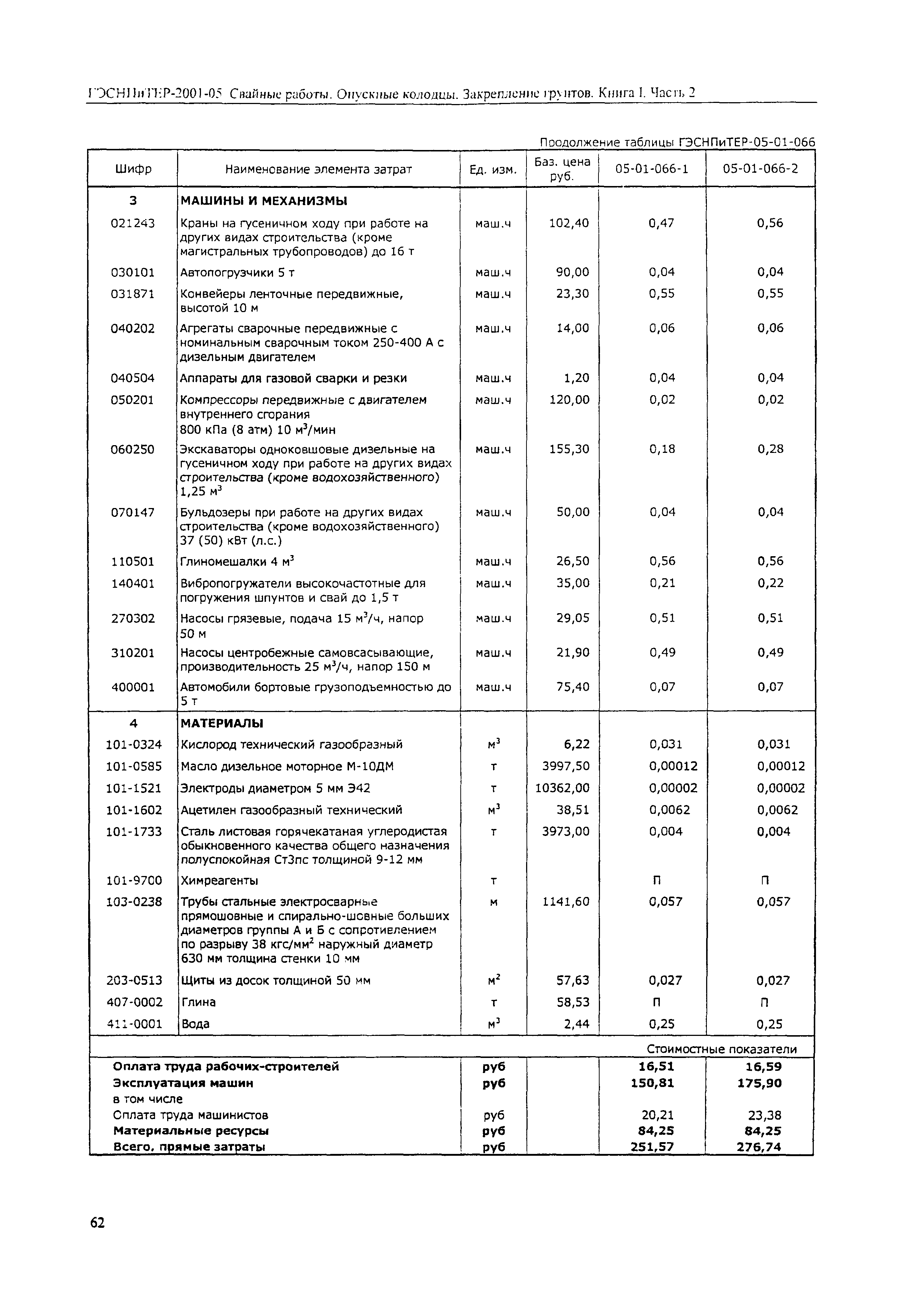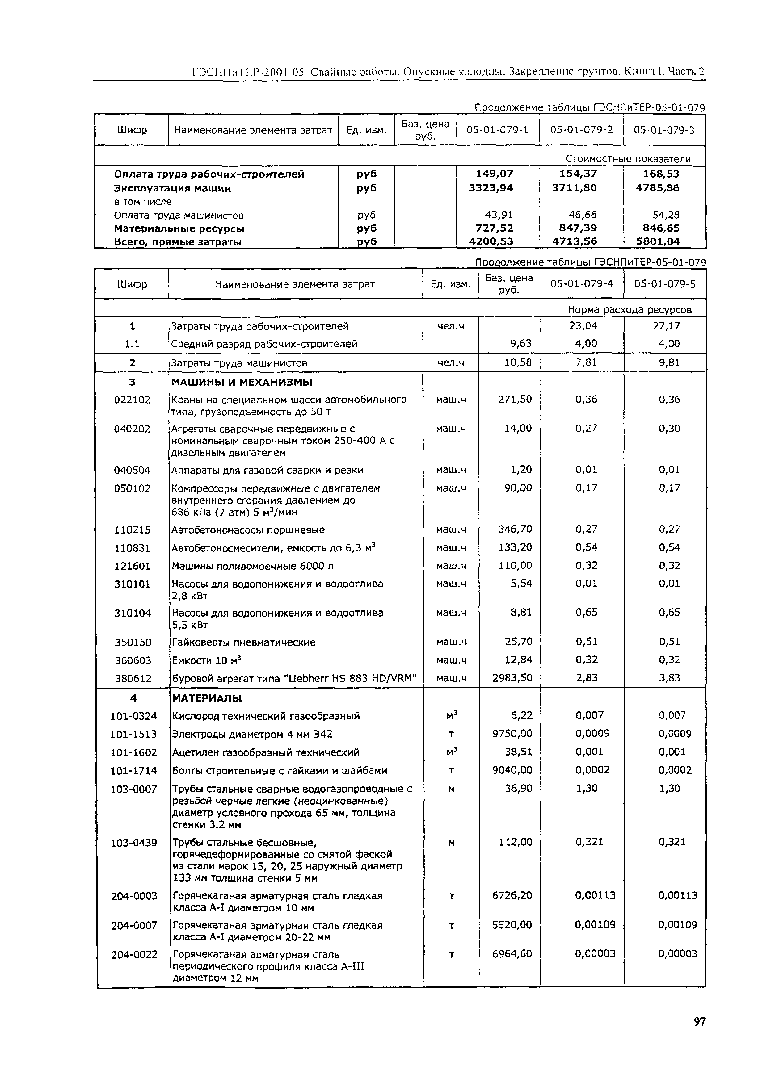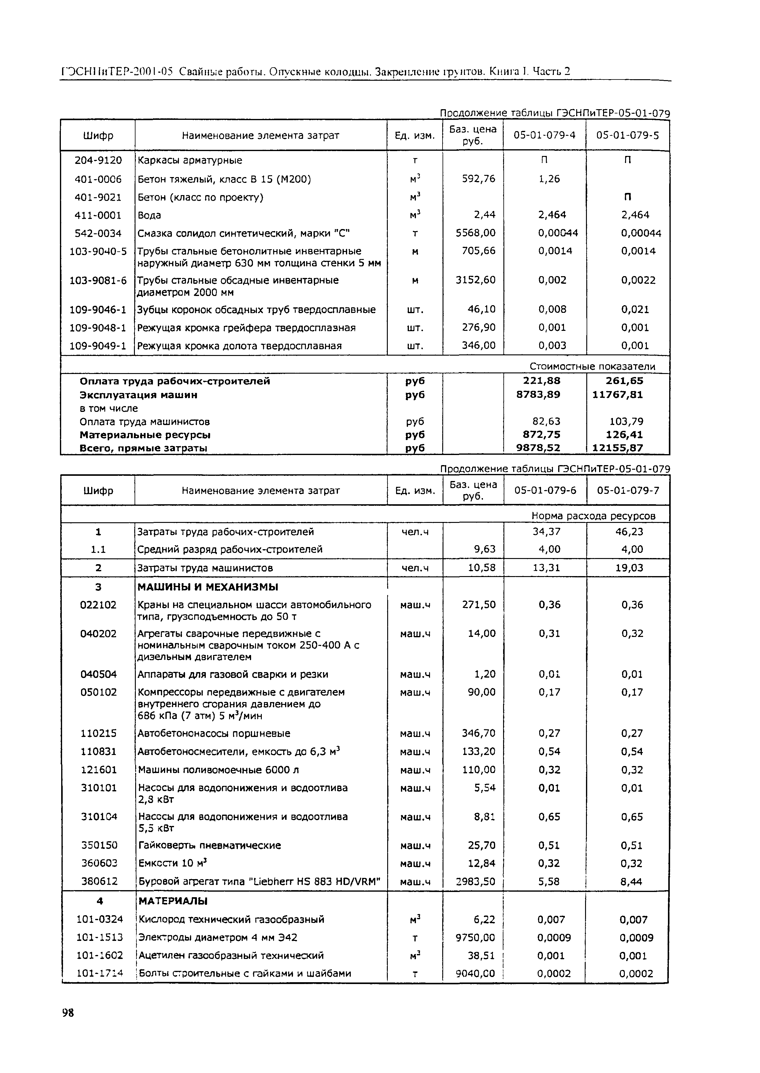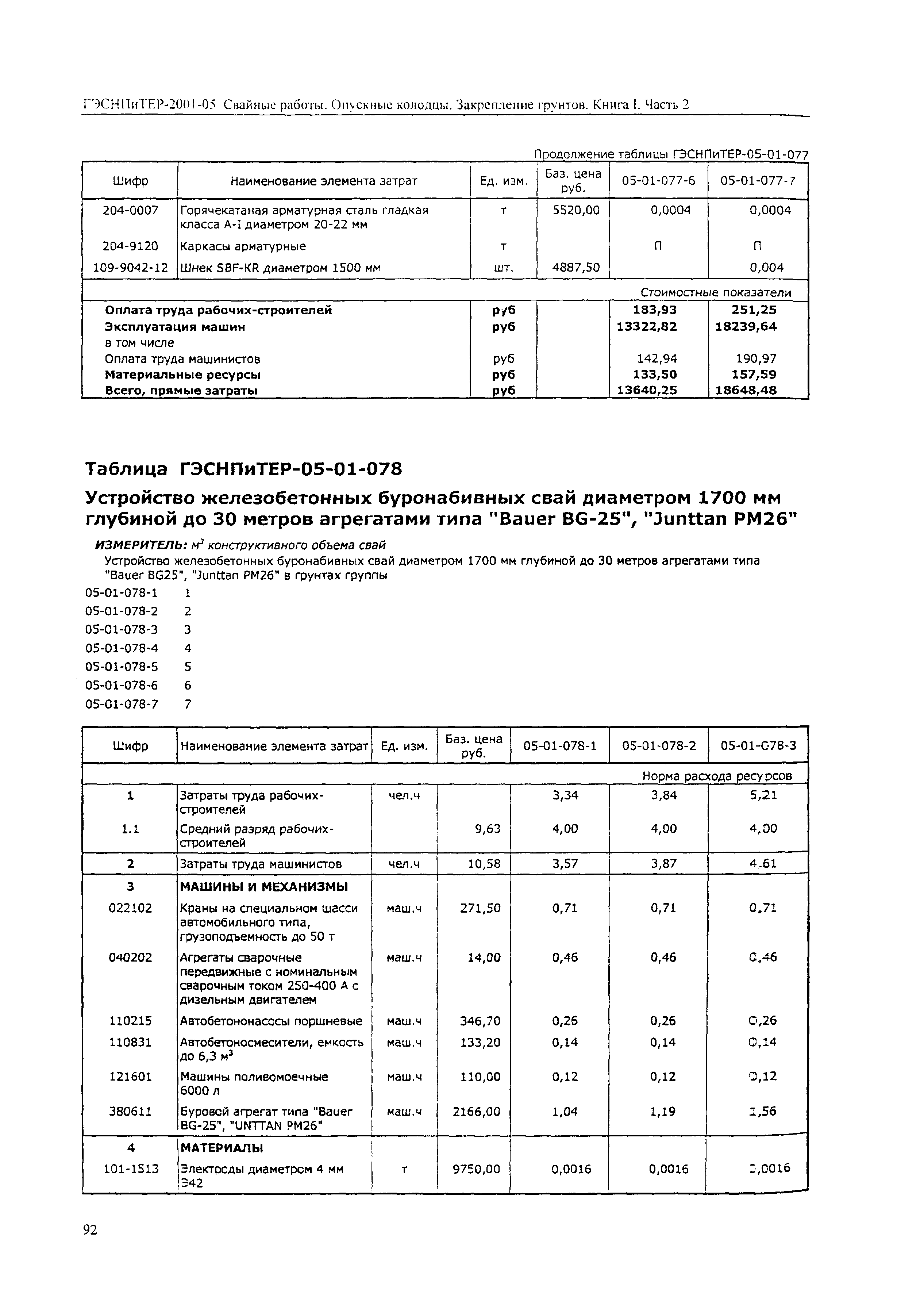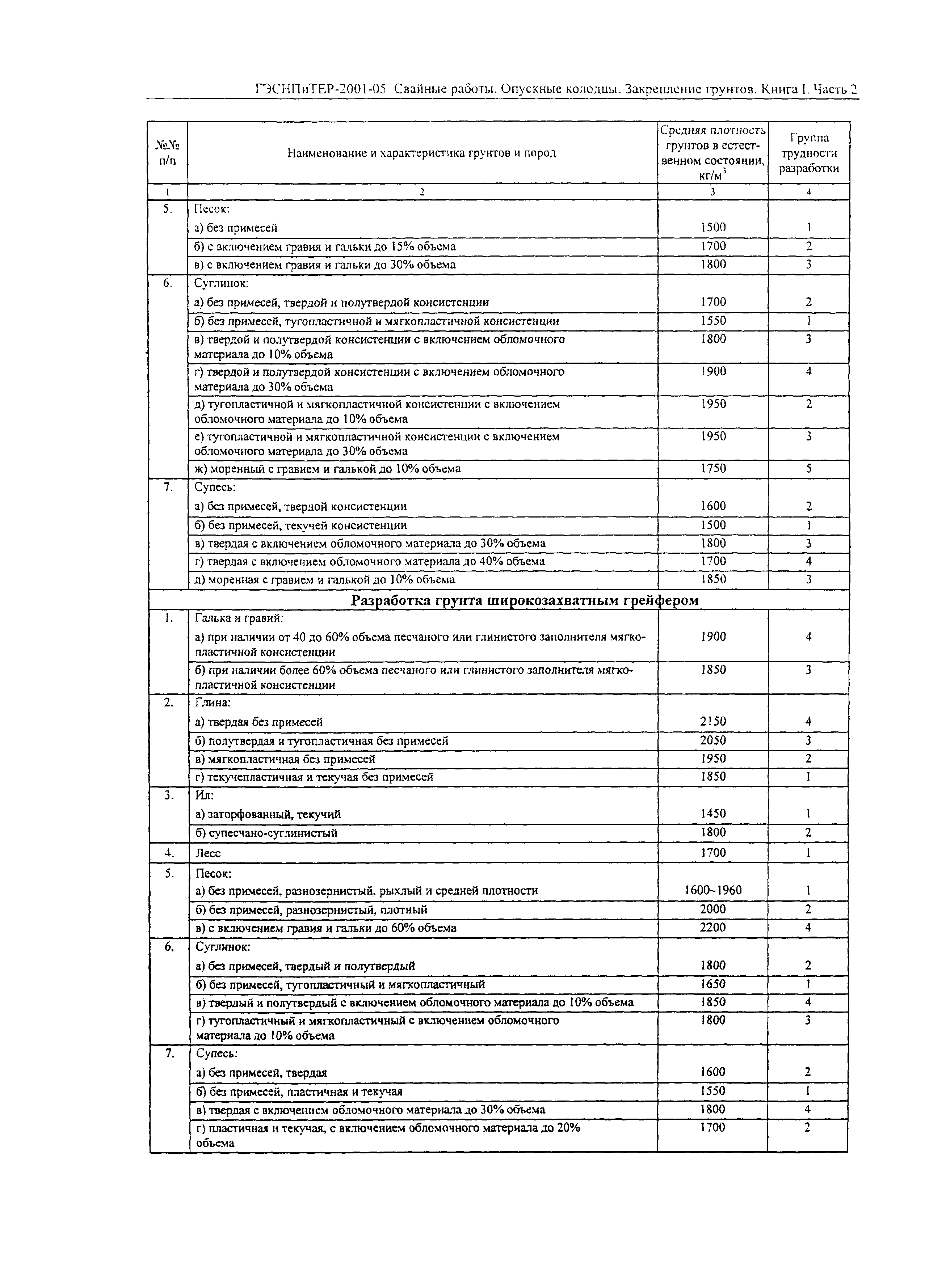 | Оглавление: | Техническая часть 1. Общие указания Раздел 01. Свайные работы Техническая часть 1. Общие указания 2. Правила исчисления объемов работ 3. Коэффициенты к нормам и расценкам Раздел 02. Опускные колодцы Техническая часть 1. Общие указания 2. Правила исчисления объемов работ 3. Коэффициенты к нормам и расценкам Раздел 03. Закрепление грунтов Техническая часть 1. Общие указания 2. Правила исчисления объемов работ 3. Коэффициенты к нормам и расценкам Продолжение раздела 01 - Свайные работы Таблица ГЭСНПиТЕР-05-01-052 Бурение скважин диаметром 250 мм вращательным (роторным) способом Таблица ГЭСНПиТЕР-05-01-053 Бурение скважин диаметром 300 мм вращательным (роторным) способом Таблица ГЭСНПиТЕР-05-01-054 Бурение скважин диаметром 350 мм вращательным (роторным) способом Таблица ГЭСНПиТЕР-05-01-055 Бурение скважин диаметром 450 мм вращательным (роторным) способом Таблица ГЭСНПиТЕР-05-01-056 Бурение скважин диаметром 500 мм вращательным (роторным) способом Таблица ГЭСНПиТЕР-05-01-057 Бурение скважин диаметром 600 мм вращательным (роторным) способом Таблица ГЭСНПиТЕР-05-01-058 Бурение скважин диаметром 700 мм вращательным (роторным) способом Таблица ГЭСНПиТЕР-05-01-059 Бурение скважин вращательным (ковшевым) способом Таблица ГЭСНПиТЕР-05-01-060 Бурение уширения основания скважины для буронабивных железобетонных свай Таблица ГЭСНПиТЕР-05-01-061 Установка в скважину арматурного каркаса Таблица ГЭСНПиТЕР-05-01-062 Бетонирование свай Таблица ГЭСНПиТЕР-05-01-063 Заполнение раствором пустот между стенкой скважины и телом сваи Таблица ГЭСНПиТЕР-05-01-064 Разработки траншей глубиной до 10 м и установкой с плоским грейфером Таблица ГЭСНПиТЕР-05-01-065 Разработка траншей глубиной до 15 м установкой с плоским Таблица ГЭСНПиТЕР-05-01-066 Разборка траншей глубиной до 7 м экскаватором "обратная лопата" Таблица ГЭСНПиТЕР-05-01-067 Устройство траншей под глинистым раствором шириной 0,5 м, глубиной 20 м широкозахватным грейфером на базе экскаватора Таблица ГЭСНПиТЕР-05-01-068 Устройство траншей под глинистым раствором шириной 0,5 м, глубиной до 50 м барражной машиной Таблица ГЭСНПиТЕР-05-01-069 Укладка в траншею противофильтрационных материалов Таблица ГЭСНПиТЕР-05-01-070 Устройство завес Таблица ГЭСНПиТЕР-05-01-071 Наращивание железобетонных свай и панелей Таблица ГЭСНПиТЕР-05-01-072 Установка и извлечение железобетонных ограничителей захваток Таблица ГЭСНПиТЕР-05-01-074 Устройство железобетонных буронабивных свай диаметром 800 мм глубиной до 30 метров агрегатами типа "Ваuеr ВG-25", "Junttаn РМ26" Таблица ГЭСНПиТЕР-05-01-075 Устройство железобетонных буронабивных свай диаметром 1000 мм глубиной до 30 метров агрегатами типа "Ваuеr ВG-25", "Junttаn РМ26" Таблица ГЭСНПиТЕР-05-01-076 Устройство железобетонных буронабивных свай диаметром 1200 мм глубиной до 30 метров агрегатами типа "Ваuеr ВG-25", "Junttаn РМ26" Таблица ГЭСНПиТЕР-05-01-077 Устройство железобетонных буронабивных свай диаметром 1500 мм глубиной до 30 метров агрегатами типа "Ваuеr ВG-25", "Junttаn РМ26" Таблица ГЭСНПиТЕР-05-01-078 Устройство железобетонных буронабивных свай диаметром 1700 мм глубиной до 30 метров агрегатами типа "Ваuеr ВG-25", "Junttаn РМ26" Таблица ГЭСНПиТЕР-05-01-095 Установка железобетонных свай в скважины Таблица ГЭСНПиТЕР-05-01-096 Установка деревометаллических и деревянных свай в готовые скважины Таблица ГЭСНПиТЕР-05-01-097 Погружение железобетонных и стальных свай с предварительным оттаиванием грунта паровыми иглами Таблиц