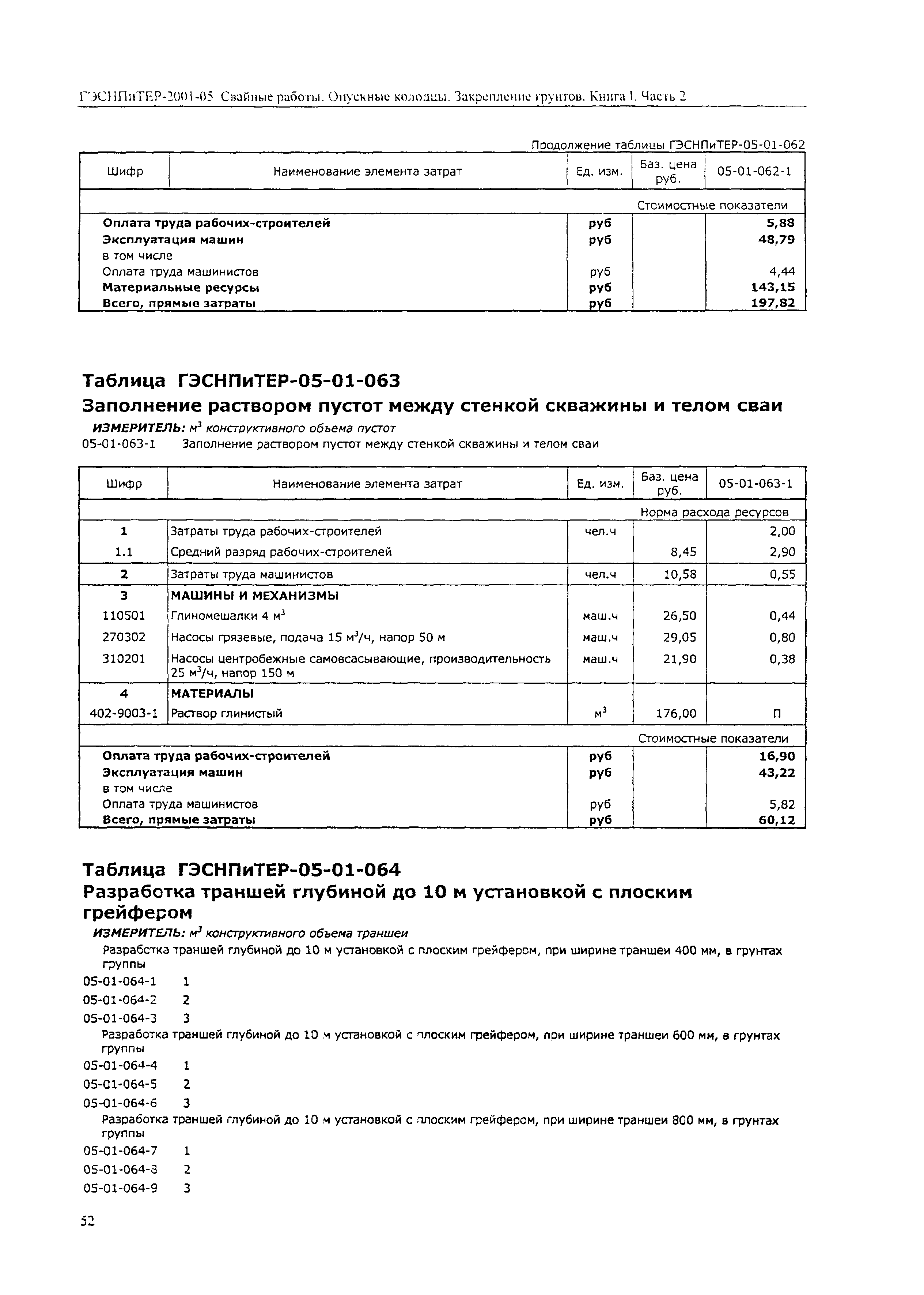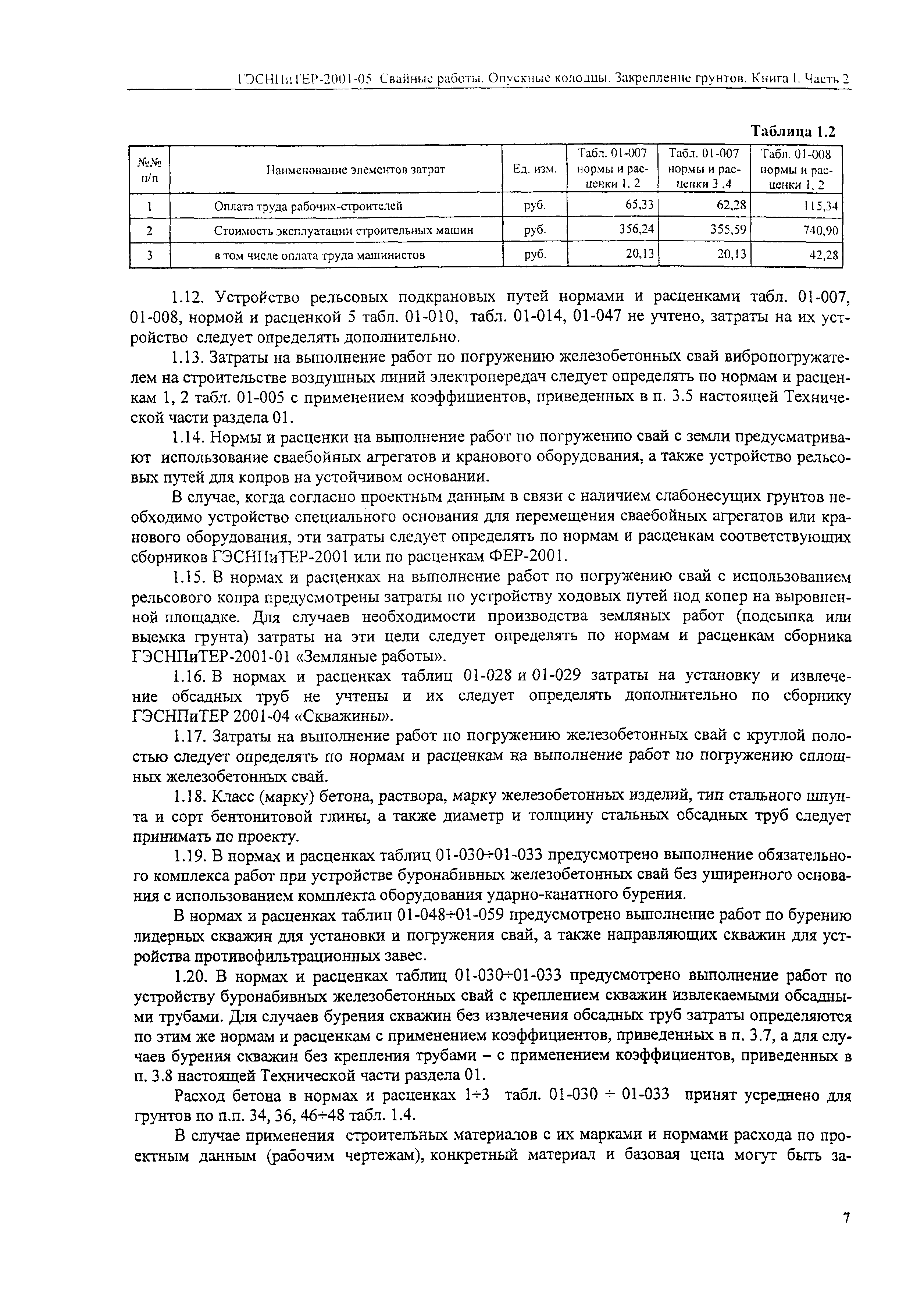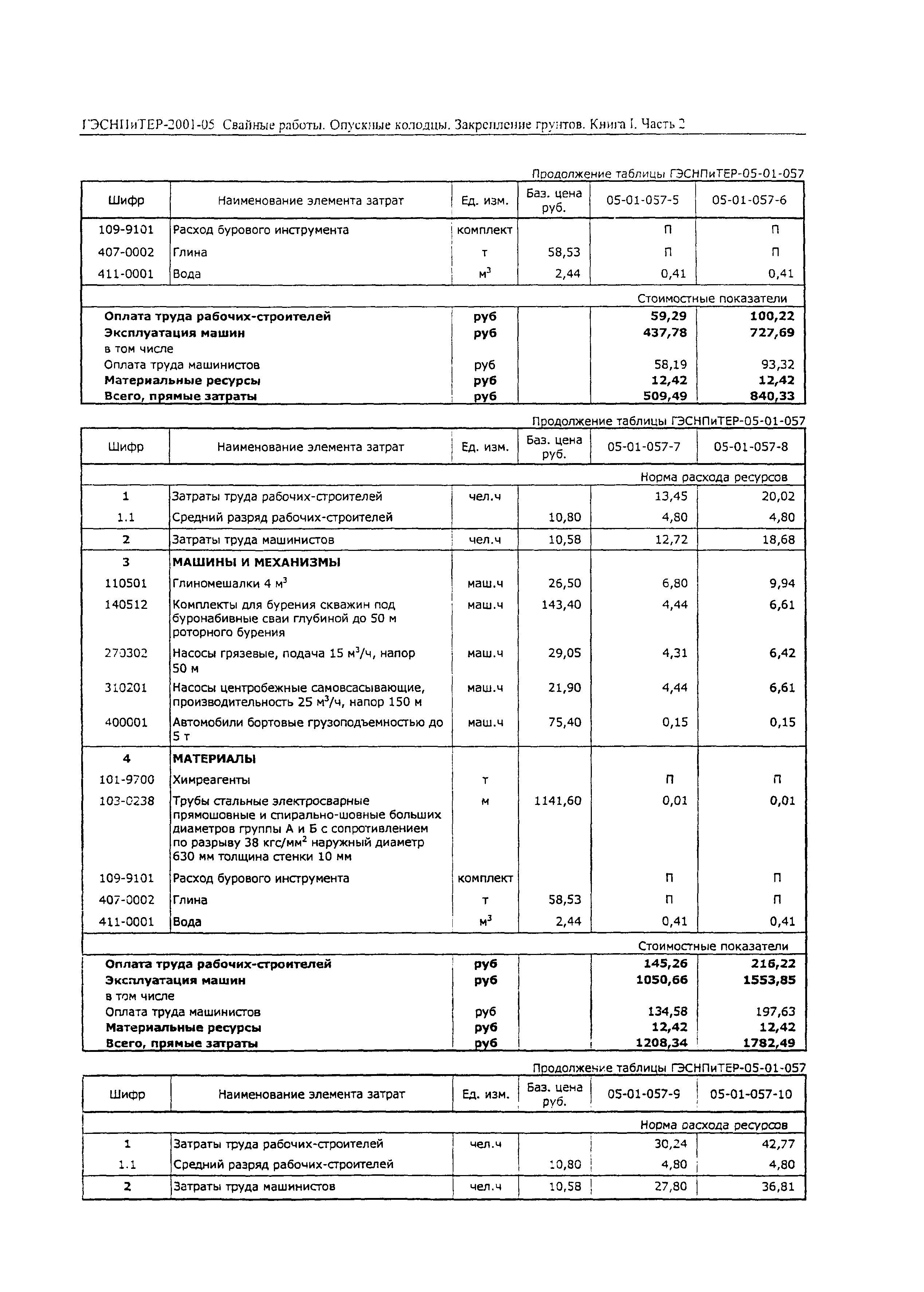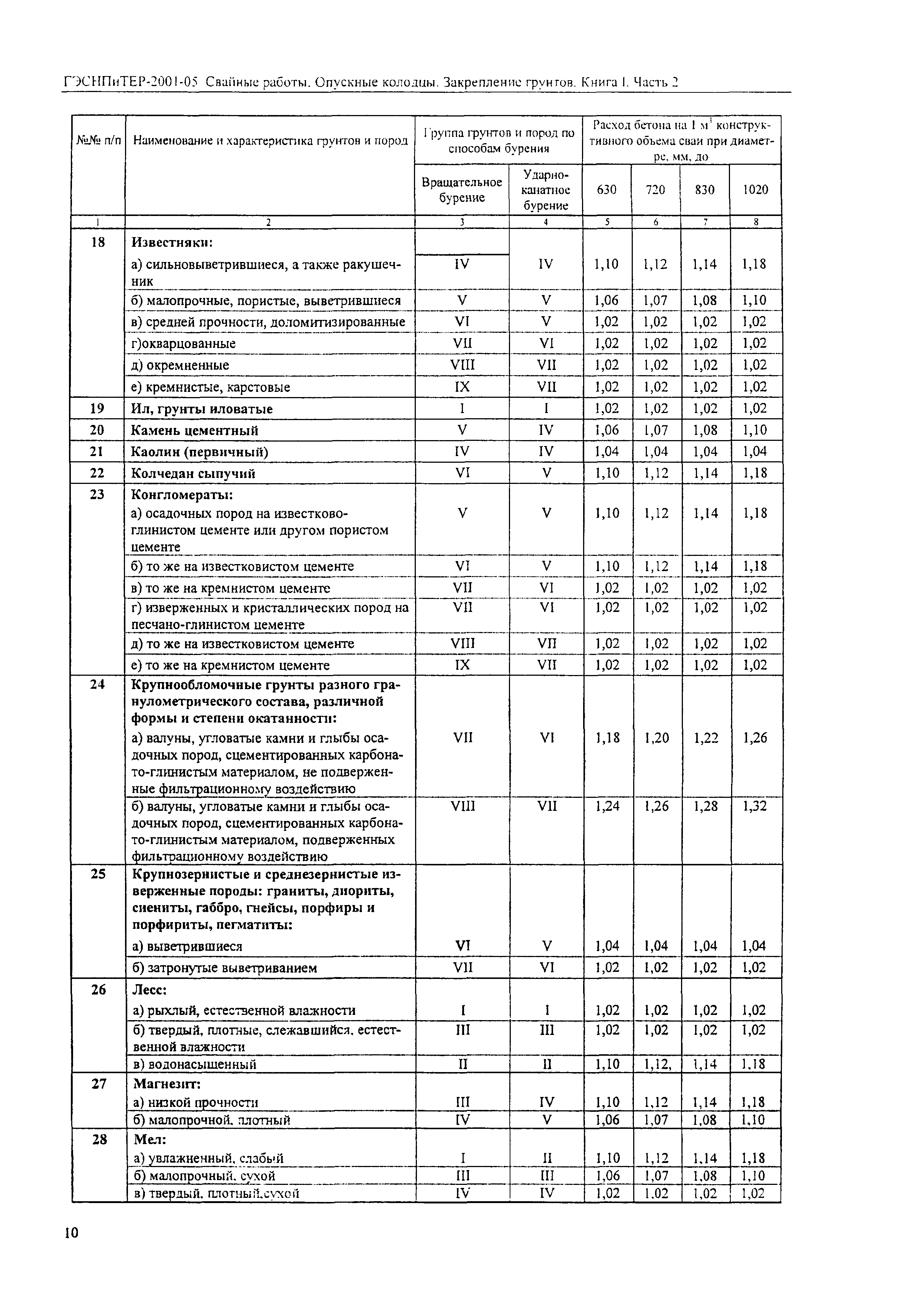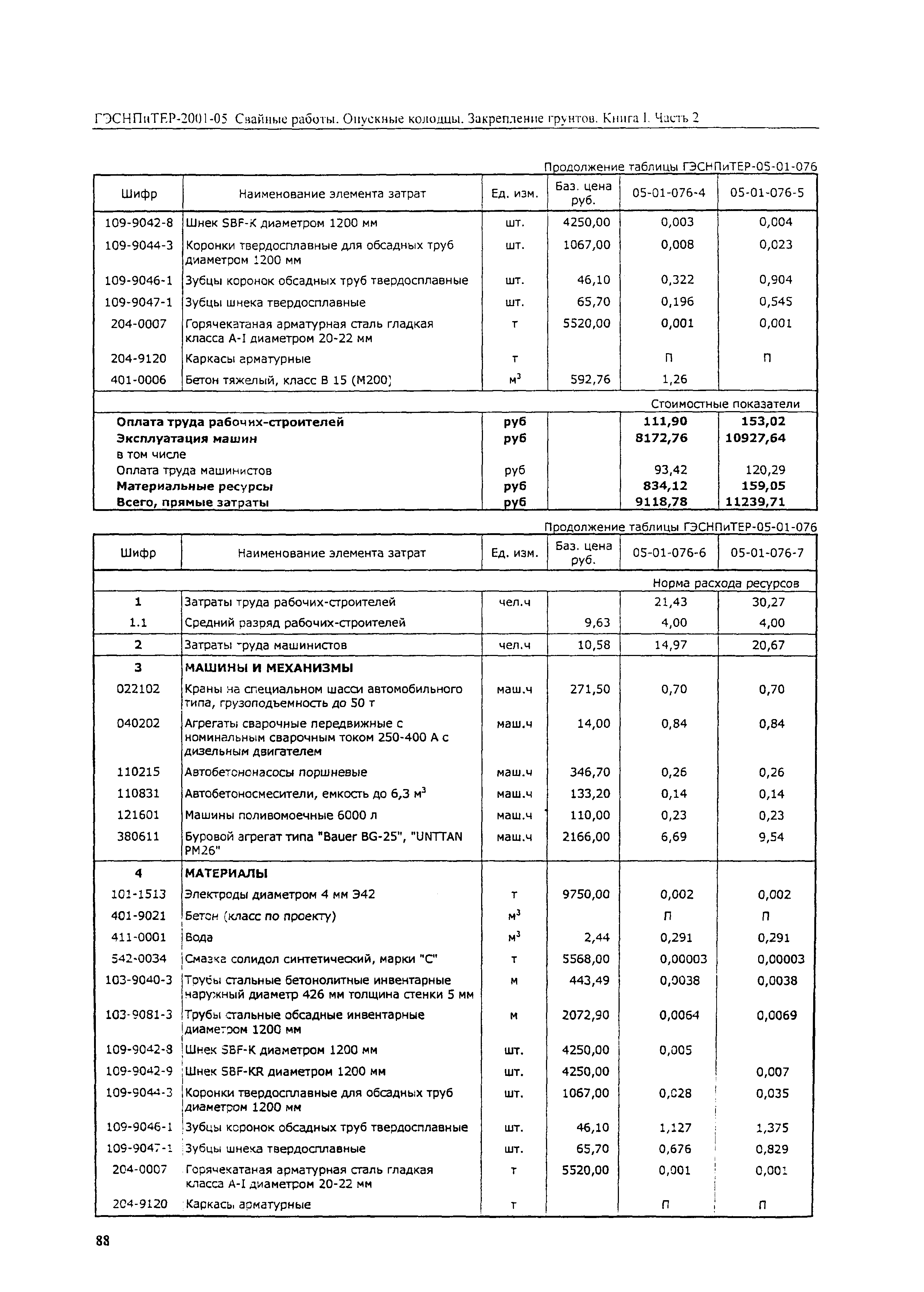 | Оглавление: | Техническая часть 1. Общие указания Раздел 01. Свайные работы Техническая часть 1. Общие указания 2. Правила исчисления объемов работ 3. Коэффициенты к нормам и расценкам Раздел 02. Опускные колодцы Техническая часть 1. Общие указания 2. Правила исчисления объемов работ 3. Коэффициенты к нормам и расценкам Раздел 03. Закрепление грунтов Техническая часть 1. Общие указания 2. Правила исчисления объемов работ 3. Коэффициенты к нормам и расценкам Продолжение раздела 01 - Свайные работы Таблица ГЭСНПиТЕР-05-01-052 Бурение скважин диаметром 250 мм вращательным (роторным) способом Таблица ГЭСНПиТЕР-05-01-053 Бурение скважин диаметром 300 мм вращательным (роторным) способом Таблица ГЭСНПиТЕР-05-01-054 Бурение скважин диаметром 350 мм вращательным (роторным) способом Таблица ГЭСНПиТЕР-05-01-055 Бурение скважин диаметром 450 мм вращательным (роторным) способом Таблица ГЭСНПиТЕР-05-01-056 Бурение скважин диаметром 500 мм вращательным (роторным) способом Таблица ГЭСНПиТЕР-05-01-057 Бурение скважин диаметром 600 мм вращательным (роторным) способом Таблица ГЭСНПиТЕР-05-01-058 Бурение скважин диаметром 700 мм вращательным (роторным) способом Таблица ГЭСНПиТЕР-05-01-059 Бурение скважин вращательным (ковшевым) способом Таблица ГЭСНПиТЕР-05-01-060 Бурение уширения основания скважины для буронабивных железобетонных свай Таблица ГЭСНПиТЕР-05-01-061 Установка в скважину арматурного каркаса Таблица ГЭСНПиТЕР-05-01-062 Бетонирование свай Таблица ГЭСНПиТЕР-05-01-063 Заполнение раствором пустот между стенкой скважины и телом сваи Таблица ГЭСНПиТЕР-05-01-064 Разработки траншей глубиной до 10 м и установкой с плоским грейфером Таблица ГЭСНПиТЕР-05-01-065 Разработка траншей глубиной до 15 м установкой с плоским Таблица ГЭСНПиТЕР-05-01-066 Разборка траншей глубиной до 7 м экскаватором "обратная лопата" Таблица ГЭСНПиТЕР-05-01-067 Устройство траншей под глинистым раствором шириной 0,5 м, глубиной 20 м широкозахватным грейфером на базе экскаватора Таблица ГЭСНПиТЕР-05-01-068 Устройство траншей под глинистым раствором шириной 0,5 м, глубиной до 50 м барражной машиной Таблица ГЭСНПиТЕР-05-01-069 Укладка в траншею противофильтрационных материалов Таблица ГЭСНПиТЕР-05-01-070 Устройство завес Таблица ГЭСНПиТЕР-05-01-071 Наращивание железобетонных свай и панелей Таблица ГЭСНПиТЕР-05-01-072 Установка и извлечение железобетонных ограничителей захваток Таблица ГЭСНПиТЕР-05-01-074 Устройство железобетонных буронабивных свай диаметром 800 мм глубиной до 30 метров агрегатами типа "Ваuеr ВG-25", "Junttаn РМ26" Таблица ГЭСНПиТЕР-05-01-075 Устройство железобетонных буронабивных свай диаметром 1000 мм глубиной до 30 метров агрегатами типа "Ваuеr ВG-25", "Junttаn РМ26" Таблица ГЭСНПиТЕР-05-01-076 Устройство железобетонных буронабивных свай диаметром 1200 мм глубиной до 30 метров агрегатами типа "Ваuеr ВG-25", "Junttаn РМ26" Таблица ГЭСНПиТЕР-05-01-077 Устройство железобетонных буронабивных свай диаметром 1500 мм глубиной до 30 метров агрегатами типа "Ваuеr ВG-25", "Junttаn РМ26" Таблица ГЭСНПиТЕР-05-01-078 Устройство железобетонных буронабивных свай диаметром 1700 мм глубиной до 30 метров агрегатами типа "Ваuеr ВG-25", "Junttаn РМ26" Таблица ГЭСНПиТЕР-05-01-095 Установка железобетонных свай в скважины Таблица ГЭСНПиТЕР-05-01-096 Установка деревометаллических и деревянных свай в готовые скважины Таблица ГЭСНПиТЕР-05-01-097 Погружение железобетонных и стальных свай с предварительным оттаиванием грунта паровыми иглами Таблиц