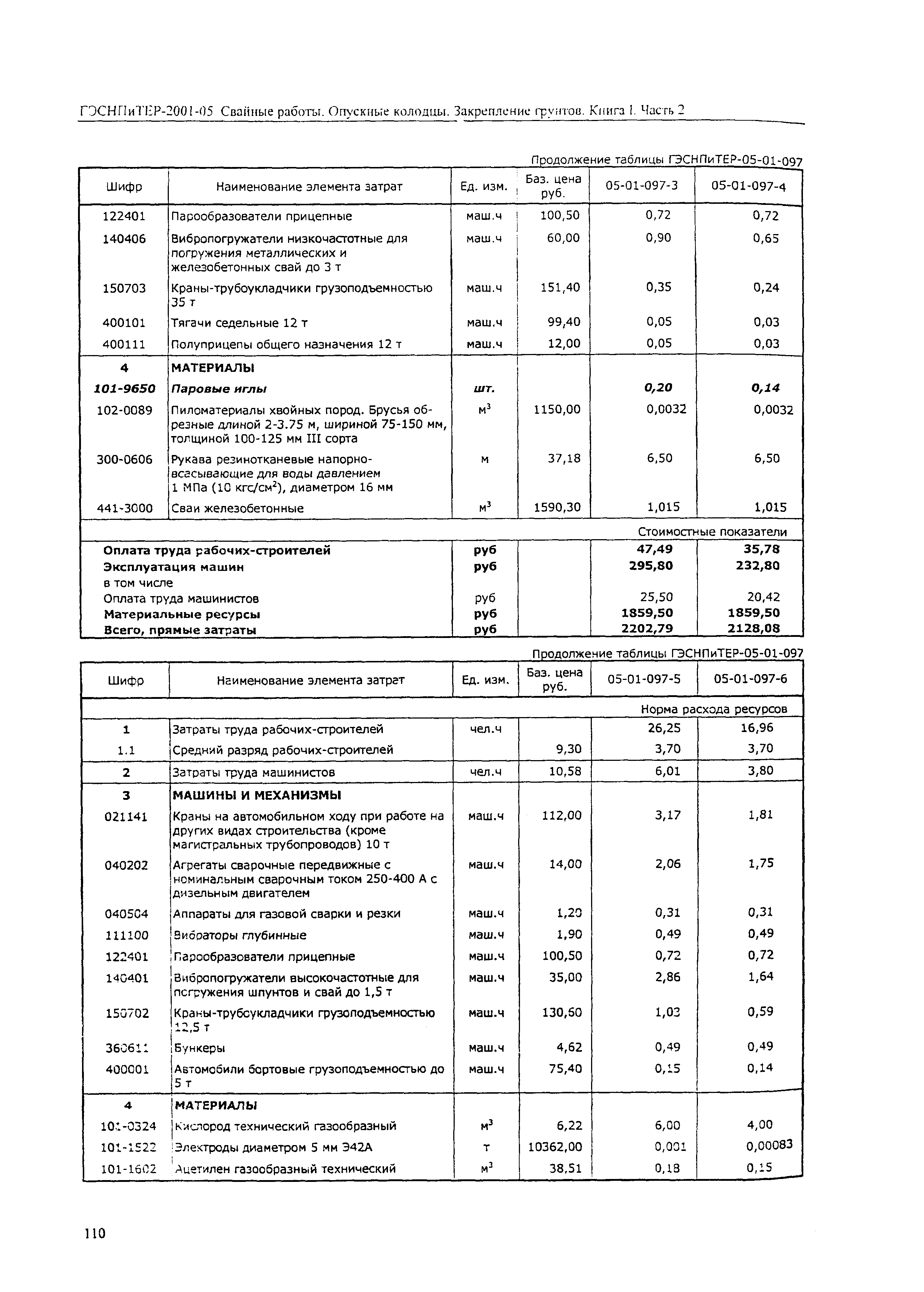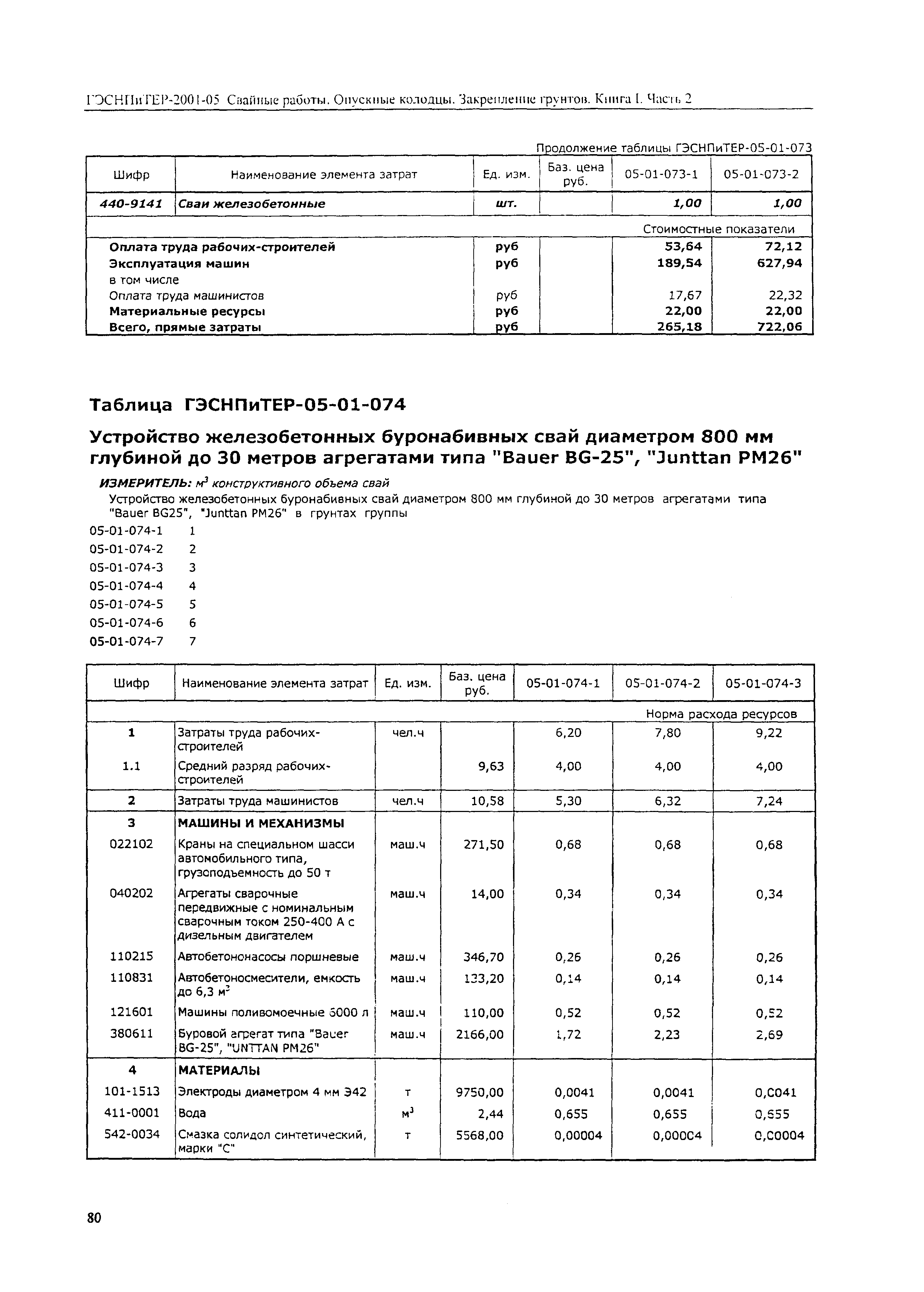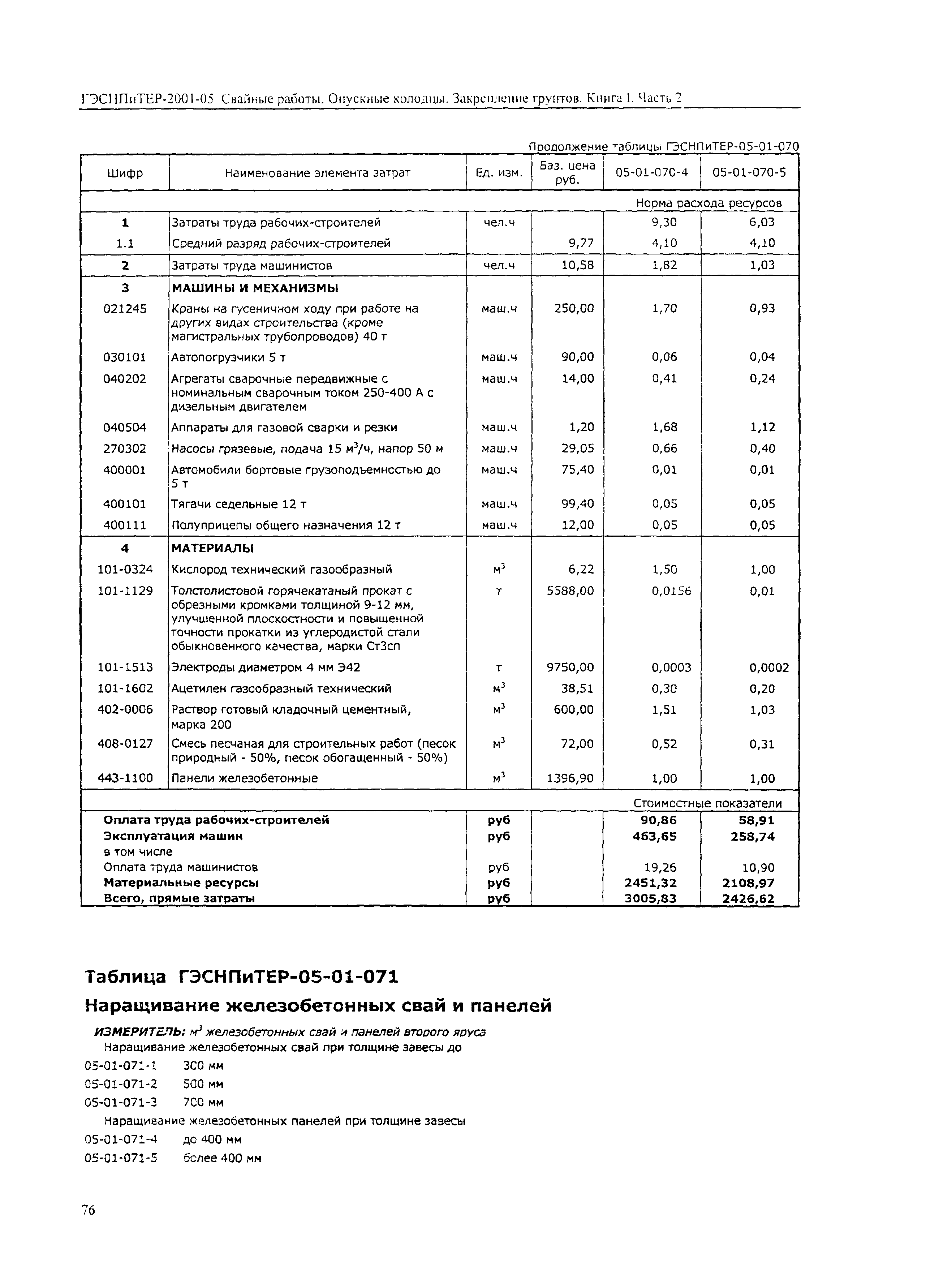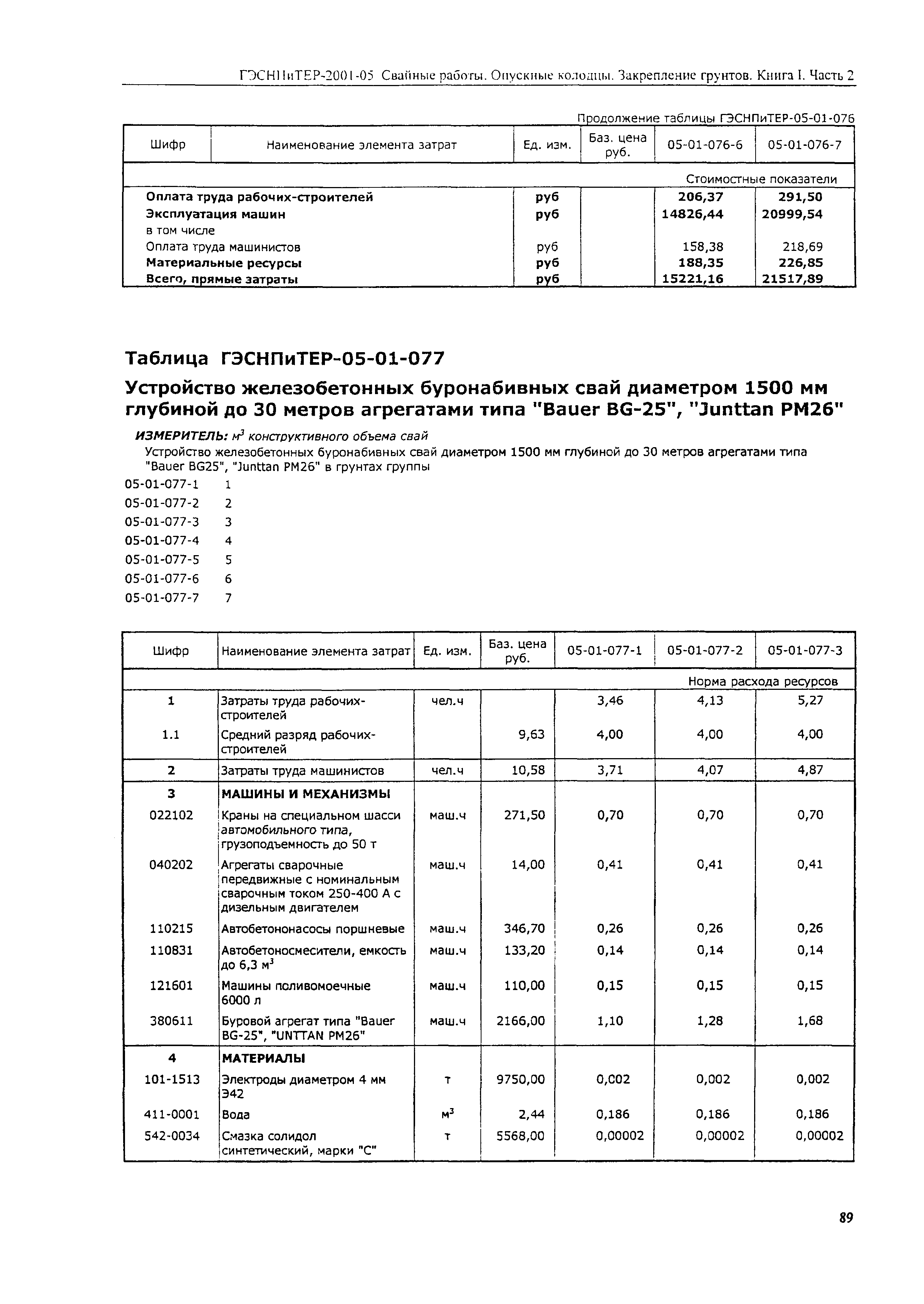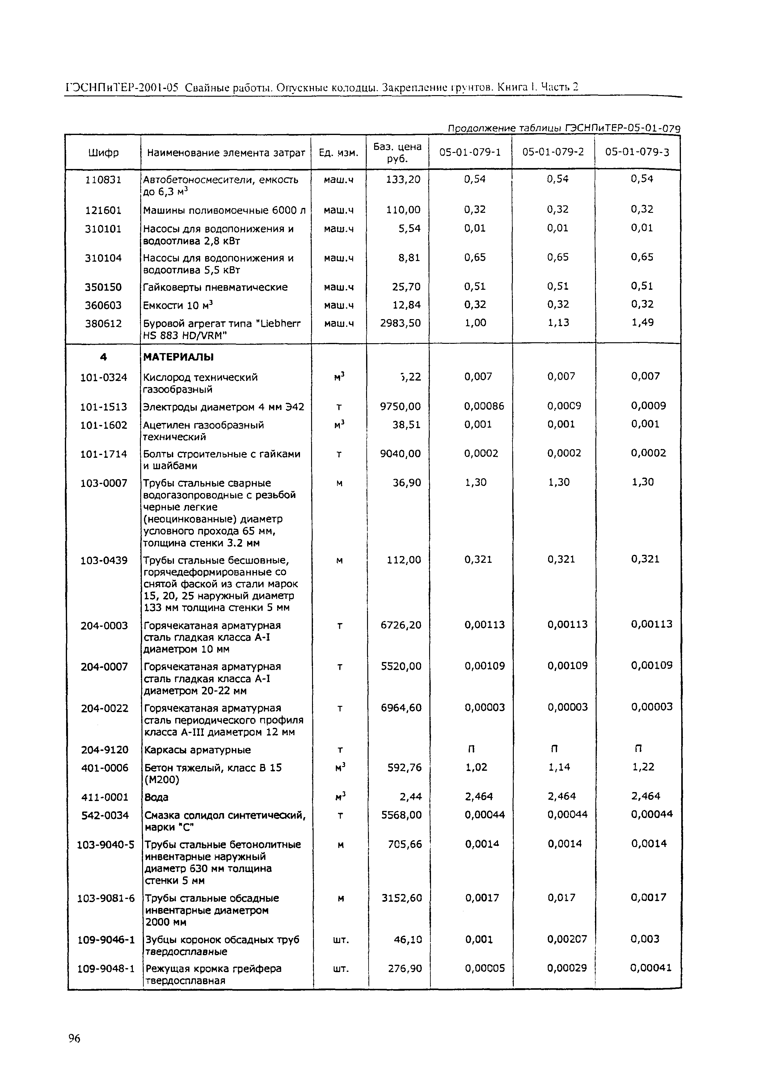 | Оглавление: | Техническая часть 1. Общие указания Раздел 01. Свайные работы Техническая часть 1. Общие указания 2. Правила исчисления объемов работ 3. Коэффициенты к нормам и расценкам Раздел 02. Опускные колодцы Техническая часть 1. Общие указания 2. Правила исчисления объемов работ 3. Коэффициенты к нормам и расценкам Раздел 03. Закрепление грунтов Техническая часть 1. Общие указания 2. Правила исчисления объемов работ 3. Коэффициенты к нормам и расценкам Продолжение раздела 01 - Свайные работы Таблица ГЭСНПиТЕР-05-01-052 Бурение скважин диаметром 250 мм вращательным (роторным) способом Таблица ГЭСНПиТЕР-05-01-053 Бурение скважин диаметром 300 мм вращательным (роторным) способом Таблица ГЭСНПиТЕР-05-01-054 Бурение скважин диаметром 350 мм вращательным (роторным) способом Таблица ГЭСНПиТЕР-05-01-055 Бурение скважин диаметром 450 мм вращательным (роторным) способом Таблица ГЭСНПиТЕР-05-01-056 Бурение скважин диаметром 500 мм вращательным (роторным) способом Таблица ГЭСНПиТЕР-05-01-057 Бурение скважин диаметром 600 мм вращательным (роторным) способом Таблица ГЭСНПиТЕР-05-01-058 Бурение скважин диаметром 700 мм вращательным (роторным) способом Таблица ГЭСНПиТЕР-05-01-059 Бурение скважин вращательным (ковшевым) способом Таблица ГЭСНПиТЕР-05-01-060 Бурение уширения основания скважины для буронабивных железобетонных свай Таблица ГЭСНПиТЕР-05-01-061 Установка в скважину арматурного каркаса Таблица ГЭСНПиТЕР-05-01-062 Бетонирование свай Таблица ГЭСНПиТЕР-05-01-063 Заполнение раствором пустот между стенкой скважины и телом сваи Таблица ГЭСНПиТЕР-05-01-064 Разработки траншей глубиной до 10 м и установкой с плоским грейфером Таблица ГЭСНПиТЕР-05-01-065 Разработка траншей глубиной до 15 м установкой с плоским Таблица ГЭСНПиТЕР-05-01-066 Разборка траншей глубиной до 7 м экскаватором "обратная лопата" Таблица ГЭСНПиТЕР-05-01-067 Устройство траншей под глинистым раствором шириной 0,5 м, глубиной 20 м широкозахватным грейфером на базе экскаватора Таблица ГЭСНПиТЕР-05-01-068 Устройство траншей под глинистым раствором шириной 0,5 м, глубиной до 50 м барражной машиной Таблица ГЭСНПиТЕР-05-01-069 Укладка в траншею противофильтрационных материалов Таблица ГЭСНПиТЕР-05-01-070 Устройство завес Таблица ГЭСНПиТЕР-05-01-071 Наращивание железобетонных свай и панелей Таблица ГЭСНПиТЕР-05-01-072 Установка и извлечение железобетонных ограничителей захваток Таблица ГЭСНПиТЕР-05-01-074 Устройство железобетонных буронабивных свай диаметром 800 мм глубиной до 30 метров агрегатами типа "Ваuеr ВG-25", "Junttаn РМ26" Таблица ГЭСНПиТЕР-05-01-075 Устройство железобетонных буронабивных свай диаметром 1000 мм глубиной до 30 метров агрегатами типа "Ваuеr ВG-25", "Junttаn РМ26" Таблица ГЭСНПиТЕР-05-01-076 Устройство железобетонных буронабивных свай диаметром 1200 мм глубиной до 30 метров агрегатами типа "Ваuеr ВG-25", "Junttаn РМ26" Таблица ГЭСНПиТЕР-05-01-077 Устройство железобетонных буронабивных свай диаметром 1500 мм глубиной до 30 метров агрегатами типа "Ваuеr ВG-25", "Junttаn РМ26" Таблица ГЭСНПиТЕР-05-01-078 Устройство железобетонных буронабивных свай диаметром 1700 мм глубиной до 30 метров агрегатами типа "Ваuеr ВG-25", "Junttаn РМ26" Таблица ГЭСНПиТЕР-05-01-095 Установка железобетонных свай в скважины Таблица ГЭСНПиТЕР-05-01-096 Установка деревометаллических и деревянных свай в готовые скважины Таблица ГЭСНПиТЕР-05-01-097 Погружение железобетонных и стальных свай с предварительным оттаиванием грунта паровыми иглами Таблиц