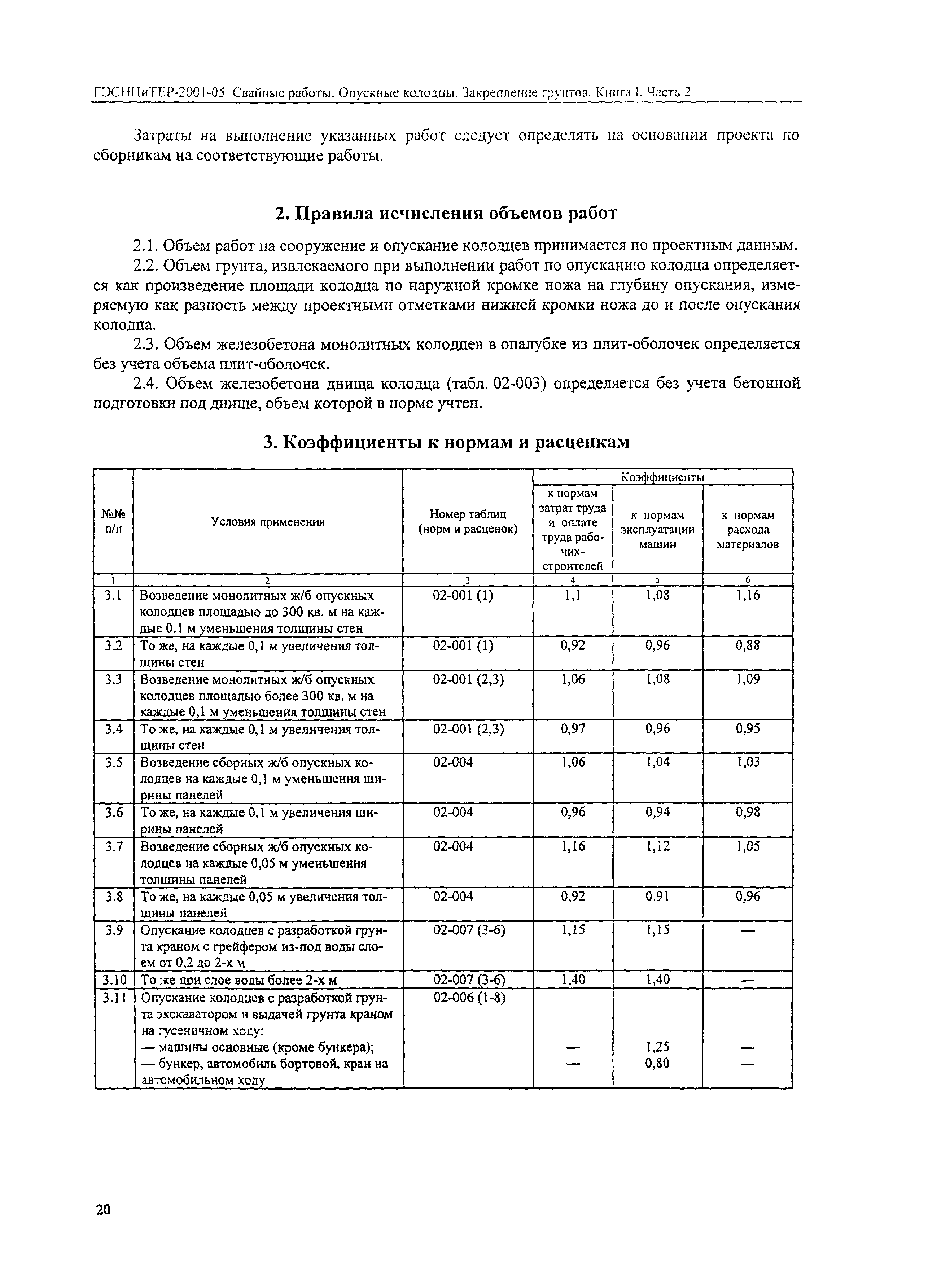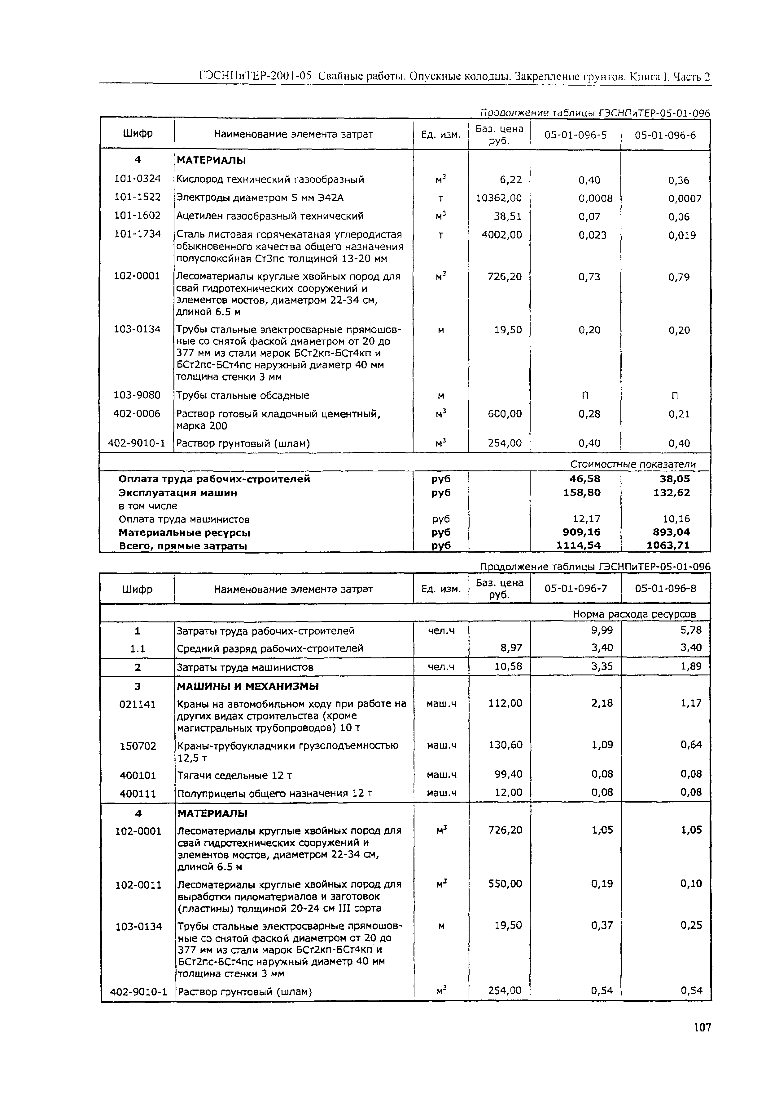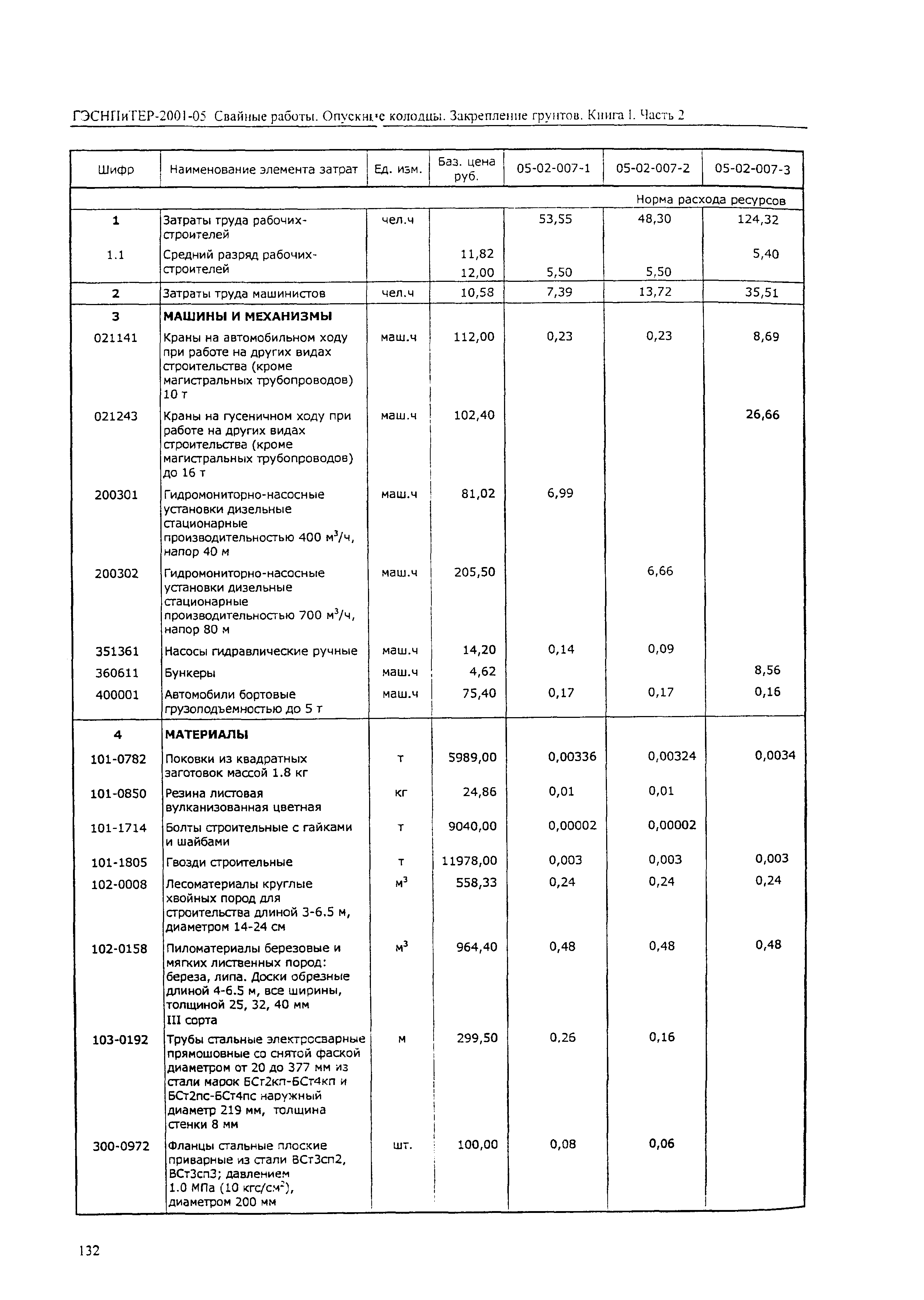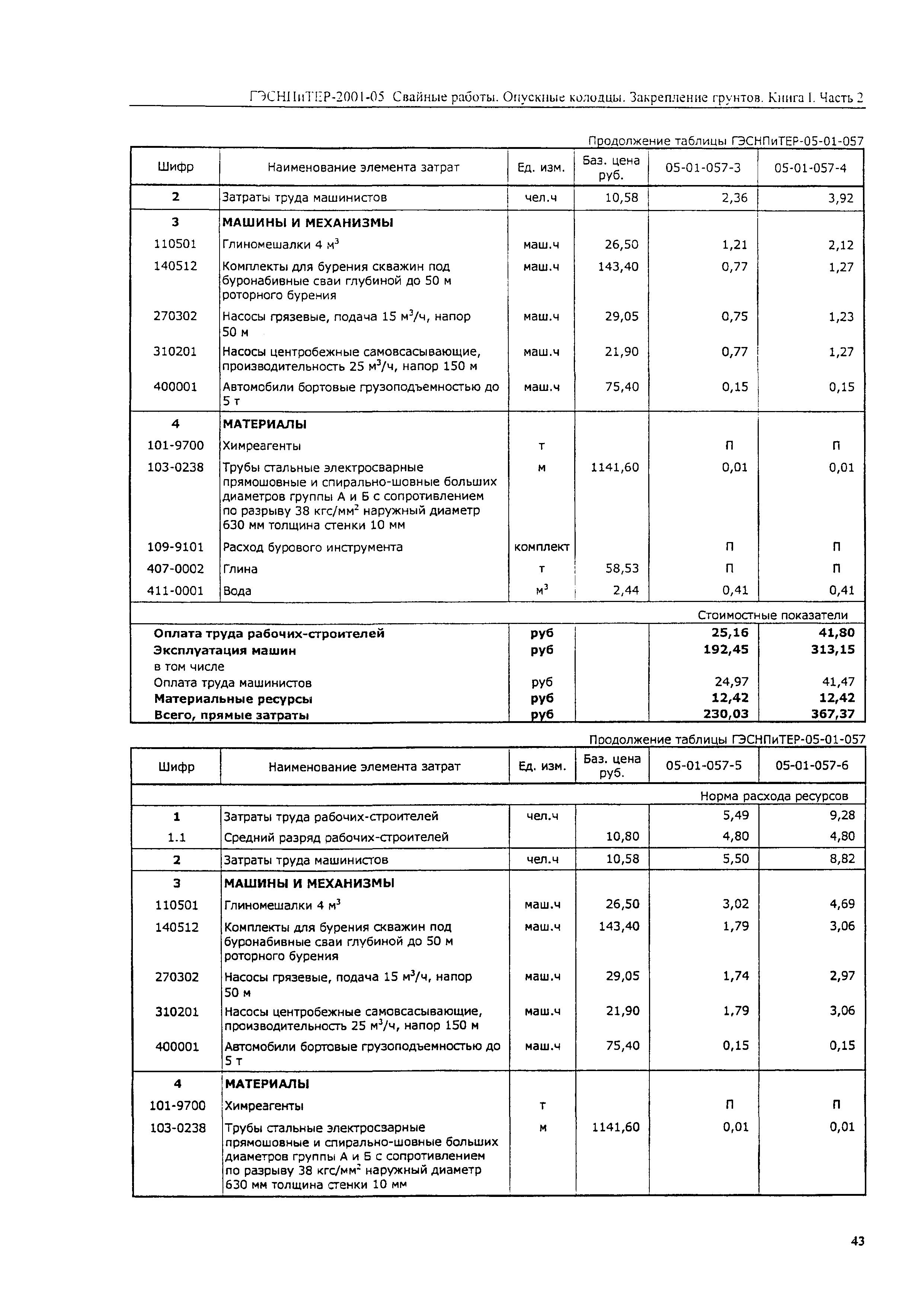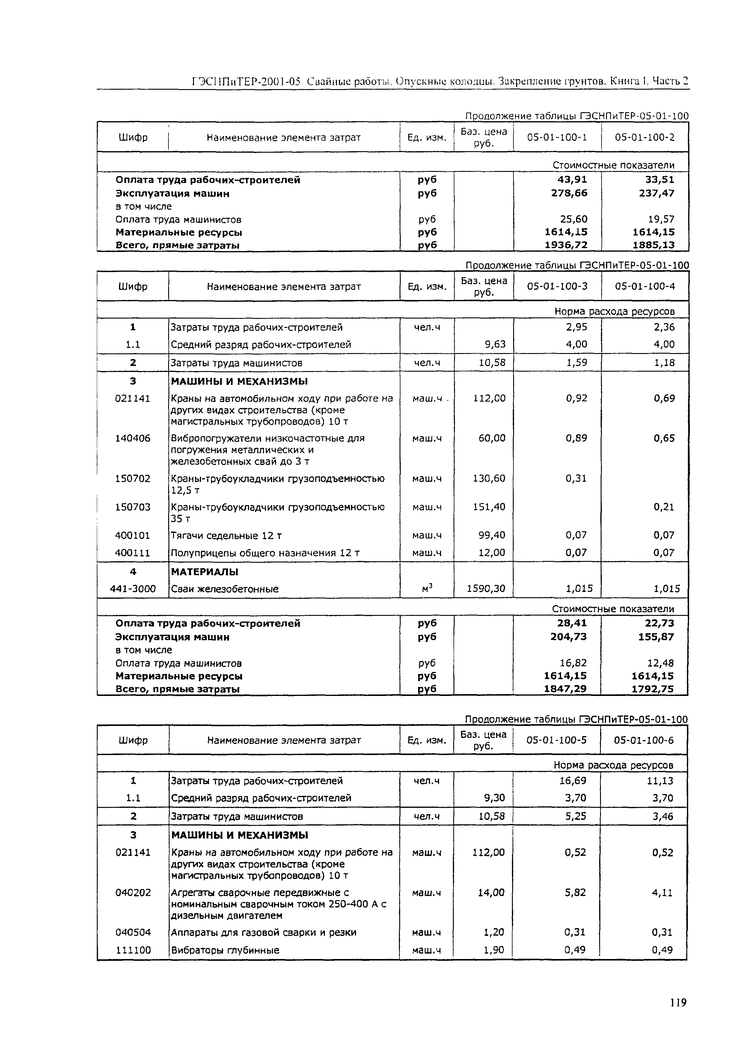 | Оглавление: | Техническая часть 1. Общие указания Раздел 01. Свайные работы Техническая часть 1. Общие указания 2. Правила исчисления объемов работ 3. Коэффициенты к нормам и расценкам Раздел 02. Опускные колодцы Техническая часть 1. Общие указания 2. Правила исчисления объемов работ 3. Коэффициенты к нормам и расценкам Раздел 03. Закрепление грунтов Техническая часть 1. Общие указания 2. Правила исчисления объемов работ 3. Коэффициенты к нормам и расценкам Продолжение раздела 01 - Свайные работы Таблица ГЭСНПиТЕР-05-01-052 Бурение скважин диаметром 250 мм вращательным (роторным) способом Таблица ГЭСНПиТЕР-05-01-053 Бурение скважин диаметром 300 мм вращательным (роторным) способом Таблица ГЭСНПиТЕР-05-01-054 Бурение скважин диаметром 350 мм вращательным (роторным) способом Таблица ГЭСНПиТЕР-05-01-055 Бурение скважин диаметром 450 мм вращательным (роторным) способом Таблица ГЭСНПиТЕР-05-01-056 Бурение скважин диаметром 500 мм вращательным (роторным) способом Таблица ГЭСНПиТЕР-05-01-057 Бурение скважин диаметром 600 мм вращательным (роторным) способом Таблица ГЭСНПиТЕР-05-01-058 Бурение скважин диаметром 700 мм вращательным (роторным) способом Таблица ГЭСНПиТЕР-05-01-059 Бурение скважин вращательным (ковшевым) способом Таблица ГЭСНПиТЕР-05-01-060 Бурение уширения основания скважины для буронабивных железобетонных свай Таблица ГЭСНПиТЕР-05-01-061 Установка в скважину арматурного каркаса Таблица ГЭСНПиТЕР-05-01-062 Бетонирование свай Таблица ГЭСНПиТЕР-05-01-063 Заполнение раствором пустот между стенкой скважины и телом сваи Таблица ГЭСНПиТЕР-05-01-064 Разработки траншей глубиной до 10 м и установкой с плоским грейфером Таблица ГЭСНПиТЕР-05-01-065 Разработка траншей глубиной до 15 м установкой с плоским Таблица ГЭСНПиТЕР-05-01-066 Разборка траншей глубиной до 7 м экскаватором "обратная лопата" Таблица ГЭСНПиТЕР-05-01-067 Устройство траншей под глинистым раствором шириной 0,5 м, глубиной 20 м широкозахватным грейфером на базе экскаватора Таблица ГЭСНПиТЕР-05-01-068 Устройство траншей под глинистым раствором шириной 0,5 м, глубиной до 50 м барражной машиной Таблица ГЭСНПиТЕР-05-01-069 Укладка в траншею противофильтрационных материалов Таблица ГЭСНПиТЕР-05-01-070 Устройство завес Таблица ГЭСНПиТЕР-05-01-071 Наращивание железобетонных свай и панелей Таблица ГЭСНПиТЕР-05-01-072 Установка и извлечение железобетонных ограничителей захваток Таблица ГЭСНПиТЕР-05-01-074 Устройство железобетонных буронабивных свай диаметром 800 мм глубиной до 30 метров агрегатами типа "Ваuеr ВG-25", "Junttаn РМ26" Таблица ГЭСНПиТЕР-05-01-075 Устройство железобетонных буронабивных свай диаметром 1000 мм глубиной до 30 метров агрегатами типа "Ваuеr ВG-25", "Junttаn РМ26" Таблица ГЭСНПиТЕР-05-01-076 Устройство железобетонных буронабивных свай диаметром 1200 мм глубиной до 30 метров агрегатами типа "Ваuеr ВG-25", "Junttаn РМ26" Таблица ГЭСНПиТЕР-05-01-077 Устройство железобетонных буронабивных свай диаметром 1500 мм глубиной до 30 метров агрегатами типа "Ваuеr ВG-25", "Junttаn РМ26" Таблица ГЭСНПиТЕР-05-01-078 Устройство железобетонных буронабивных свай диаметром 1700 мм глубиной до 30 метров агрегатами типа "Ваuеr ВG-25", "Junttаn РМ26" Таблица ГЭСНПиТЕР-05-01-095 Установка железобетонных свай в скважины Таблица ГЭСНПиТЕР-05-01-096 Установка деревометаллических и деревянных свай в готовые скважины Таблица ГЭСНПиТЕР-05-01-097 Погружение железобетонных и стальных свай с предварительным оттаиванием грунта паровыми иглами Таблиц