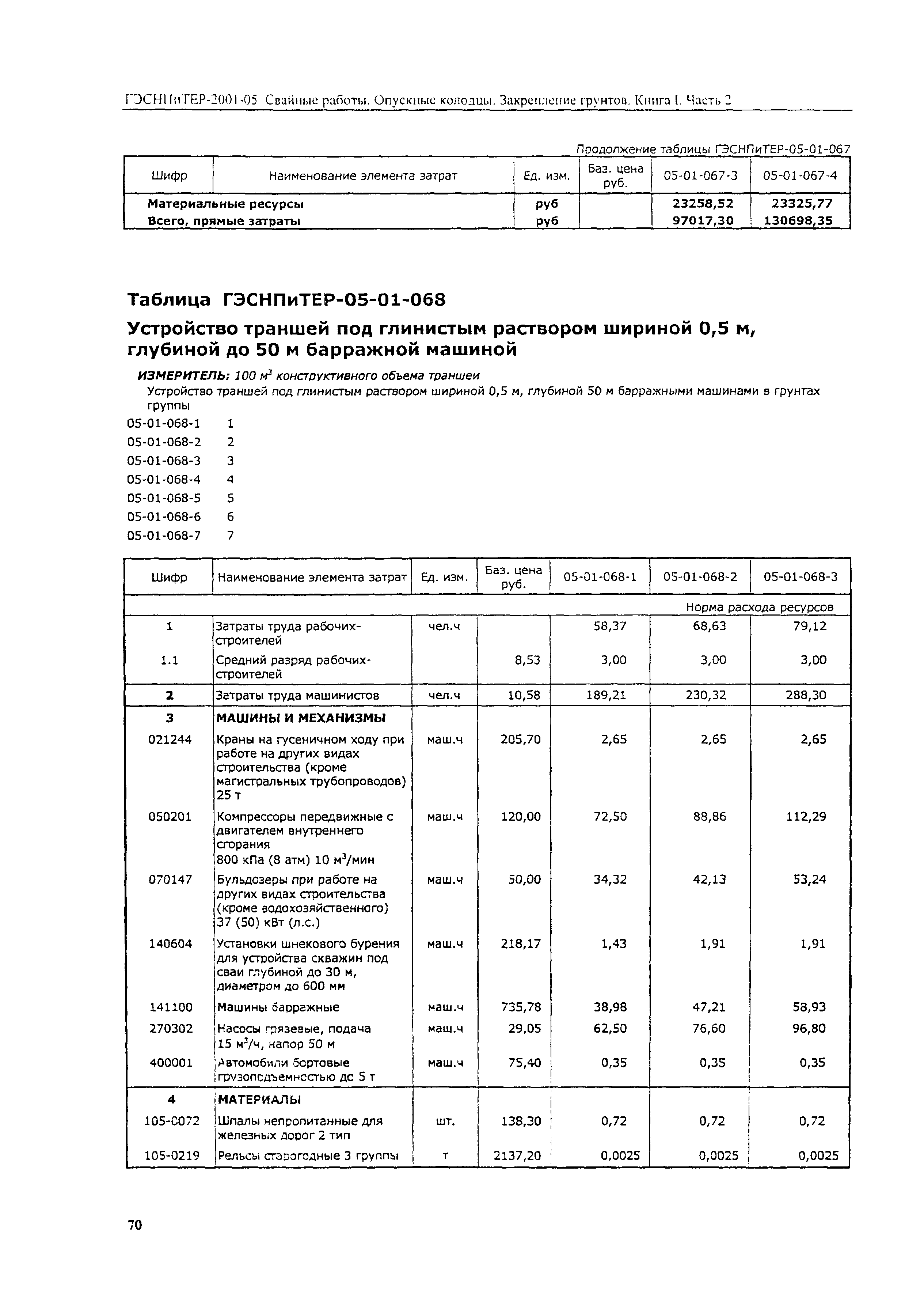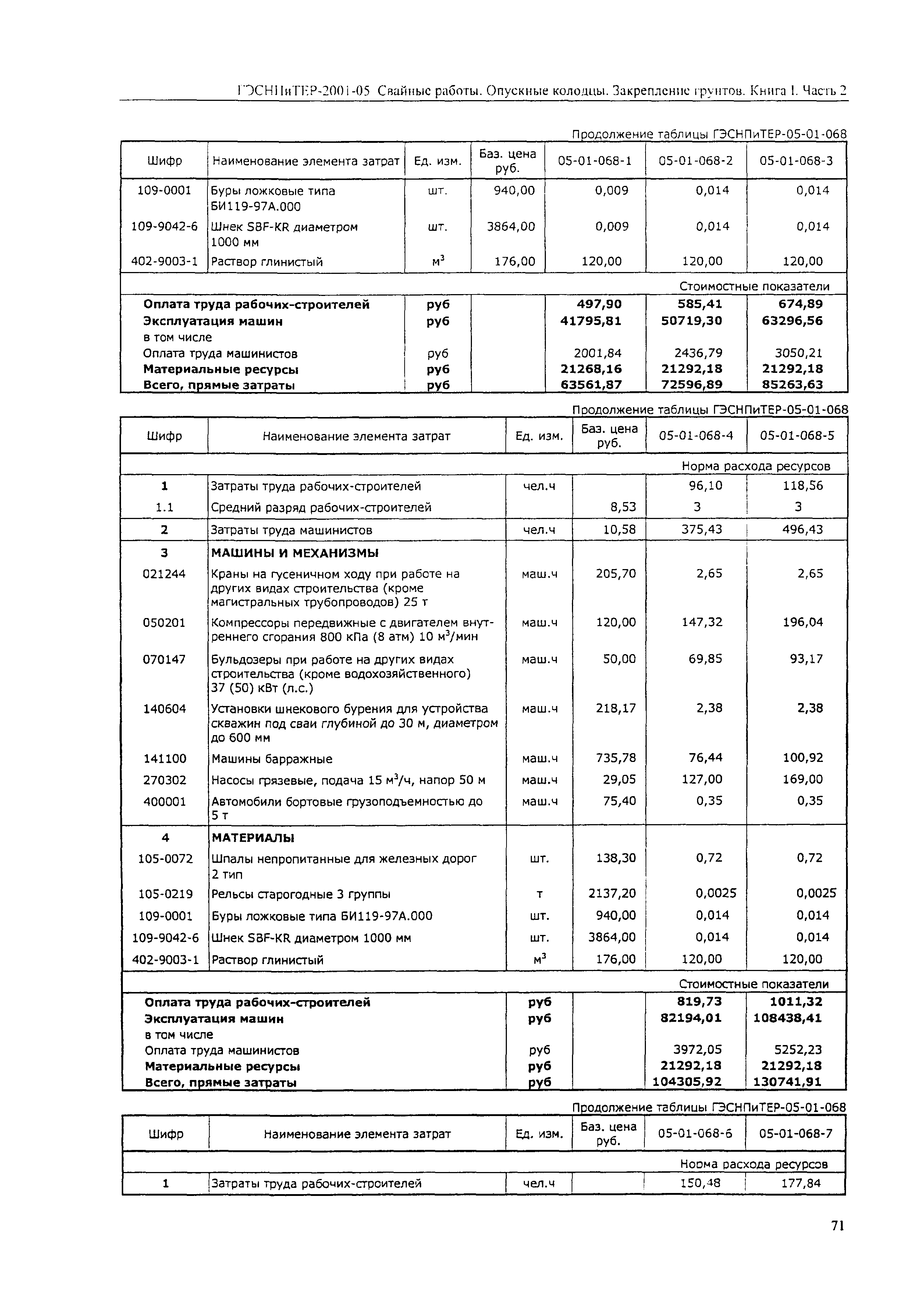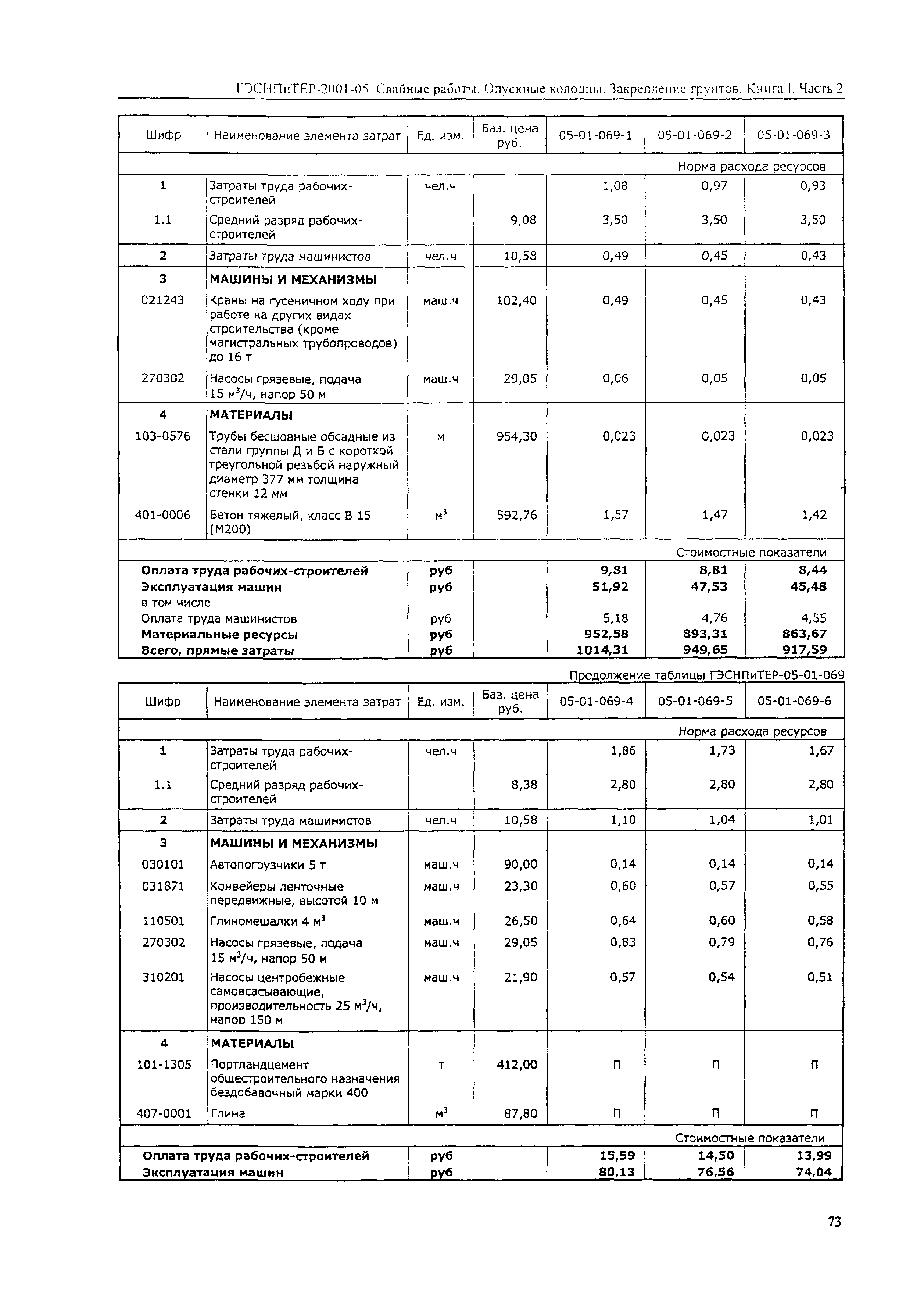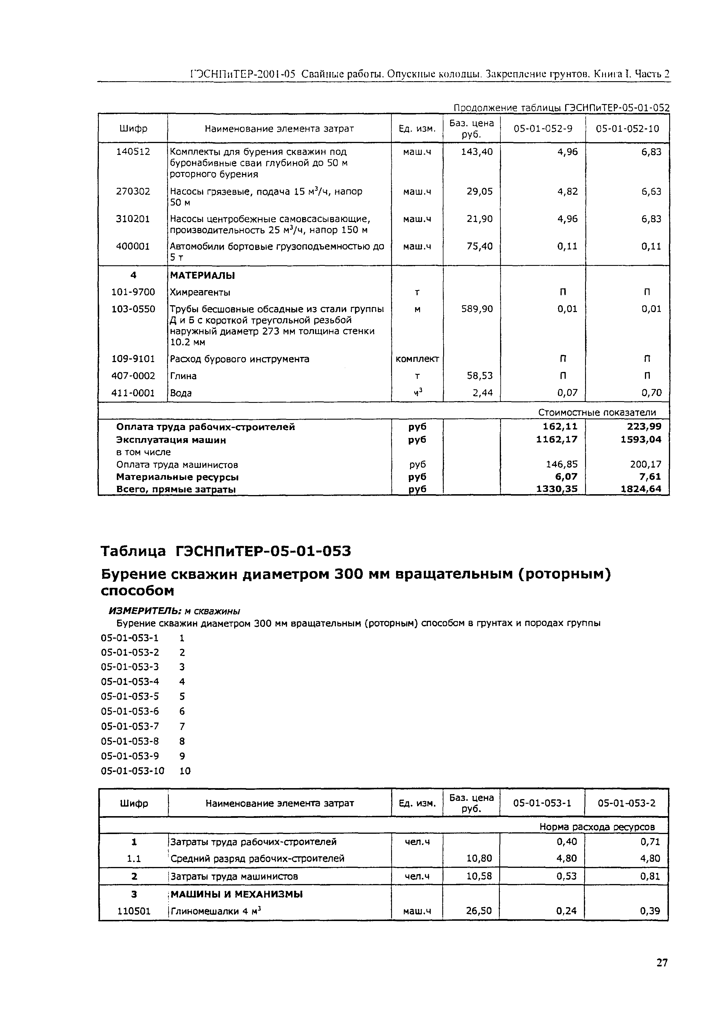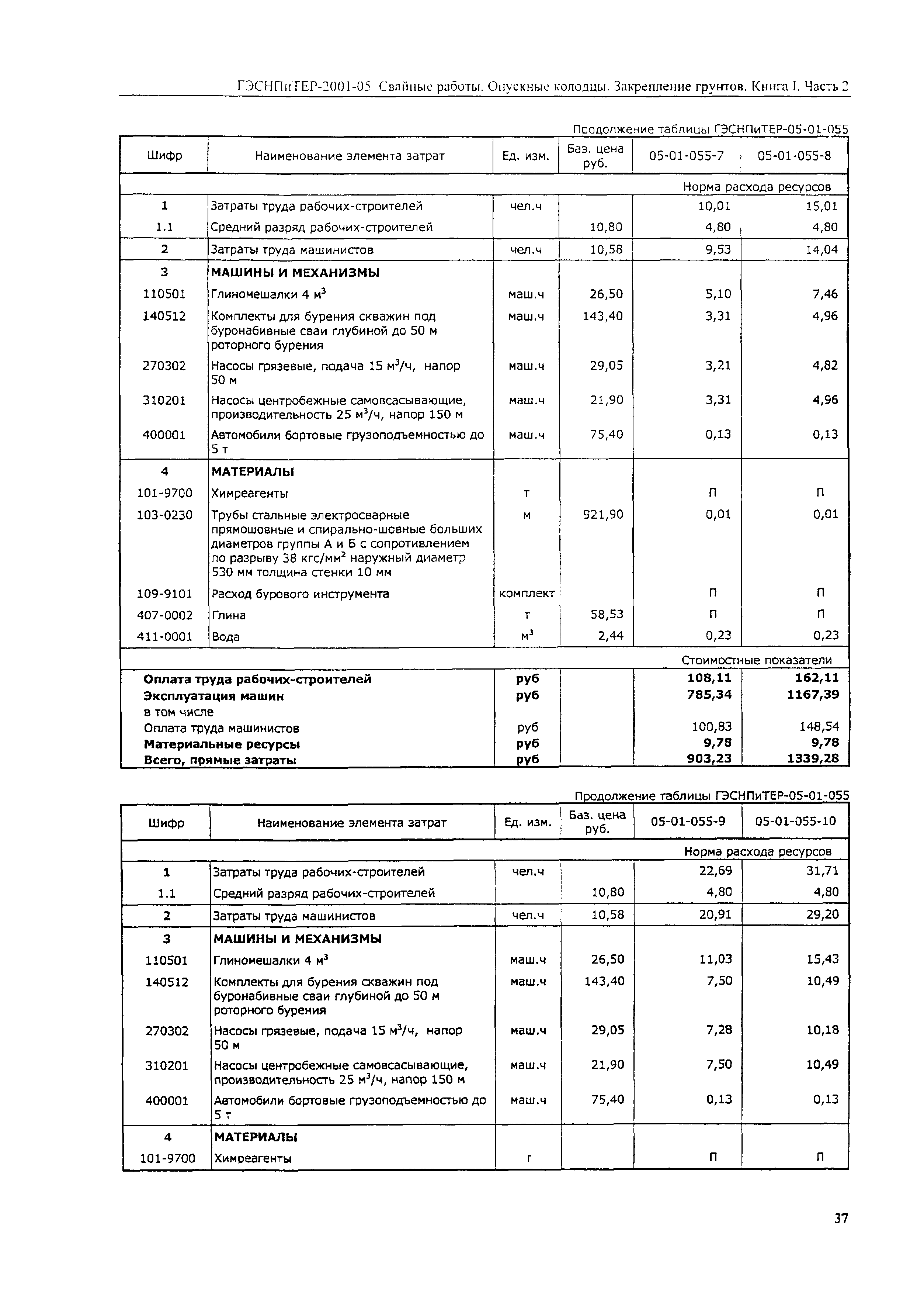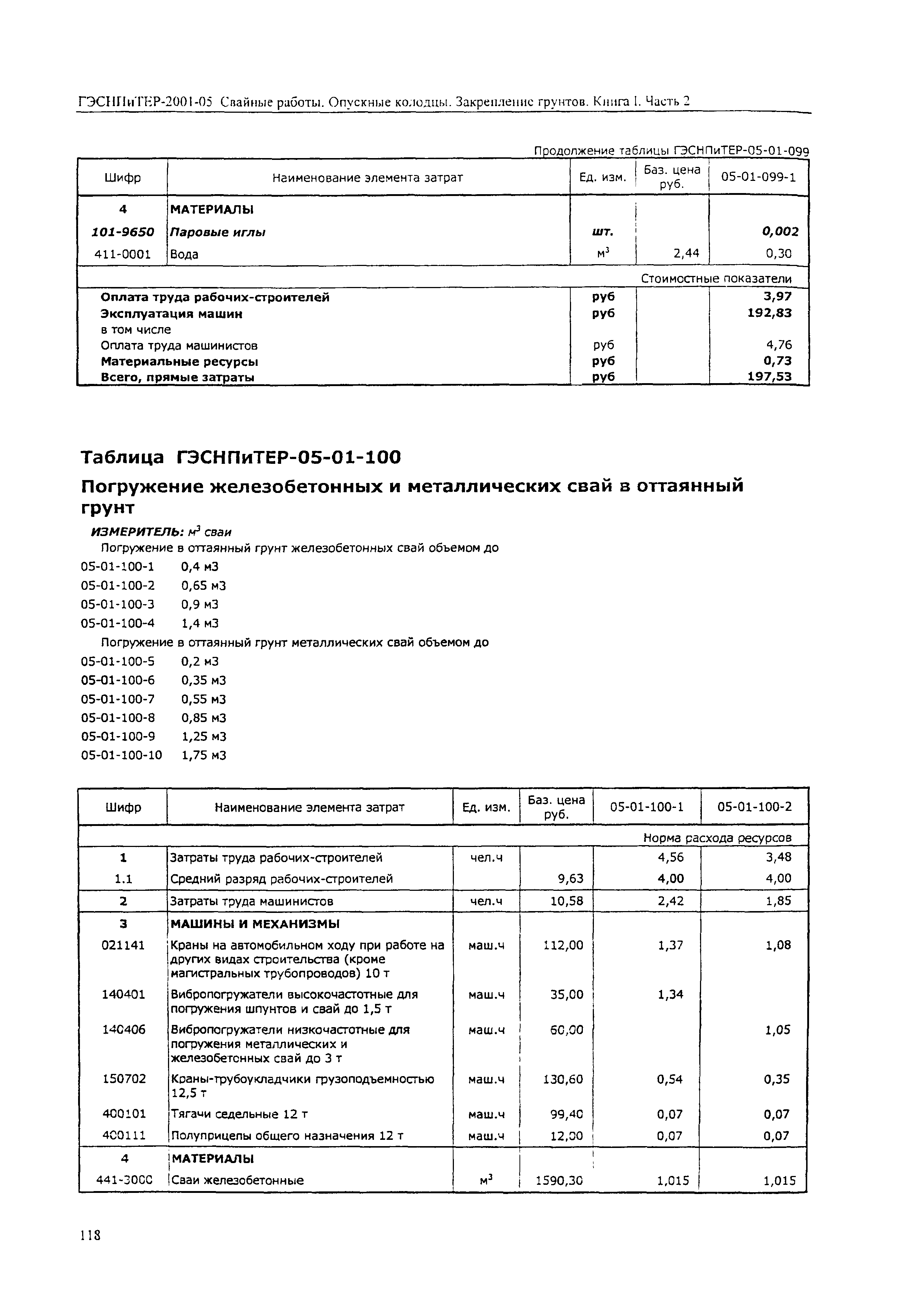 | Оглавление: | Техническая часть 1. Общие указания Раздел 01. Свайные работы Техническая часть 1. Общие указания 2. Правила исчисления объемов работ 3. Коэффициенты к нормам и расценкам Раздел 02. Опускные колодцы Техническая часть 1. Общие указания 2. Правила исчисления объемов работ 3. Коэффициенты к нормам и расценкам Раздел 03. Закрепление грунтов Техническая часть 1. Общие указания 2. Правила исчисления объемов работ 3. Коэффициенты к нормам и расценкам Продолжение раздела 01 - Свайные работы Таблица ГЭСНПиТЕР-05-01-052 Бурение скважин диаметром 250 мм вращательным (роторным) способом Таблица ГЭСНПиТЕР-05-01-053 Бурение скважин диаметром 300 мм вращательным (роторным) способом Таблица ГЭСНПиТЕР-05-01-054 Бурение скважин диаметром 350 мм вращательным (роторным) способом Таблица ГЭСНПиТЕР-05-01-055 Бурение скважин диаметром 450 мм вращательным (роторным) способом Таблица ГЭСНПиТЕР-05-01-056 Бурение скважин диаметром 500 мм вращательным (роторным) способом Таблица ГЭСНПиТЕР-05-01-057 Бурение скважин диаметром 600 мм вращательным (роторным) способом Таблица ГЭСНПиТЕР-05-01-058 Бурение скважин диаметром 700 мм вращательным (роторным) способом Таблица ГЭСНПиТЕР-05-01-059 Бурение скважин вращательным (ковшевым) способом Таблица ГЭСНПиТЕР-05-01-060 Бурение уширения основания скважины для буронабивных железобетонных свай Таблица ГЭСНПиТЕР-05-01-061 Установка в скважину арматурного каркаса Таблица ГЭСНПиТЕР-05-01-062 Бетонирование свай Таблица ГЭСНПиТЕР-05-01-063 Заполнение раствором пустот между стенкой скважины и телом сваи Таблица ГЭСНПиТЕР-05-01-064 Разработки траншей глубиной до 10 м и установкой с плоским грейфером Таблица ГЭСНПиТЕР-05-01-065 Разработка траншей глубиной до 15 м установкой с плоским Таблица ГЭСНПиТЕР-05-01-066 Разборка траншей глубиной до 7 м экскаватором "обратная лопата" Таблица ГЭСНПиТЕР-05-01-067 Устройство траншей под глинистым раствором шириной 0,5 м, глубиной 20 м широкозахватным грейфером на базе экскаватора Таблица ГЭСНПиТЕР-05-01-068 Устройство траншей под глинистым раствором шириной 0,5 м, глубиной до 50 м барражной машиной Таблица ГЭСНПиТЕР-05-01-069 Укладка в траншею противофильтрационных материалов Таблица ГЭСНПиТЕР-05-01-070 Устройство завес Таблица ГЭСНПиТЕР-05-01-071 Наращивание железобетонных свай и панелей Таблица ГЭСНПиТЕР-05-01-072 Установка и извлечение железобетонных ограничителей захваток Таблица ГЭСНПиТЕР-05-01-074 Устройство железобетонных буронабивных свай диаметром 800 мм глубиной до 30 метров агрегатами типа "Ваuеr ВG-25", "Junttаn РМ26" Таблица ГЭСНПиТЕР-05-01-075 Устройство железобетонных буронабивных свай диаметром 1000 мм глубиной до 30 метров агрегатами типа "Ваuеr ВG-25", "Junttаn РМ26" Таблица ГЭСНПиТЕР-05-01-076 Устройство железобетонных буронабивных свай диаметром 1200 мм глубиной до 30 метров агрегатами типа "Ваuеr ВG-25", "Junttаn РМ26" Таблица ГЭСНПиТЕР-05-01-077 Устройство железобетонных буронабивных свай диаметром 1500 мм глубиной до 30 метров агрегатами типа "Ваuеr ВG-25", "Junttаn РМ26" Таблица ГЭСНПиТЕР-05-01-078 Устройство железобетонных буронабивных свай диаметром 1700 мм глубиной до 30 метров агрегатами типа "Ваuеr ВG-25", "Junttаn РМ26" Таблица ГЭСНПиТЕР-05-01-095 Установка железобетонных свай в скважины Таблица ГЭСНПиТЕР-05-01-096 Установка деревометаллических и деревянных свай в готовые скважины Таблица ГЭСНПиТЕР-05-01-097 Погружение железобетонных и стальных свай с предварительным оттаиванием грунта паровыми иглами Таблиц