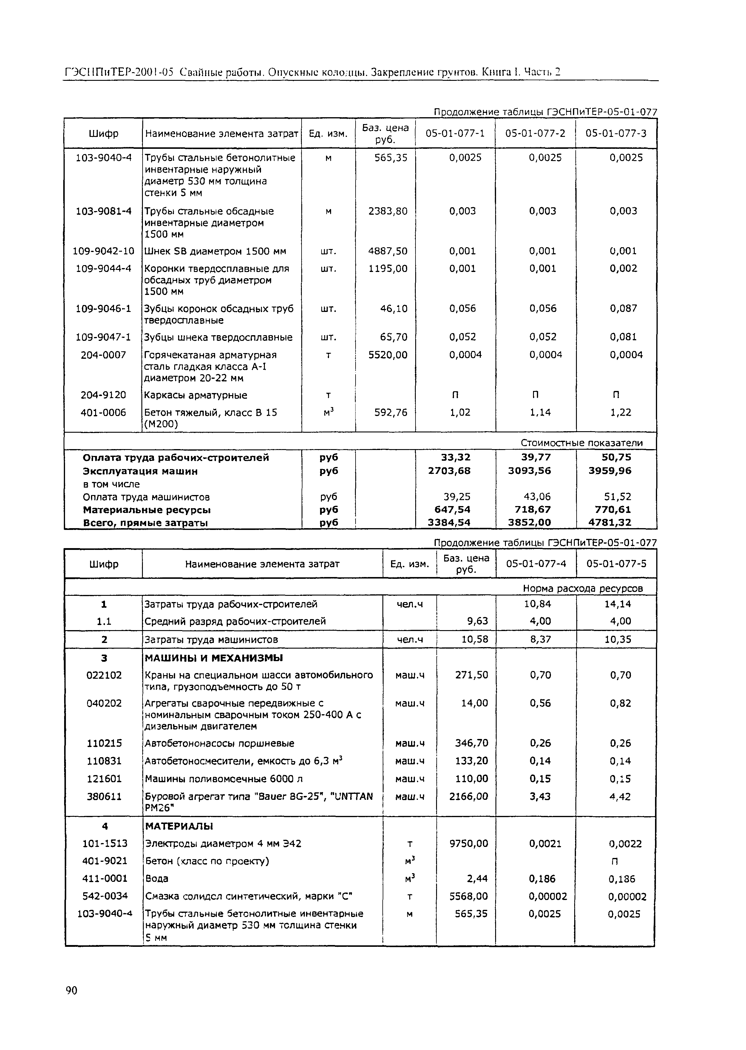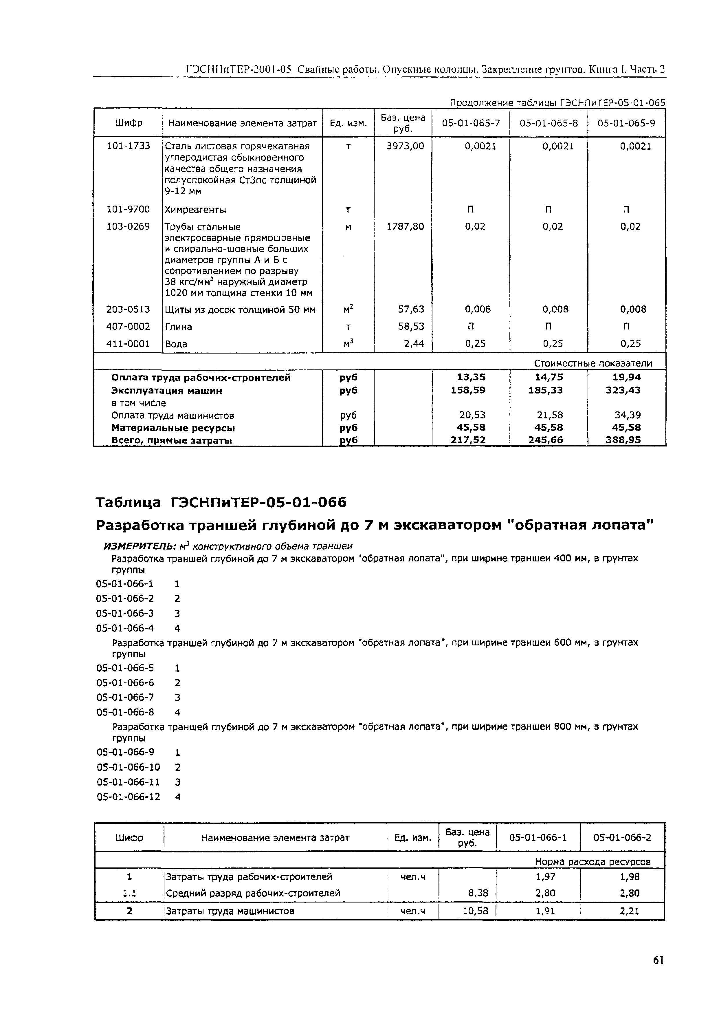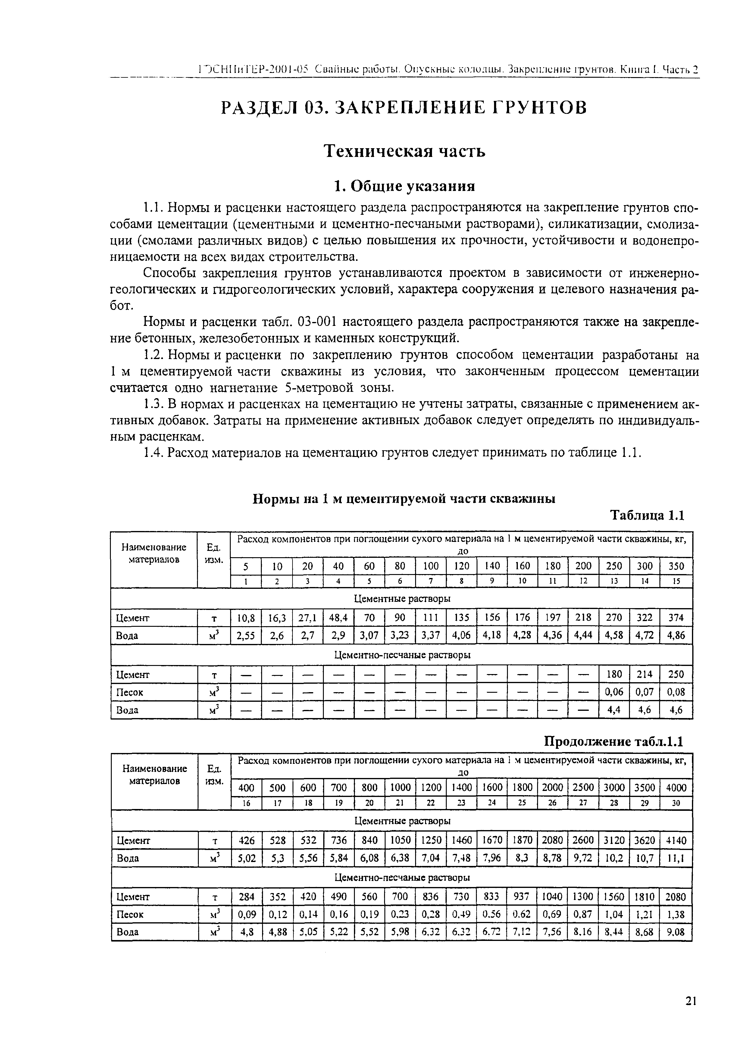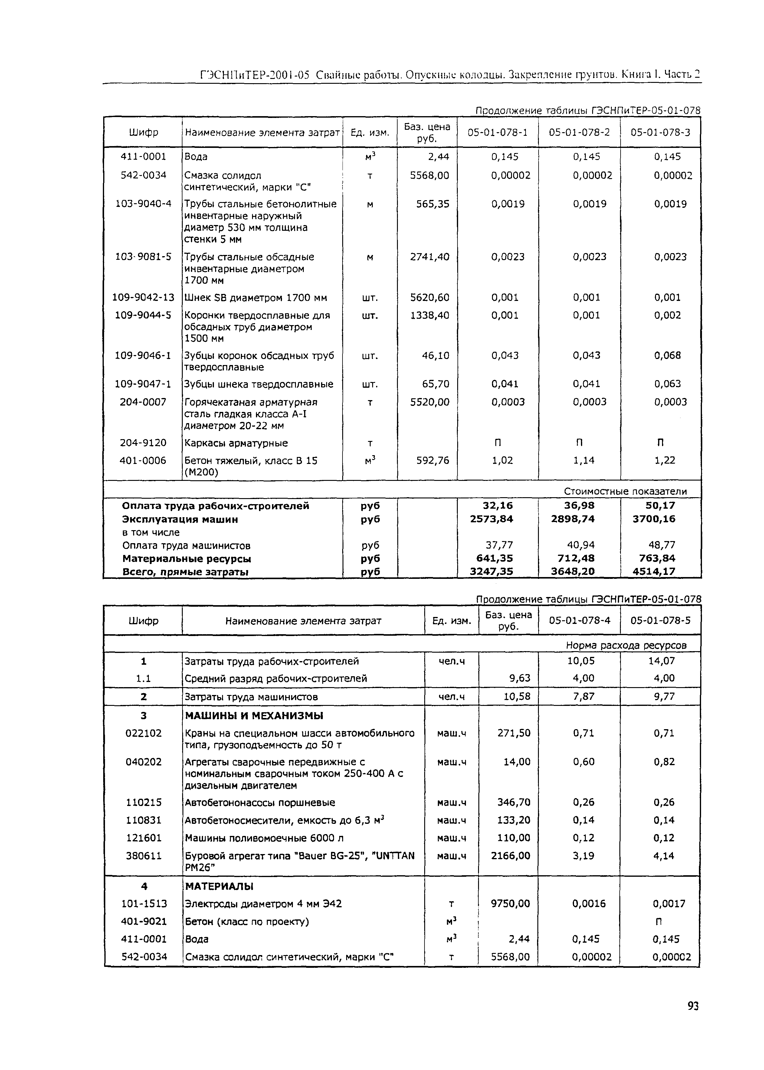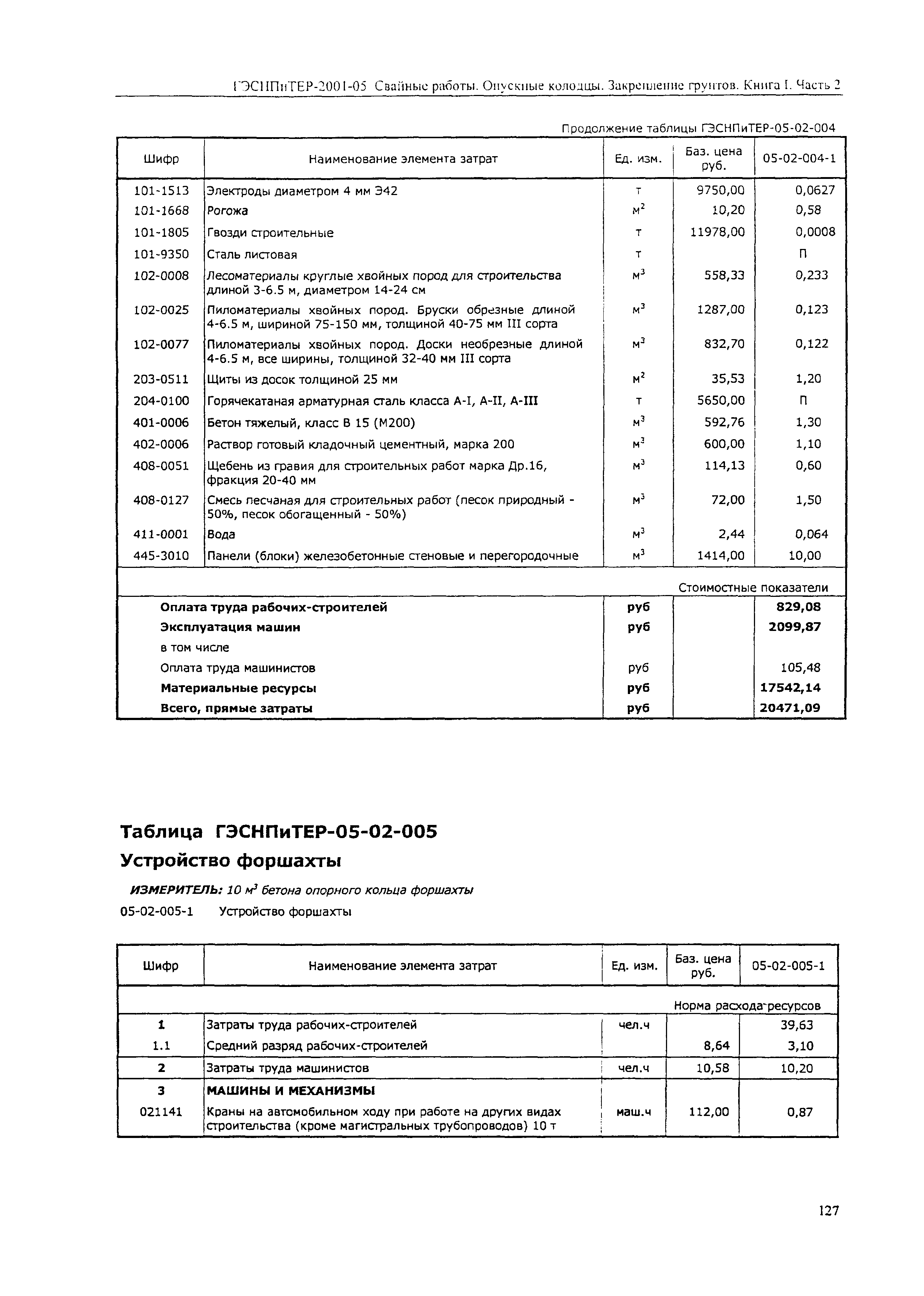 | Оглавление: | Техническая часть 1. Общие указания Раздел 01. Свайные работы Техническая часть 1. Общие указания 2. Правила исчисления объемов работ 3. Коэффициенты к нормам и расценкам Раздел 02. Опускные колодцы Техническая часть 1. Общие указания 2. Правила исчисления объемов работ 3. Коэффициенты к нормам и расценкам Раздел 03. Закрепление грунтов Техническая часть 1. Общие указания 2. Правила исчисления объемов работ 3. Коэффициенты к нормам и расценкам Продолжение раздела 01 - Свайные работы Таблица ГЭСНПиТЕР-05-01-052 Бурение скважин диаметром 250 мм вращательным (роторным) способом Таблица ГЭСНПиТЕР-05-01-053 Бурение скважин диаметром 300 мм вращательным (роторным) способом Таблица ГЭСНПиТЕР-05-01-054 Бурение скважин диаметром 350 мм вращательным (роторным) способом Таблица ГЭСНПиТЕР-05-01-055 Бурение скважин диаметром 450 мм вращательным (роторным) способом Таблица ГЭСНПиТЕР-05-01-056 Бурение скважин диаметром 500 мм вращательным (роторным) способом Таблица ГЭСНПиТЕР-05-01-057 Бурение скважин диаметром 600 мм вращательным (роторным) способом Таблица ГЭСНПиТЕР-05-01-058 Бурение скважин диаметром 700 мм вращательным (роторным) способом Таблица ГЭСНПиТЕР-05-01-059 Бурение скважин вращательным (ковшевым) способом Таблица ГЭСНПиТЕР-05-01-060 Бурение уширения основания скважины для буронабивных железобетонных свай Таблица ГЭСНПиТЕР-05-01-061 Установка в скважину арматурного каркаса Таблица ГЭСНПиТЕР-05-01-062 Бетонирование свай Таблица ГЭСНПиТЕР-05-01-063 Заполнение раствором пустот между стенкой скважины и телом сваи Таблица ГЭСНПиТЕР-05-01-064 Разработки траншей глубиной до 10 м и установкой с плоским грейфером Таблица ГЭСНПиТЕР-05-01-065 Разработка траншей глубиной до 15 м установкой с плоским Таблица ГЭСНПиТЕР-05-01-066 Разборка траншей глубиной до 7 м экскаватором "обратная лопата" Таблица ГЭСНПиТЕР-05-01-067 Устройство траншей под глинистым раствором шириной 0,5 м, глубиной 20 м широкозахватным грейфером на базе экскаватора Таблица ГЭСНПиТЕР-05-01-068 Устройство траншей под глинистым раствором шириной 0,5 м, глубиной до 50 м барражной машиной Таблица ГЭСНПиТЕР-05-01-069 Укладка в траншею противофильтрационных материалов Таблица ГЭСНПиТЕР-05-01-070 Устройство завес Таблица ГЭСНПиТЕР-05-01-071 Наращивание железобетонных свай и панелей Таблица ГЭСНПиТЕР-05-01-072 Установка и извлечение железобетонных ограничителей захваток Таблица ГЭСНПиТЕР-05-01-074 Устройство железобетонных буронабивных свай диаметром 800 мм глубиной до 30 метров агрегатами типа "Ваuеr ВG-25", "Junttаn РМ26" Таблица ГЭСНПиТЕР-05-01-075 Устройство железобетонных буронабивных свай диаметром 1000 мм глубиной до 30 метров агрегатами типа "Ваuеr ВG-25", "Junttаn РМ26" Таблица ГЭСНПиТЕР-05-01-076 Устройство железобетонных буронабивных свай диаметром 1200 мм глубиной до 30 метров агрегатами типа "Ваuеr ВG-25", "Junttаn РМ26" Таблица ГЭСНПиТЕР-05-01-077 Устройство железобетонных буронабивных свай диаметром 1500 мм глубиной до 30 метров агрегатами типа "Ваuеr ВG-25", "Junttаn РМ26" Таблица ГЭСНПиТЕР-05-01-078 Устройство железобетонных буронабивных свай диаметром 1700 мм глубиной до 30 метров агрегатами типа "Ваuеr ВG-25", "Junttаn РМ26" Таблица ГЭСНПиТЕР-05-01-095 Установка железобетонных свай в скважины Таблица ГЭСНПиТЕР-05-01-096 Установка деревометаллических и деревянных свай в готовые скважины Таблица ГЭСНПиТЕР-05-01-097 Погружение железобетонных и стальных свай с предварительным оттаиванием грунта паровыми иглами Таблиц