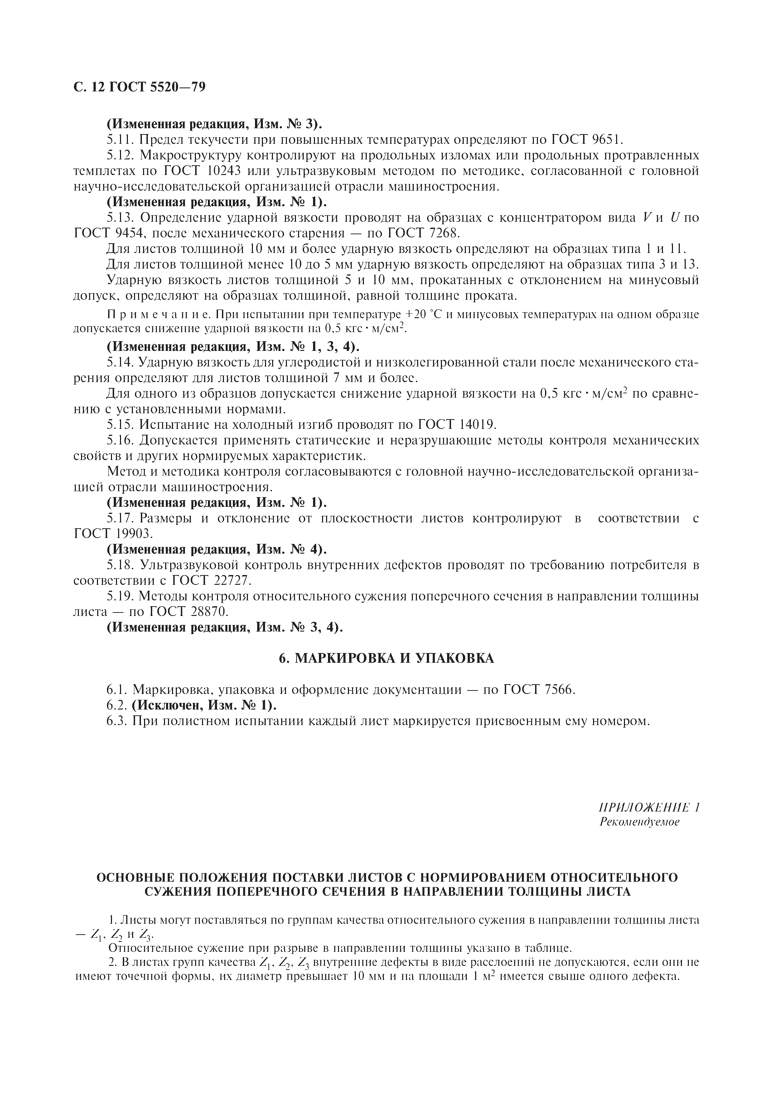 | | Список изменений: | | | Заменяет собой: | ГОСТ 5520-69 «Сталь листовая углеродистая и низколегированная для котлостроения и сосудов, работающих под давлением. Технические требования» | | Нормативные ссылки: |   ГОСТ 1497-84 «Металлы. Методы испытаний на растяжение»  ГОСТ 7564-97 «Прокат. Общие правила отбора проб, заготовок и образцов для механических и технологических испытаний»  ГОСТ 7566-94 «Металлопродукция. Приемка, маркировка, упаковка, транспортирование и хранение»  ГОСТ 9651-84 «Металлы. Методы испытаний на растяжение при повышенных температурах»  ГОСТ 14019-80 «Металлы. Методы испытания на изгиб»  ГОСТ 19903-74 «Прокат листовой горячекатаный. Сортамент»  ГОСТ 28870-90 «Сталь. Методы испытания на растяжение толстолистового проката в направлении толщины» ГОСТ 10243-75 «Сталь. Методы испытаний и оценки макроструктуры»  ГОСТ 9454-78 «Металлы. Метод испытания на ударный изгиб при пониженных, комнатной и повышенных температурах»  ГОСТ 12345-2001 «Стали легированные и высоколегированные. Методы определения серы»  ГОСТ 28473-90 «Чугун, сталь, ферросплавы, хром, марганец металлические. Общие требования к методам анализа»  ГОСТ 22536.0-87 «Сталь углеродистая и чугун нелегированный. Общие требования к методам анализа»  ГОСТ 22536.2-87 «Сталь углеродистая и чугун нелегированный. Методы определения серы»  ГОСТ 22536.5-87 «Сталь углеродистая и чугун нелегированный. Методы определения марганца»  ГОСТ 22536.1-88 «Сталь углеродистая и чугун нелегированный. Методы определения общего углерода и графита»  ГОСТ 22536.3-88 «Сталь углеродистая и чугун нелегированный. Методы определения фосфора»  ГОСТ 22536.4-88 «Сталь углеродистая и чугун нелегированный. Методы определения кремния»  ГОСТ 22727-88 «Прокат листовой. Методы ультразвукового контроля» ГОСТ 12344-88 «Стали легированные и высоколегированные. Методы определения углерода»  ГОСТ 12346-78 «Стали легированные и высоколегированные. Методы определения кремния»  ГОСТ 12347-77 «Стали легированные и высоколегированные. Методы определения фосфора»  ГОСТ 12348-78 «Стали легированные и высоколегированные. Методы определения марганца»  ГОСТ 12349-83 «Стали легированные и высоколегированные. Методы определения вольфрама»  ГОСТ 12350-78 «Стали легированные и высоколегированные. Методы определения хрома» ГОСТ 12351-81 «Стали легированные и высоколегированные. Методы определения ванадия»  ГОСТ 12352-81 «Стали легированные и высоколегированные. Методы определения никеля»  ГОСТ 12354-81 «Стали легированные и высоколегированные. Методы определения молибдена»  ГОСТ 12355-78 «Стали легированные и высоколегированные. Методы определения меди»  ГОСТ 12356-81 «Стали легированные и высоколегированные. Методы определения титана»  ГОСТ 12359-99 «Стали углеродистые, легированные и высоколегированные. Методы определения азота»  ГОСТ 18895-97 «Сталь. Метод фотоэлектрического спектрального анализа»  ГОСТ 7268-82 «Сталь. Метод определения склонности к механическому старению по испытанию на ударный изгиб»  ГОСТ 7565-81 «Чугун, сталь и сплавы. Метод отбора проб для определения химического состава»  ГОСТ 12358-2002 «Стали легированные и высоколегированные. Методы определения мышьяка»  ГОСТ 12361-2002 «Стали легированные и высоколегированные. Методы определения ниобия»
