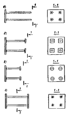 а - без усилений; б - с анкерными пластинами; в - с высаженными головками; г - с двумя пластинами (типа «закрытый столик»)
