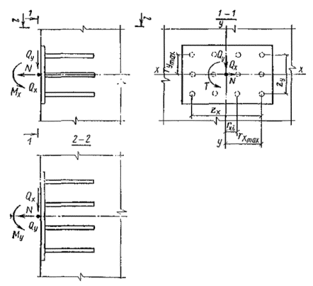 Qx и Qy - сдвигающие силы, действующие соответственно вдоль осей х и у, находящихся в плоскости наружной грани пластины и проходящих через центр тяжести нормальных анкеров в направлении осей ее симметрии;