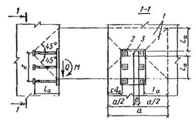 4.1. Расчет анкерных стержней, приваренных втавр к плоским элементам стальных закладных деталей, на действие изгибающего момента, нормальной и сдвигающей сил, действующих в одной плоскости симметрии закладной детали (рис. 5, а), следует производить по формуле