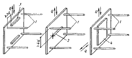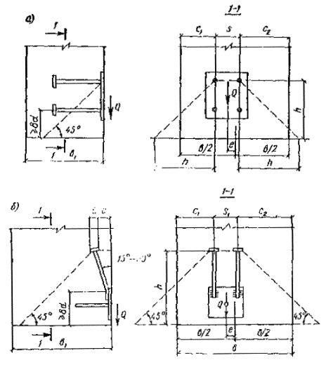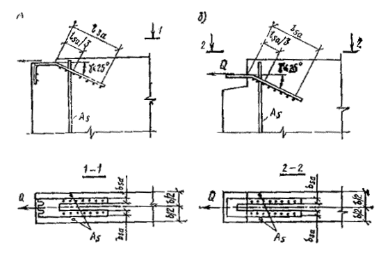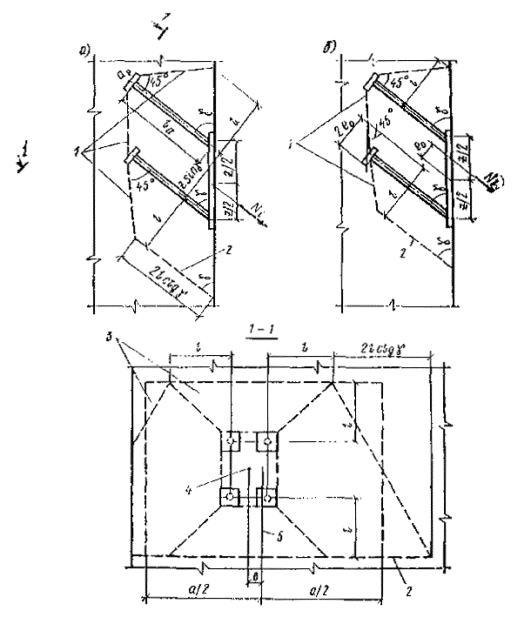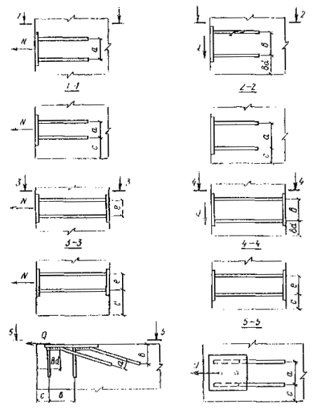 2.2. Закладные детали, изображенные на рис. 2, а-в, следует применять при действии на деталь сдвигающей силы или при одновременном воздействии сдвигающей и отрывающей сил, когда Q>N. Их применение наиболее целесообразно в тех случаях, когда нормальные анкеры находятся на таком расстоянии от края элемента, что может произойти откол бетона. Деталь, изображенную на рис. 2, в, применяют при знакопеременной нагрузке, а деталь, изображенную на рис. 2, г, - при действии отрывающей и сдвигающей сил, когда Qan>Nan/tg g.