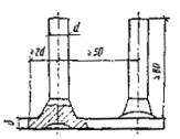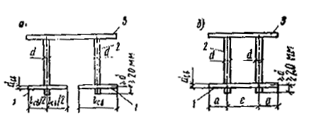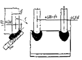 2.1. Сварные закладные детали состоят в основном из пластин с приваренными к ним анкерными стержнями. В зависимости от характера действующих на деталь усилий, места расположения и удобства установки ее в арматурный каркас применяют детали с нормальными анкерами из арматурной стали, приваренными втавр (рис. 1), наклонными, приваренными внахлестку, и нормальными (рис. 2, а-в), или только наклонными, приваренными под слоем флюса (рис. 2, г).