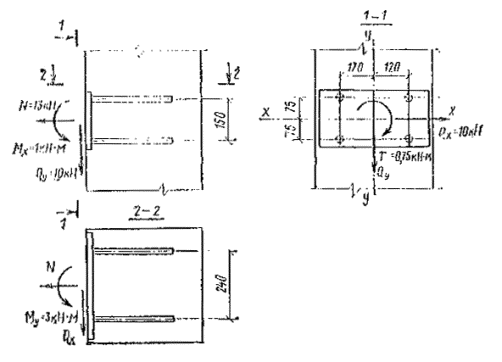 Пример 12. Исходные данные те же, что и в примере 11. При этом к штампованной закладной детали приложено усилие Q с эксцентриситетом е0 = 15 мм (рис. 35, б).