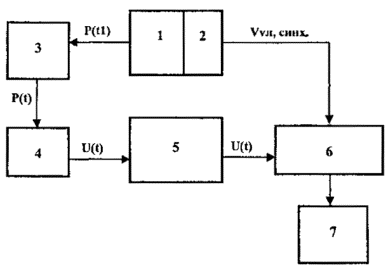 1 - нагружающее устройство; 2 - датчик измерения скорости нагружения и синхронизации; 3 - образец с системой крепления; 4 - датчик силы; 5 - коммутационно - усилительный блок; 6 - аналогово-цифровой преобразователь (АЦП); 7 - компьютер