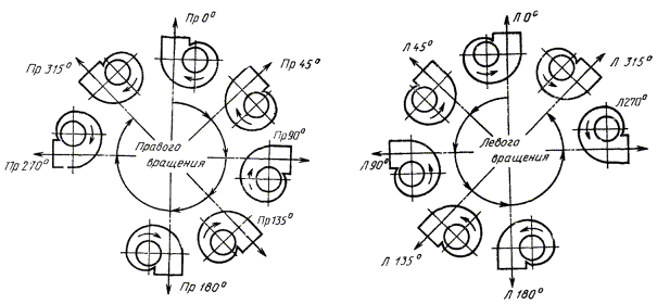 1.13. Положения спирального корпуса радиального вентилятора определяют углом поворота относительно исходного нулевого положения. Углы поворота корпуса отсчитывают по направлению вращения рабочего колеса в соответствии с черт. 6.