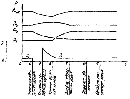 1.13. В момент Тб подается напряжение на электродвигатель резервного насоса. Ток пусковой этого электродвигателя мгновенно возрастает до своего максимального значения. Начинается первая фаза разгона насосного агрегата Тбв. Частота вращения электродвигателя возрастает, но насос не оказывает влияния на работу станции. В момент Тв у двигателя частота вращения такая, чтобы пускаемый насос развил давление, достаточное, чтобы закрыть обратный клапан. После закрытия обратного клапана резервный насосный агрегат включается в работу станции, давление Pн1 увеличивается до установившегося.