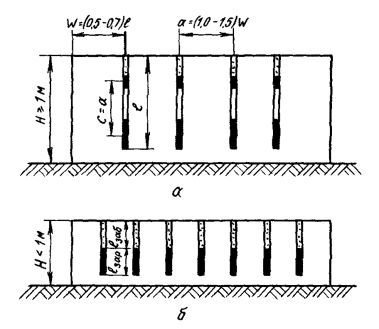 Расстояние между шпуровыми зарядами в ряду принимается в пределах (1,0 - 1,5) W, а между рядами зарядов (0,85 - 1,0) W.