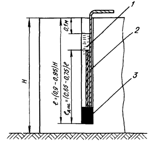 2.3. Значение ЛНС принимают в пределах 0,5 - 0,7 длины шпура. При дроблении фундаментов высотой более 1 м, а также если W составляет менее половины длины шпура, заряд в шпуре следует рассредоточить, рассчитывая каждую часть заряда на свою ЛНС. Расстояние между центрами зарядов, рассредоточенных в одном шпуре, следует принимать равным расстоянию между шпурами, кроме верхнего промежутка, который может быть короче остальных вследствие уменьшения массы верхнего заряда. Промежутки между зарядами можно оставлять свободными от забойки (воздушный промежуток) или заполнять забоечным материалом. Верхняя свободная от заряда часть шпура должна быть обязательно заполнена забоечным материалом (рис. 1).