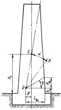Угол вруба β (см. рис. 3) определяется минимально необходимым углом наклона сооружения a, при котором проекция центра тяжести сооружения на плоскость горизонтального сечения на уровне вруба выйдет за контур сечения (т.е. будет обеспечено условие опрокидывания сооружения).