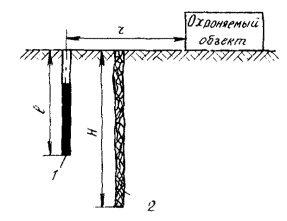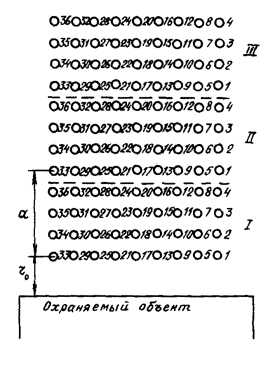 14.3. В тех случаях, когда место взрыва расположено вблизи охраняемого объекта и допустимая масса заряда по сейсмическому действию взрыва позволяет взрывать в одной группе по одному скважинному или шпуровому заряду, используют схемы поскважинного замедления (рис. 15) или специальные схемы замедления, например, порядно-поскважинную (см. рис. 9). При взрывании по этой схеме интервал замедления между соседними шпурами в ряду и между шпурами соседних рядов смежных блоков определяют исходя из необходимости обеспечить безопасность по подбою с учетом конкретных параметров взрывания (диаметр шпура, длина забойки, сетка шпуров и т.д.). Соответствующие шпуры в разных блоках (на рис. 9 они обозначены одинаковыми цифрами) взрывают в одной ступени замедления. Расстояние между одновременно взрываемыми шпурами в смежных блоках (или, что то же, ширина блока) определяется из условия (48). При расположении охраняемого объекта на фланге цепочки зарядов, коэффициент, зависящий от условий расположения охраняемого объекта относительно линии зарядов, принимают равным 0,65, при его расположении параллельно цепочке зарядов принимаем равным 1,5.