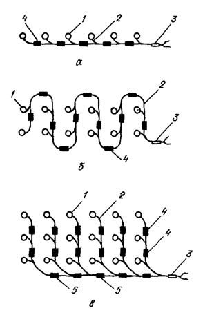 а - однорядное расположение зарядов; б - то же двурядное; в - то же трехрядное; 1 - скважины (шпуры); 2 - ДШ; 3 - ЭД; 4 - КЗДШ - 10 мс; 5 - КЗДШ - 35 мс