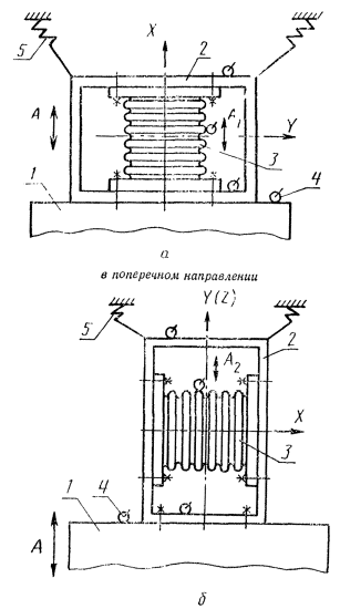 1 - стол вибропреобразователя; 2 - жесткая оснастка; 3 - компенсатор сильфонный; 4 - датчики-акселерометры; 5 - устройство статический разгрузки подвижной системы вибровозбудителя; А - амплитуда перемещения стола вибровозбудителя стенда; А1, А2 - амплитуды виброперемещений элементов гофров сильфона
