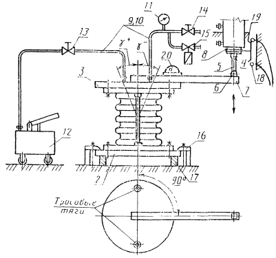 1 - компенсатор сильфонный; 2 - заглушка нижняя; 3 - заглушка верхняя; 4 - шток гидроцилиндра; 5 - шарнир; 6 - вилка; 7 - переходник; 8 - привод; 9, 10 - шланг гибкий; 11 - манометр; 12 - насос; 13, 14 - клапан запорный; 15 - клапан предохранительный; 16 - прижим; 17 - подставка; 18 - выключатель конечный; 19 - планка нажимная; 20 - квадрант оптический
