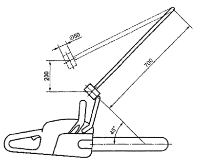 6.2 Плавно приложить усилие к защитному устройству передней рукоятки под углом 45° в направлении вперед и вниз от центра верхней (горизонтальной) части защитного устройства относительно осевой линии шины в соответствии с рисунком 2.