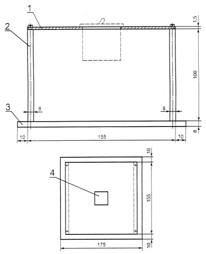 Когда требуется (например, в течение операции О), прозрачную полиэтиленовую пленку толщиной (0,05 ± 0,01) мм размерами по крайней мере на 50 мм больше в каждом направлении фронтальной части аппарата, но не менее чем 200´200 мм, закрепляют в рамке, помещенной на расстоянии 10 мм от: