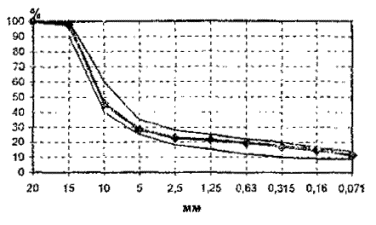 3.6. В применяемом щебне основную часть должна составлять крупная фракция. Минеральную часть подбирают таким образом, чтобы кривая зернового состава расположилась в зоне, ограниченной предельными кривыми, и была плавной. Подбор состава смеси осуществляют с помощью компьютерной программы или вручную.