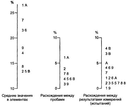 b) Основной метод требует подготовки ряда идентичных проб материала для использования в эксперименте. С гетерогенными материалами это может быть невозможно, так как применение основного метода потом дает оценки стандартного отклонения воспроизводимости, которые искажаются различием между пробами. Схема для гетерогенного материала, приведенная в ИСО 5725-5, дает информацию о неоднородности проб, которая не выявляется основным методом; она может быть использована для расчетов оценки воспроизводимости, из которой исключена разница между пробами.