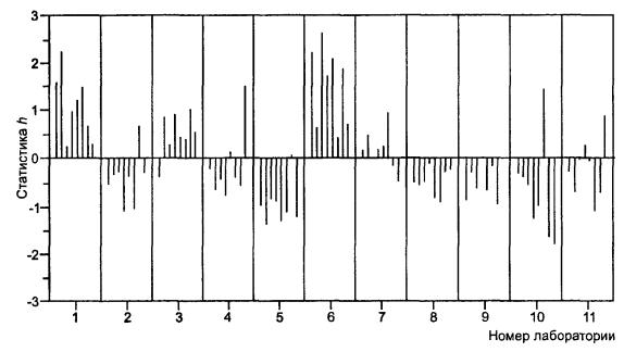 c) Основной метод требует проверок на наличие выбросов, чтобы идентифицировать данные, которые должны быть исключены из расчета стандартных отклонений повторяемости и воспроизводимости. Исключение выбросов может иногда значительно повлиять на оценку стандартных отклонений повторяемости и воспроизводимости; но на практике в случаях, когда применяют контроль выбросов, у аналитика есть основание принять решение, какие данные исключить. ИСО 5725-5 описывает робастные методы анализа данных, которые могут применяться для расчета стандартных отклонений повторяемости и воспроизводимости из данных, содержащих выбросы, без применения проверок на наличие выбросов в целях исключения таких данных, так что эти результаты больше не влияют на решение аналитика.