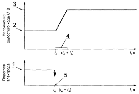 Если напряжение холостого хода начинает повышаться с момента времени te, то время ts не должно превышать 100 мс, если подогрев электродов завершается в момент времени te.