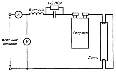 Стартеры, предназначенные для ламп мощностью до 80 Вт включ., испытывают по схеме, приведенной на рисунке 9.