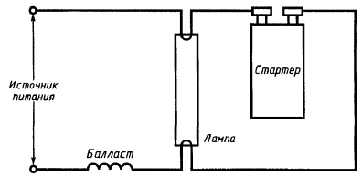 Стартеры для ламп мощностью 100 и 125 Вт испытывают по схеме, приведенной на рисунке 10. Применяют лампу мощностью 125 Вт и балласт емкостного типа той же мощности.