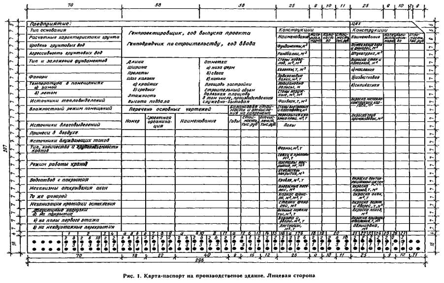 При планировании работ по эксплуатации и ремонту зданий все карты производственных зданий предприятия (или части их) вынимаются из ячеек картотеки и раскладываются на столе лицевой стороной таким образом, чтобы были видны только обе правые крайние таблицы («Конструкции»). Затем, не сдвигая карты относительно друг друга, они переворачиваются на оборотные стороны. При этом на всех выступающих краях оборотной стороны можно видеть номенклатуру работ, подлежащих выполнению, их плановую стоимость и степень опасности выявленных дефектов и повреждений. Используя сведения оборотной стороны и вновь перевернув карты (не сдвигая их относительно друг друга) на лицевую сторону, по таблицам «Конструкции» можно определить примерные объемы работ в натуральных показателях и расход материалов.