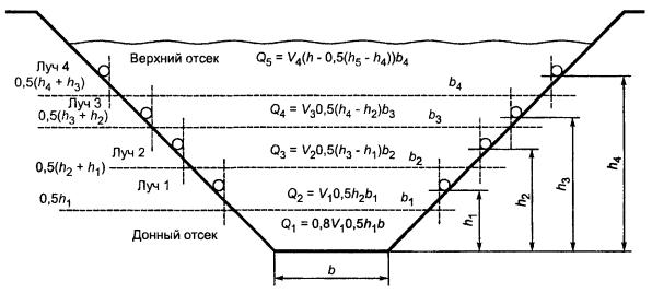 Высотой отсека является разность отметок высот верхнего луча и водной поверхности. Расход через самый нижний отсек, ближайший к дну, вычисляют по такому же принципу.