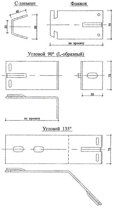3.3.1. Кронштейны - это элементы, которые с помощью дюбелей и анкерных болтов крепят несущий каркас к основанию. Они (рис. 3.5) выпускаются 2-х типов: «L»-образные и «С»-образные с флажком. Последние обладают меньшей площадью контакта с основанием и их применяют в случаях, когда важно сократить теплопотери. Кроме того, есть еще 2 типа кронштейнов, которые применяют на углах здания. Кронштейны изготавливают из алюминиевого сплава АМг2М или АМг2Н по ГОСТ 4784-97 с покрытием ЛКМ толщиной 60 - 120 мкм или без него, их толщина 4 мм. Для обеспечения возможности устройства систем разной толщины «L»-образные кронштейны и флажки выпускаются различных длин, «L»-образные кронштейны от 85 до 225 мм, а флажки от 85 до 185 мм.